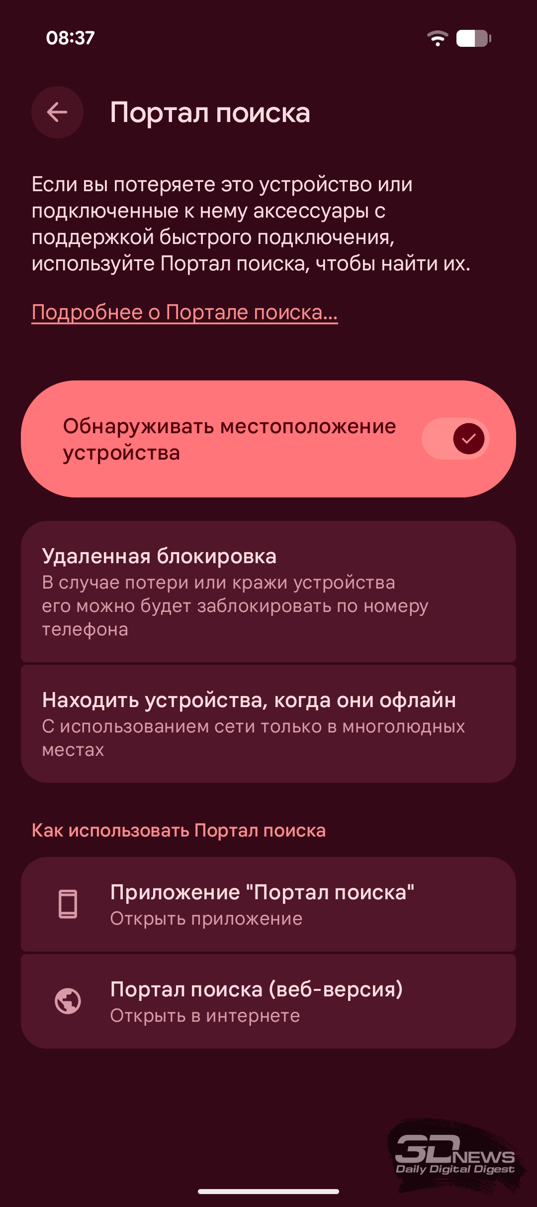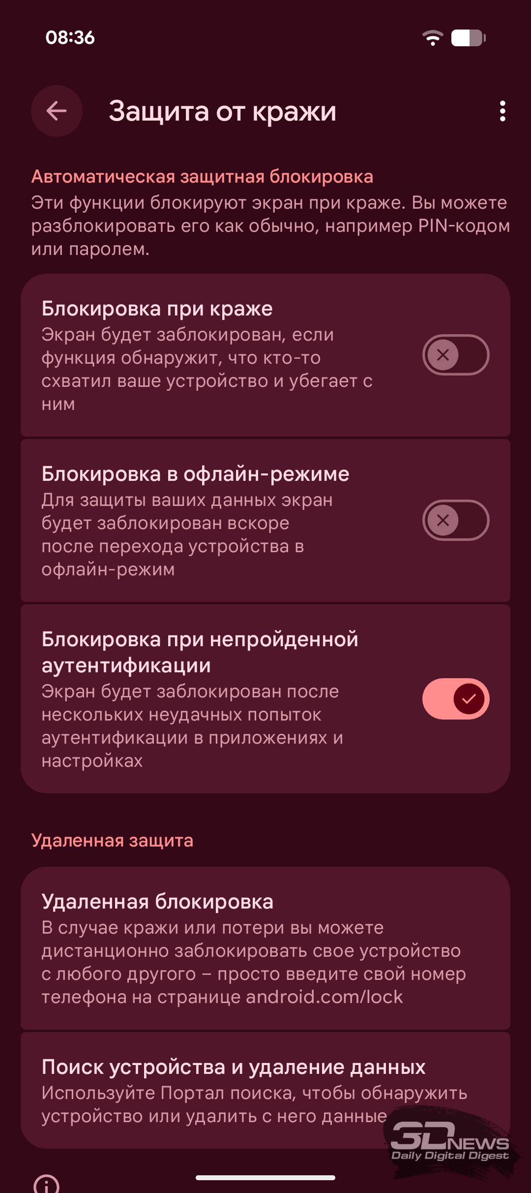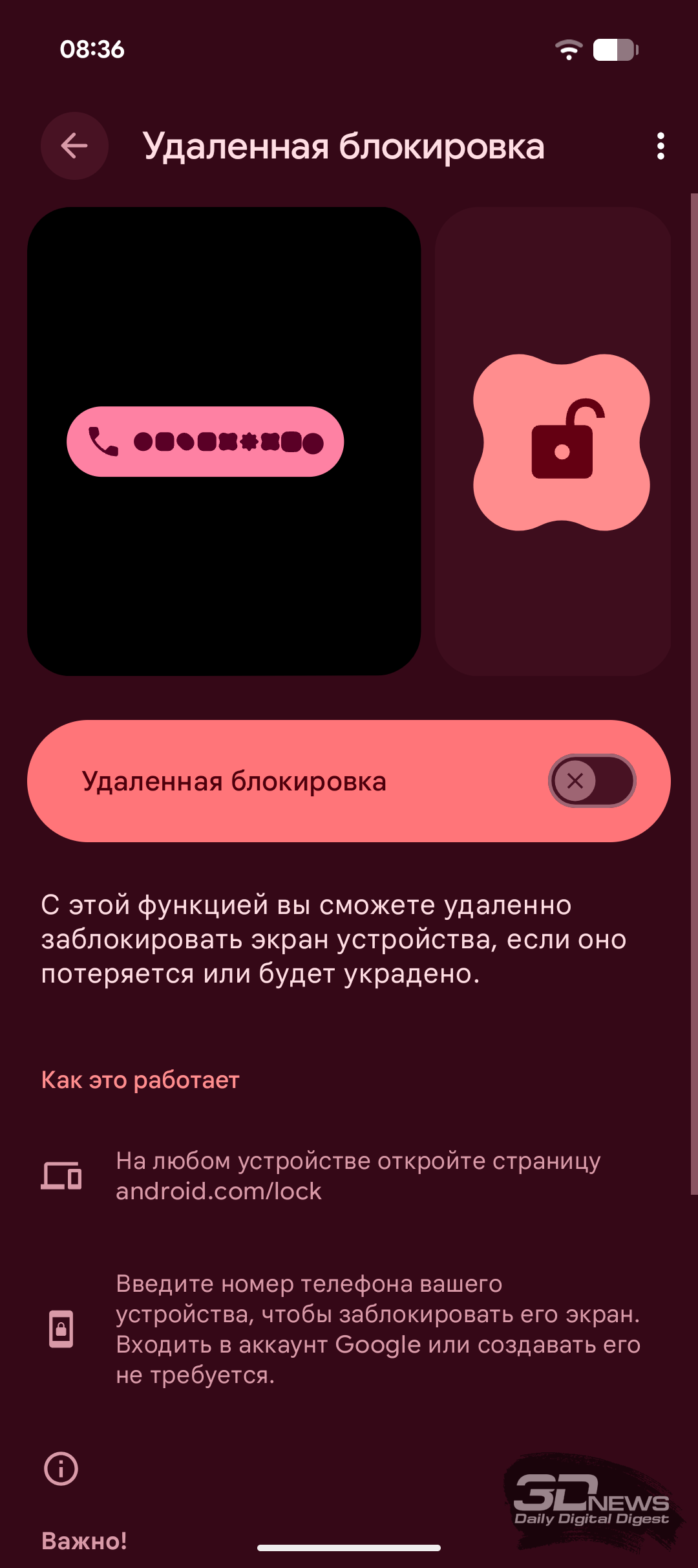 Замечу, что по умолчанию активирована только последняя настройка — остальные нужно включить самостоятельно. Заодно можно настроить удалённую блокировку, позволяющую вручную заблокировать устройство при потере или краже, а также функцию поиска устройства.