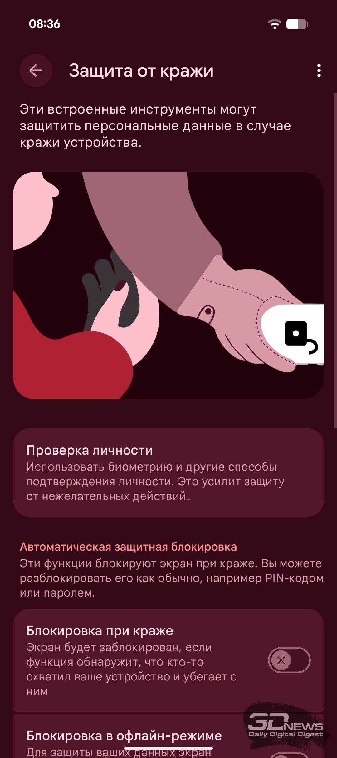 • «Блокировка при краже» заблокирует устройство, если датчики смартфона почувствуют, что его кто-то схватил и убегает.