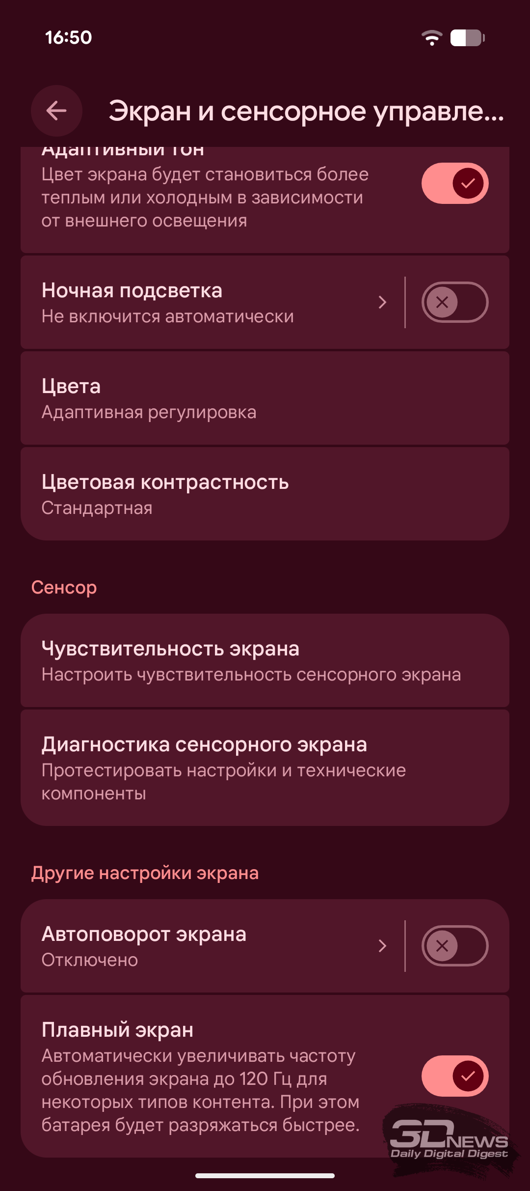 Настройки частоты обновления дисплея здесь довольно ограниченны. По умолчанию экран работает с частотой 60 Гц, а получить 120 Гц можно только с помощью режима «Плавный экран», в котором дисплей автоматически переключается между 60 и 120 Гц (других значений замечено не было). А вот заставить экран постоянно выдавать 120 Гц не получится. В играх смартфон ведёт себя непостоянно: где-то обеспечивает заветную максимальную частоту, а где-то предпочитает базовые 60 Гц. При обычном же использовании экран чаще работает именно на 120 Гц, что выглядит избыточным.