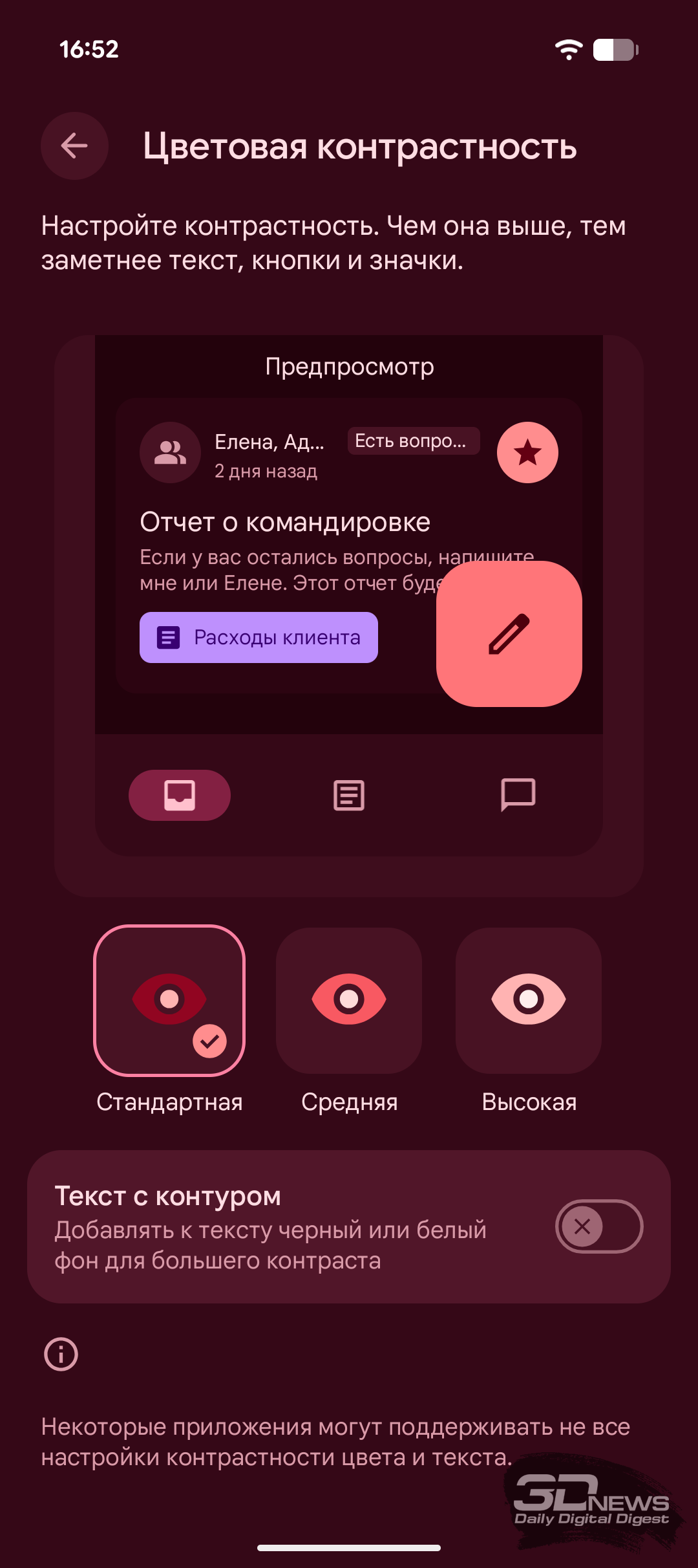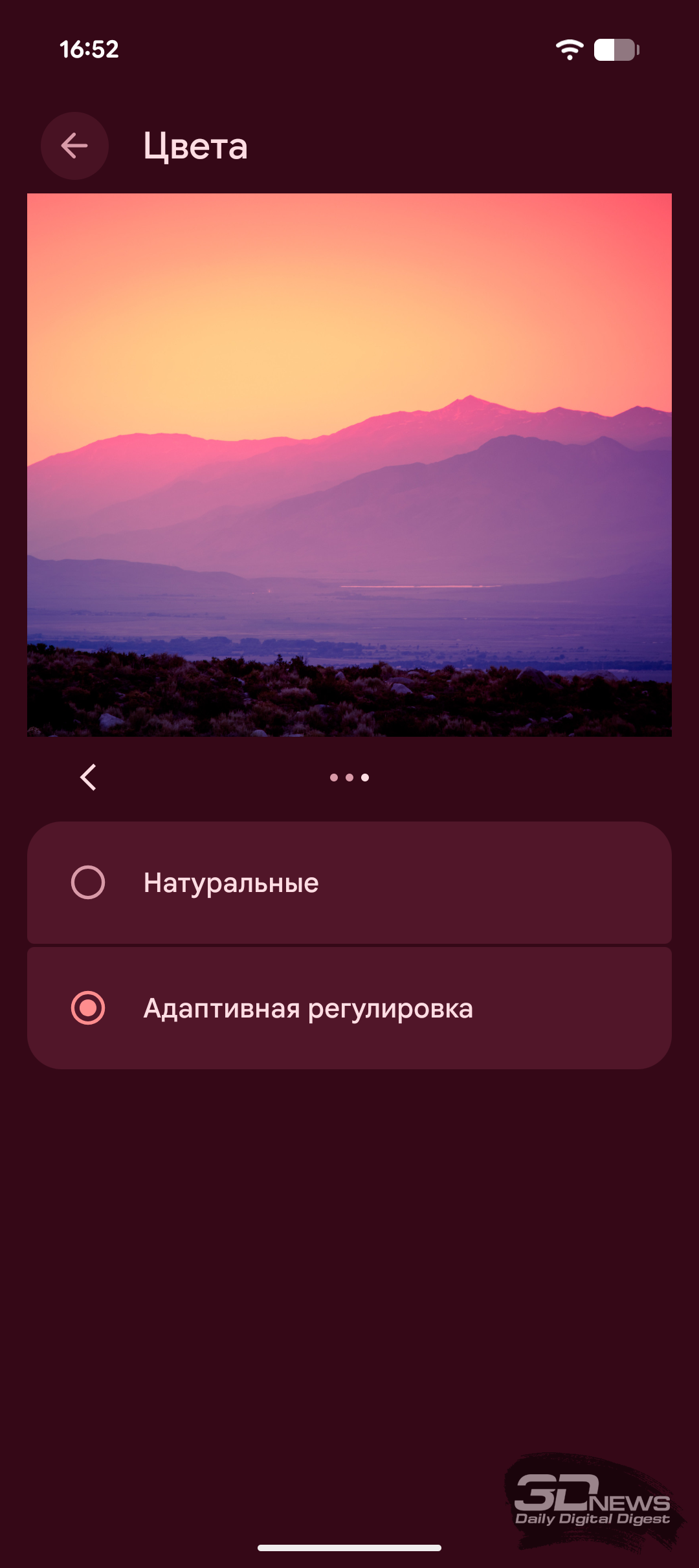 Появилась настройка «Адаптивный тон», которая подстраивает цветовую температуру экрана под окружающее освещение. Есть также берегущий зрение режим с тёплыми цветами («Ночная подсветка»). Можно отрегулировать цветопередачу, выбрав адаптивный режим, который подстраивается под отображаемый на экране контент, или режим с натуральными цветами. Также можно отрегулировать контрастность, дополнительно добавив фон для текста, что сделает его более контрастным.