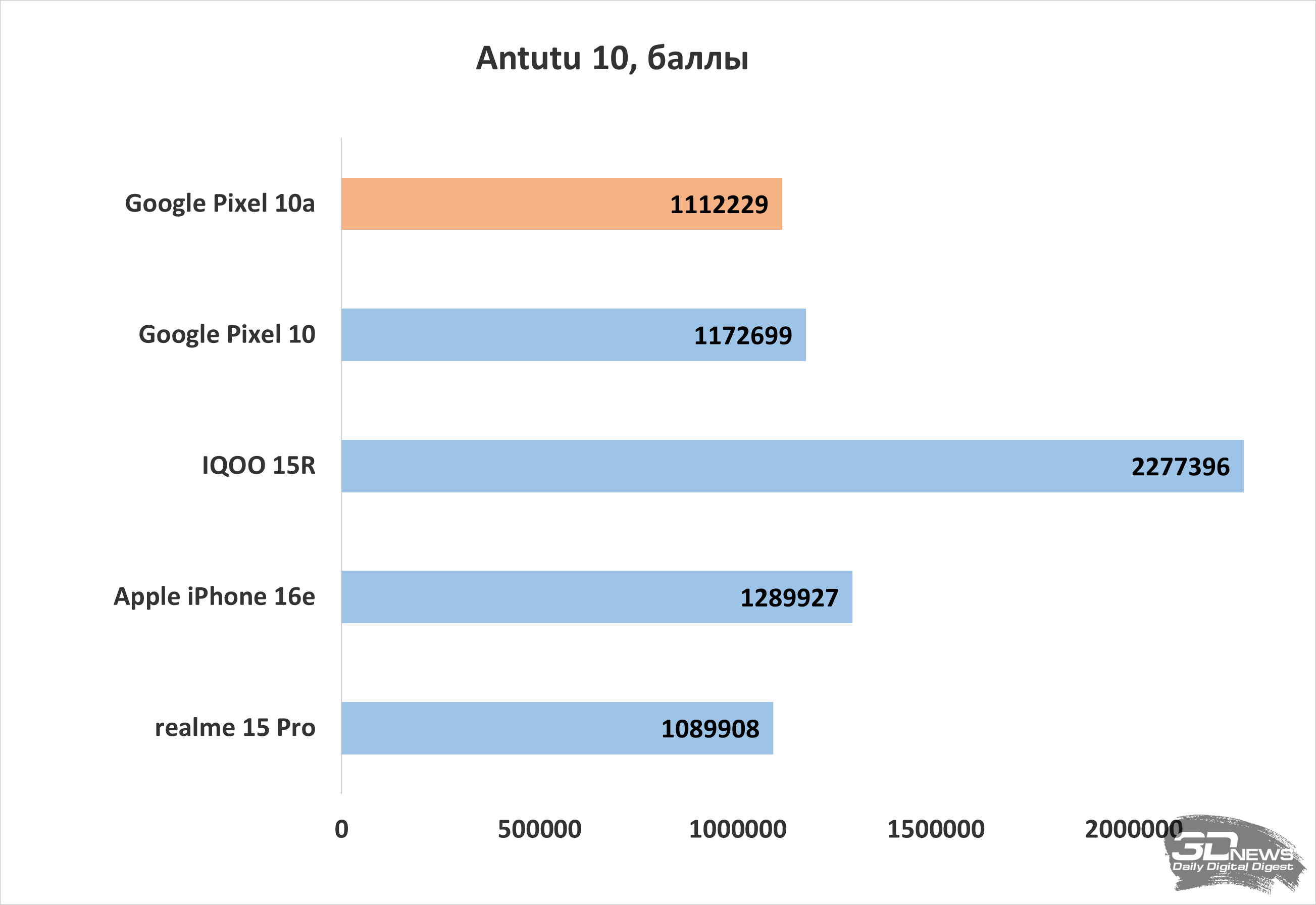В целом улучшения по части быстродействия позволили Pixel 10a в тестах почти догнать Pixel 10. Если же сравнивать с конкурентами, то Pixel 10a показывает результаты несколько выше смартфонов среднего ценового сегмента, таких как realme 15 Pro на базе Qualcomm Snapdragon 7 Gen 4, но до современных субфлагманов, например iQOO 15R на чипе Snapdragon 8 Gen 5, новинка уже сильно не дотягивает. И в этом заключается основная проблема, поскольку по цене новый Pixel ближе как раз к субфлагманам.