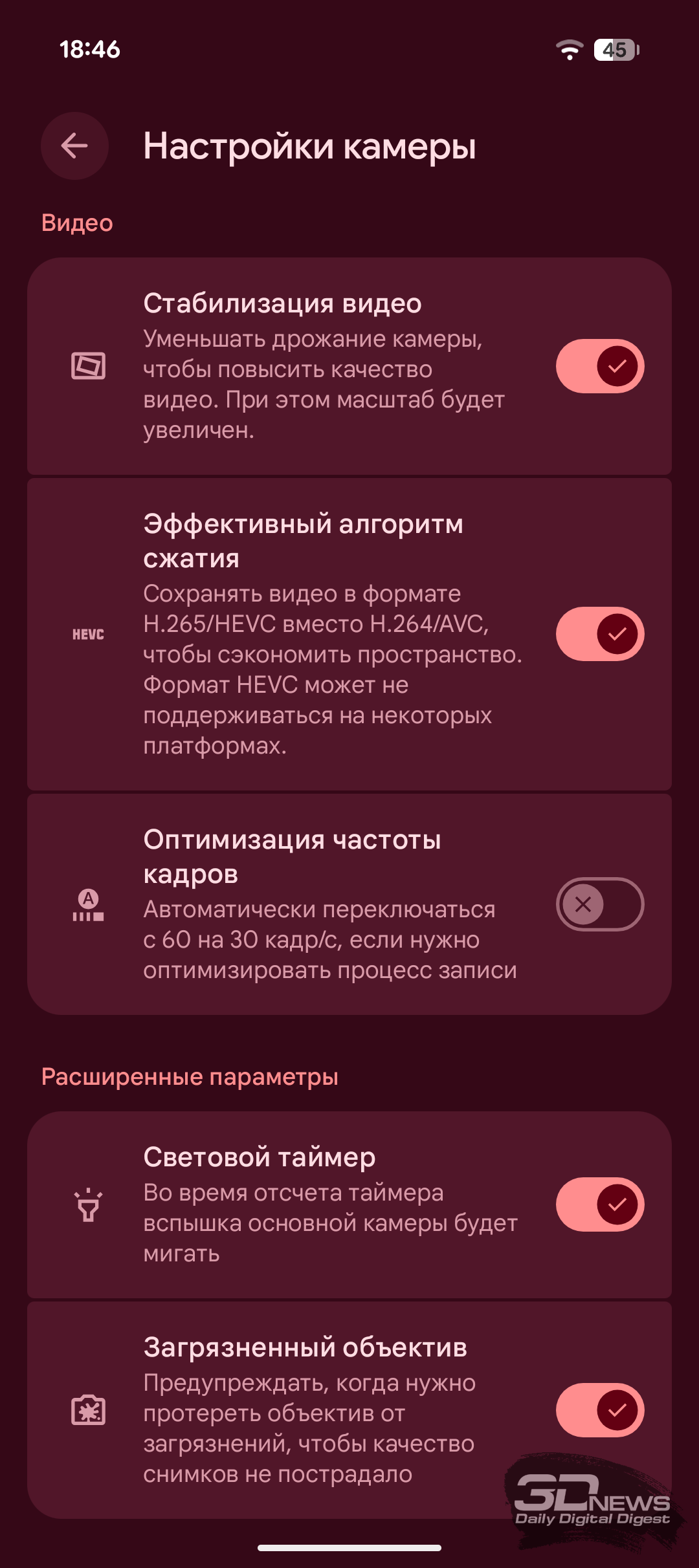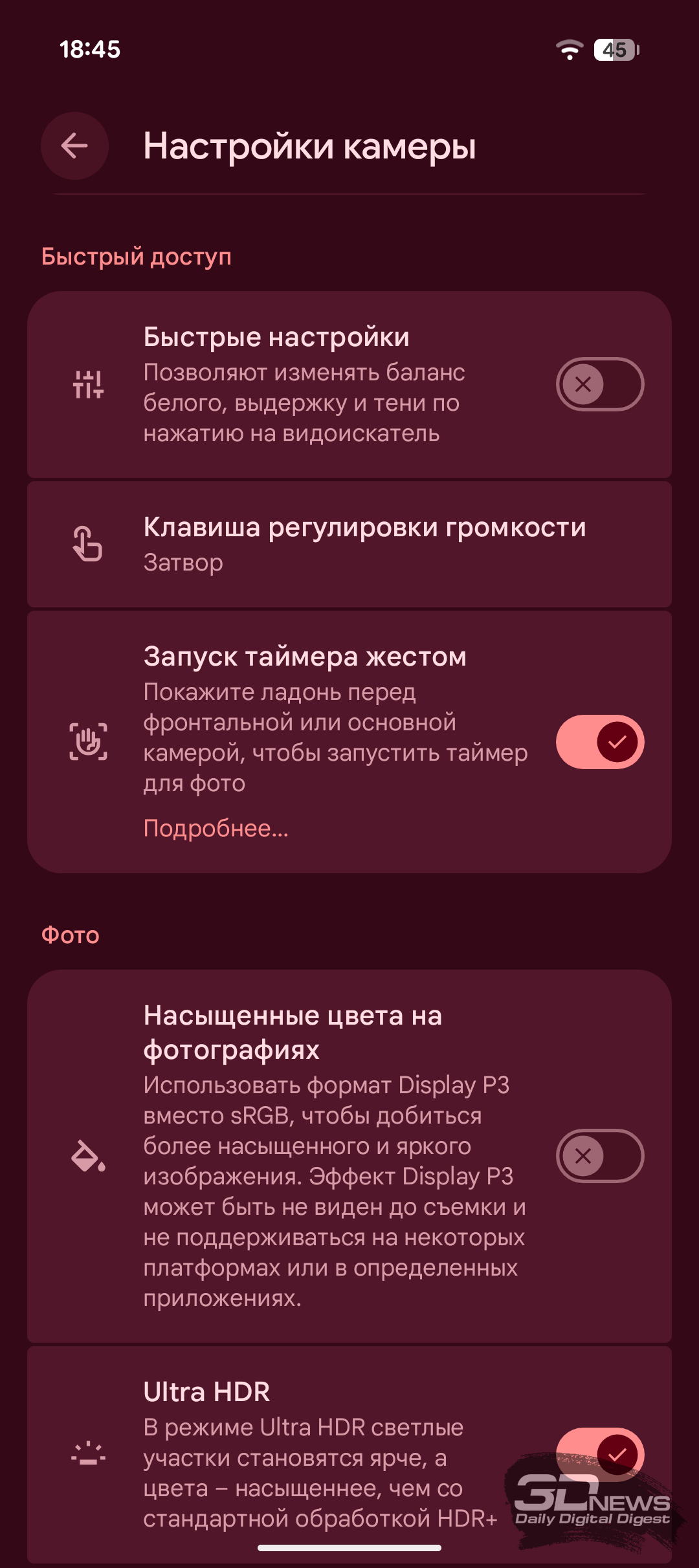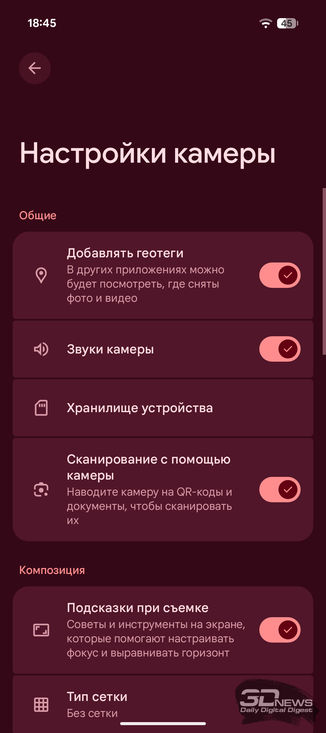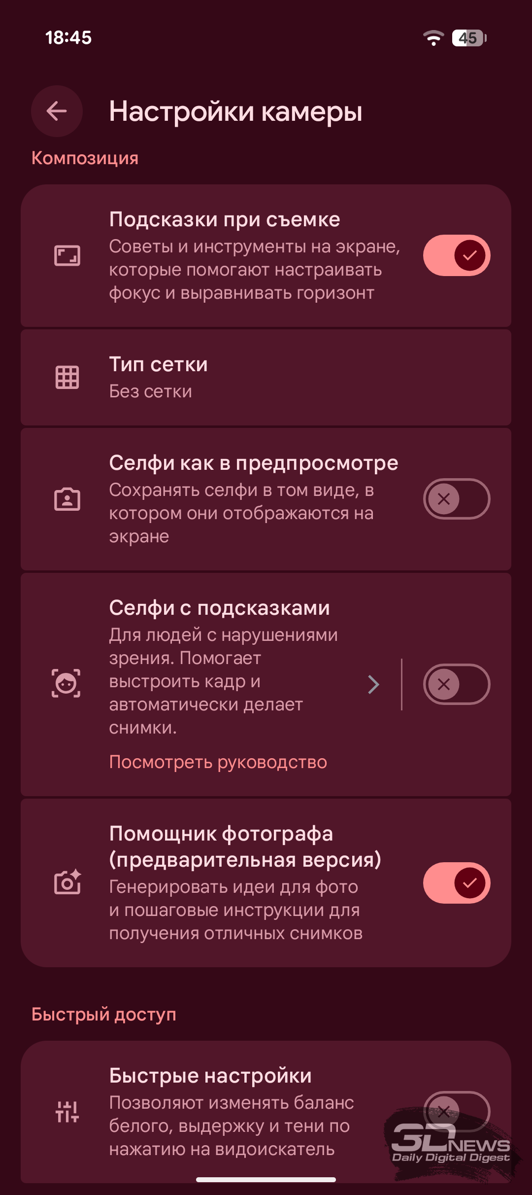 Само по себе приложение камеры у Pixel 10a по-прежнему оформлено очень минималистично, и даже базовые настройки спрятаны во всплывающем меню. Профессиональный режим с ручным управлением параметрами съёмки по-прежнему остаётся уделом Pixel Pro, но его отсутствие в новинке отчасти компенсирует всплывающее окно с настройками теней, экспозиции и баланса белого. Приложение камеры у Pixel 10a предлагает большое разнообразие режимов как для фото-, так и для видео. На месте и система подробных подсказок. А полное меню настроек камеры поражает своим разнообразием — в переключателях можно потеряться, но заядлым любителям поснимать на смартфон должно понравиться.