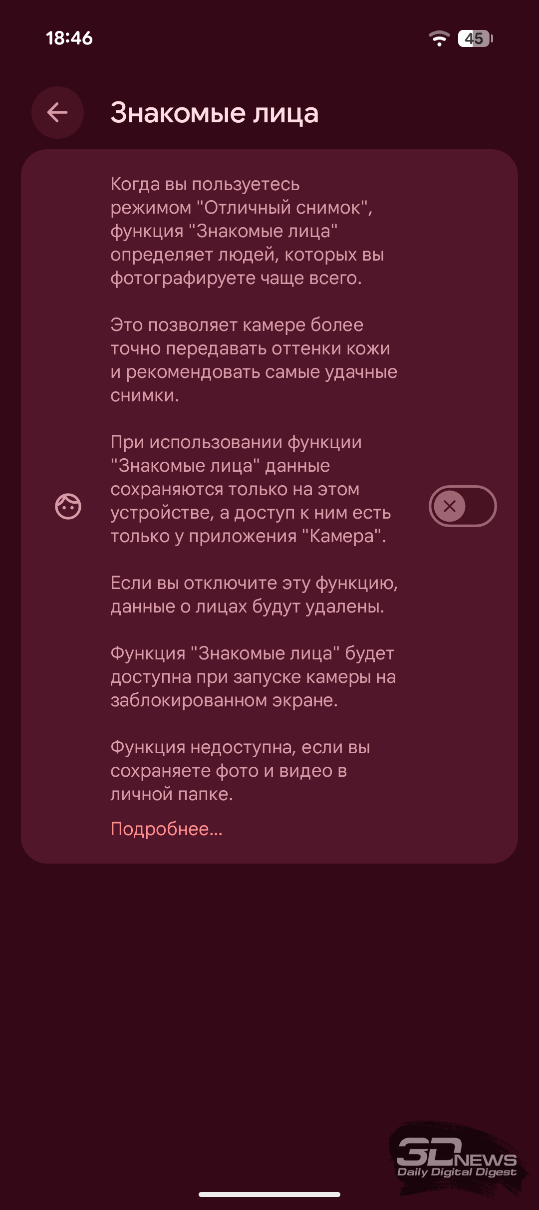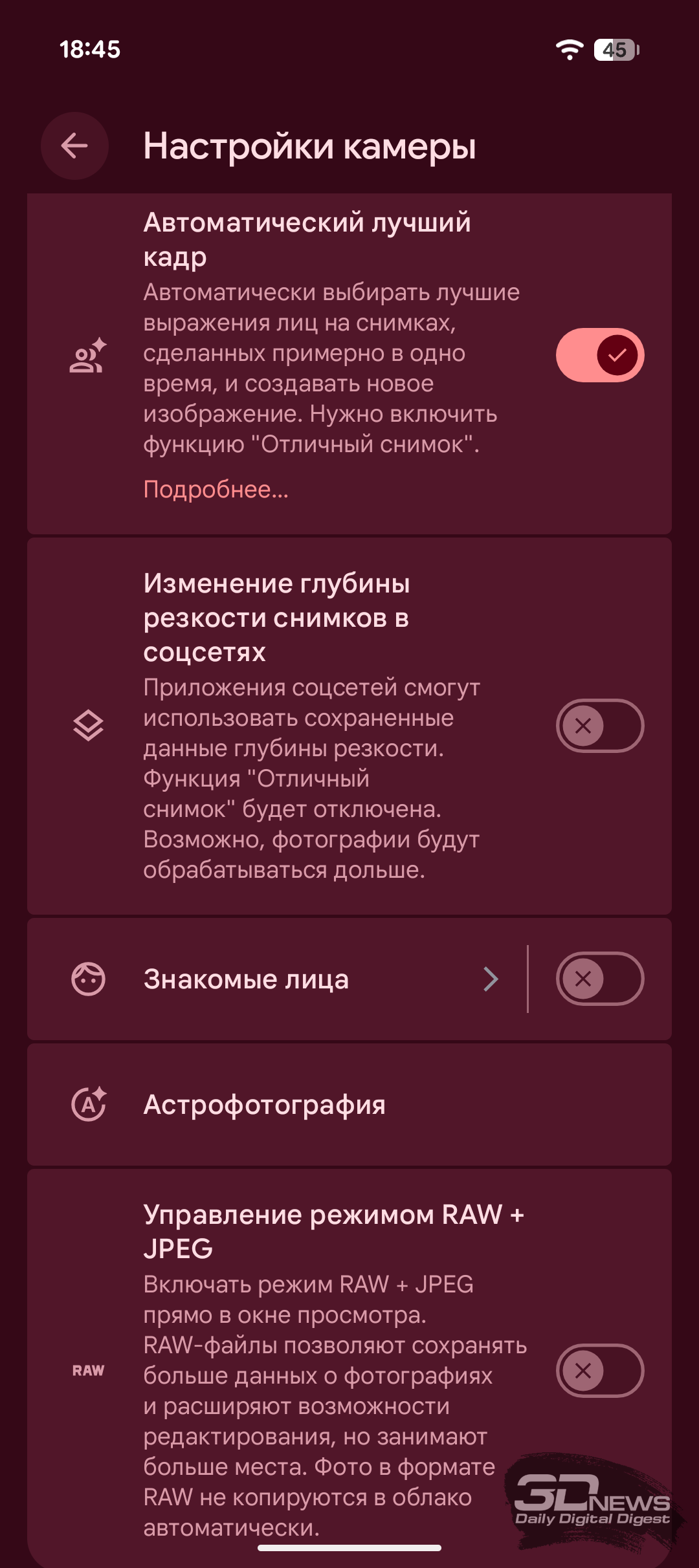 Приложение камеры у Pixel 10a почти не изменилось, хотя получило ряд функций, которые были у флагманских «Пикселей», но отсутствовали у моделей A-серии. Так, функция «Автоматический лучший кадр» будет полезна для групповых портретов — алгоритм выберет снимок из серии, где все лица выглядят лучше всего, а если идеального фото не найдётся, то он соберёт его сам из разных кадров, подставив наиболее удачные портреты. О функции «Помощник фотографа», которую можно кратко описать как ИИ-учителя по фотографии, мы подробно рассказывали в обзоре Pixel 10. Наконец, на Pixel 10a теперь можно снимать не только в цветовом пространстве sRGB, но и в Display P3, которое обеспечивает более яркие и насыщенные кадры.