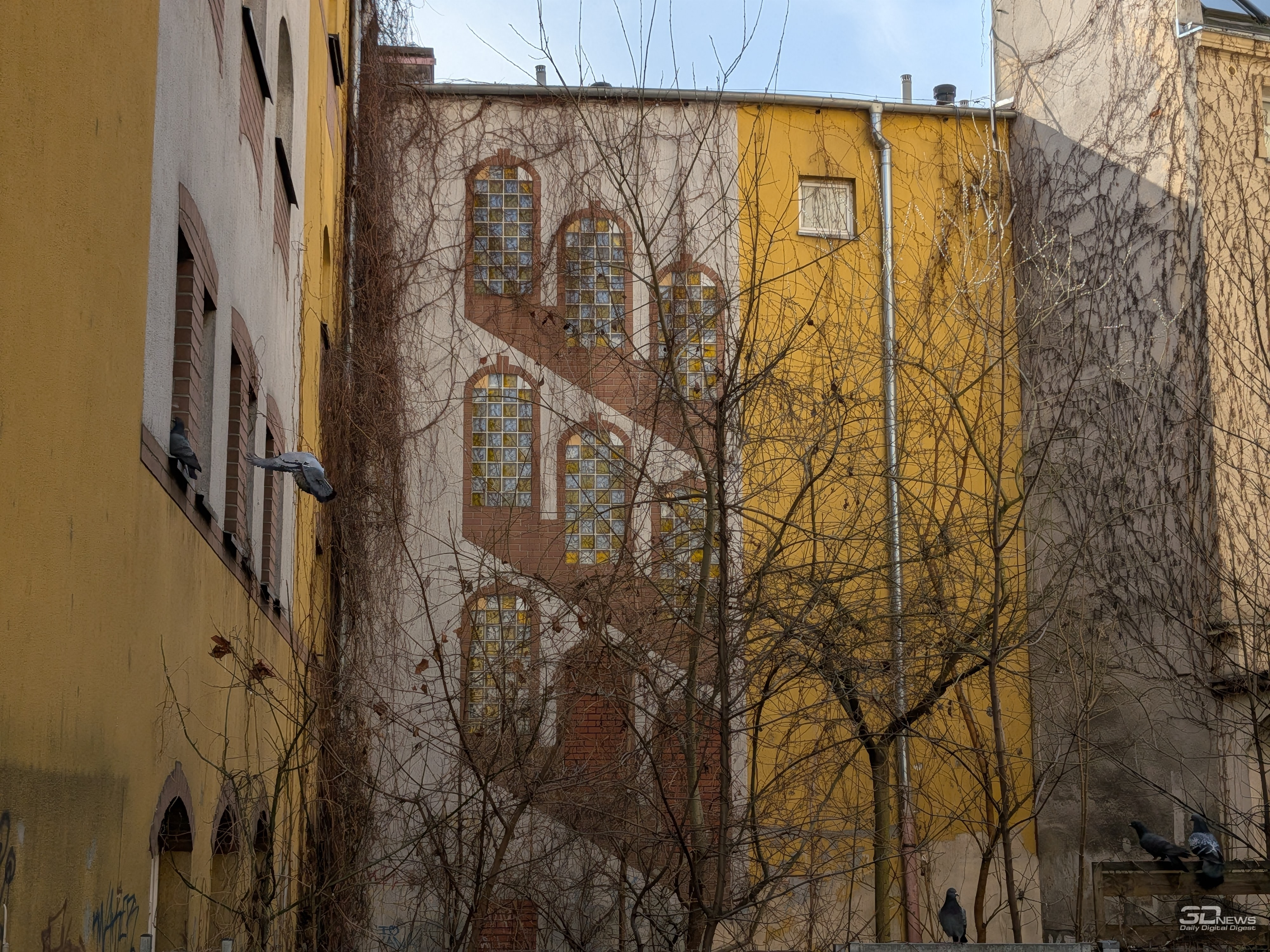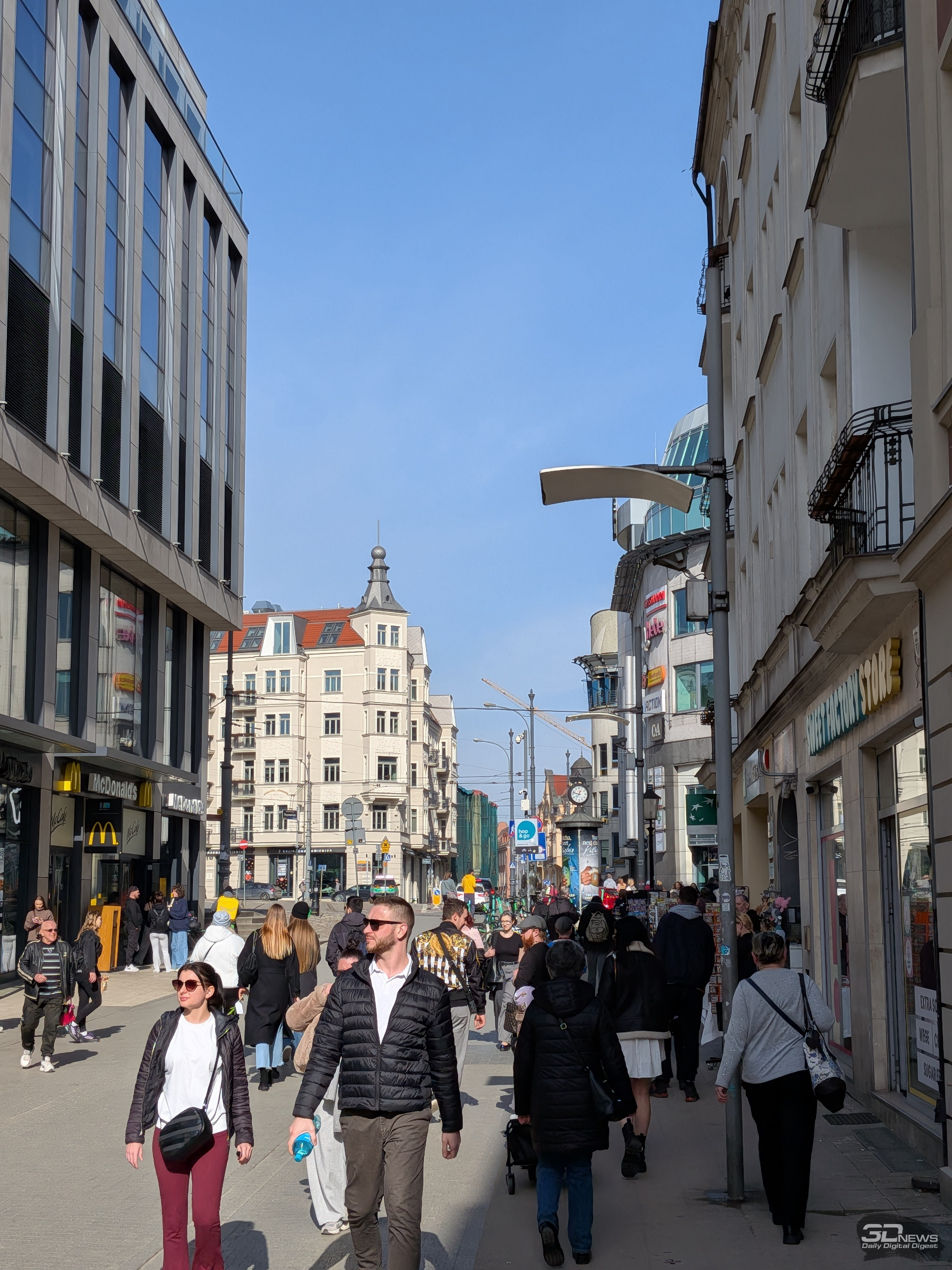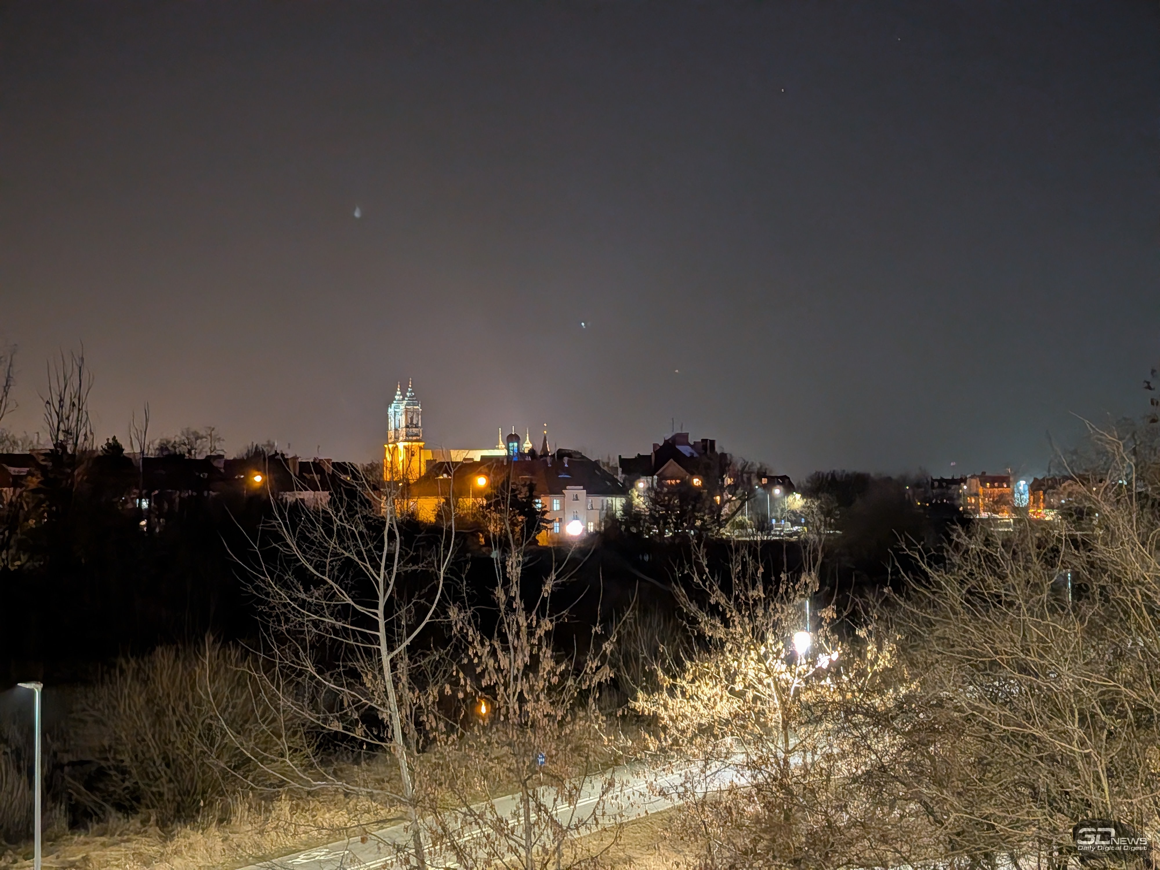 Вышесказанное в основном справедливо и для двукратного гибридного зума: днём снимки сохраняют адекватную цветопередачу и широкий динамический диапазон, но при ближайшем рассмотрении заметна просадка в детализации, а также отдельные кадры могут слегка перебарщивать с контурной резкостью. В свою очередь, на ночных снимках уже сильнее проявляются огрехи по части детализации и резкости, но при этом шум держится на приемлемом уровне, а цветопередача остаётся естественной.