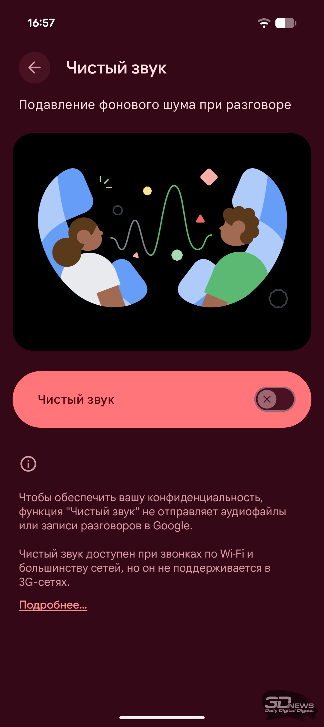 По звуковой составляющей у Pixel 10a всё практически так же, как у всех смартфонов его ценовой категории. Смартфон умеет воспроизводить стереозвук: вместе с расположенным на нижней грани выделенным динамиком работает также разговорный. Причём звук получается вполне сбалансированным, без значительного перекоса в сторону основного динамика, чем страдают некоторые смартфоны. Даже на максимальной громкости динамики не хрипят и выдают звук хорошего качества, придраться особо не к чему. Проводные наушники здесь можно подключить разве что через USB Type-C — 3,5-мм разъёма, как водится, здесь нет. Зато есть все ключевые профили для качественной передачи данных по Bluetooth 6.0, включая aptX и aptX HD от Qualcomm, а также LDAC.