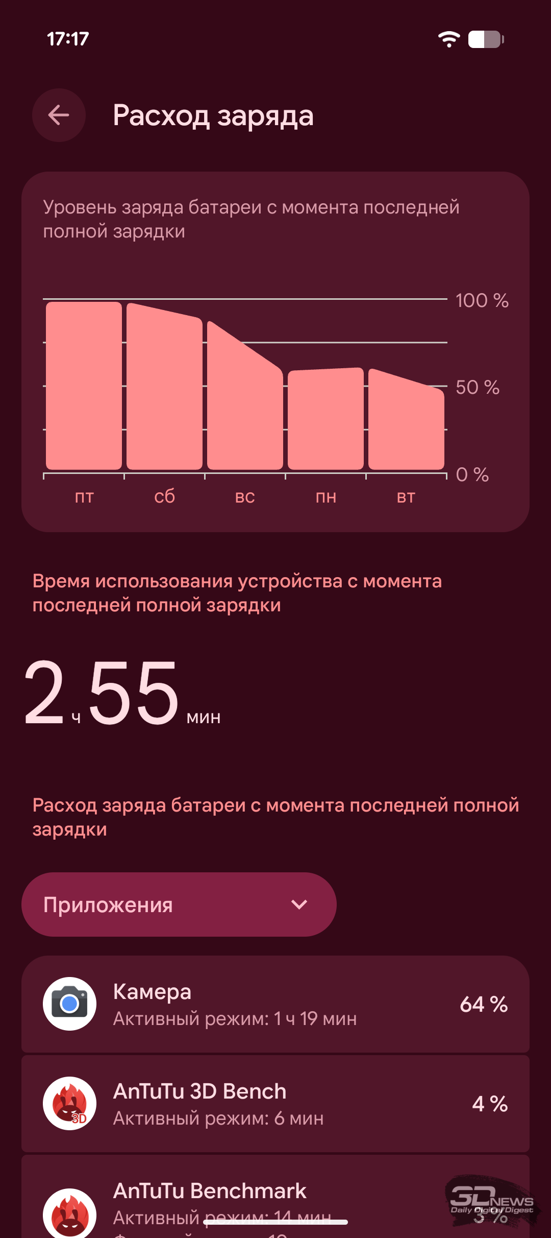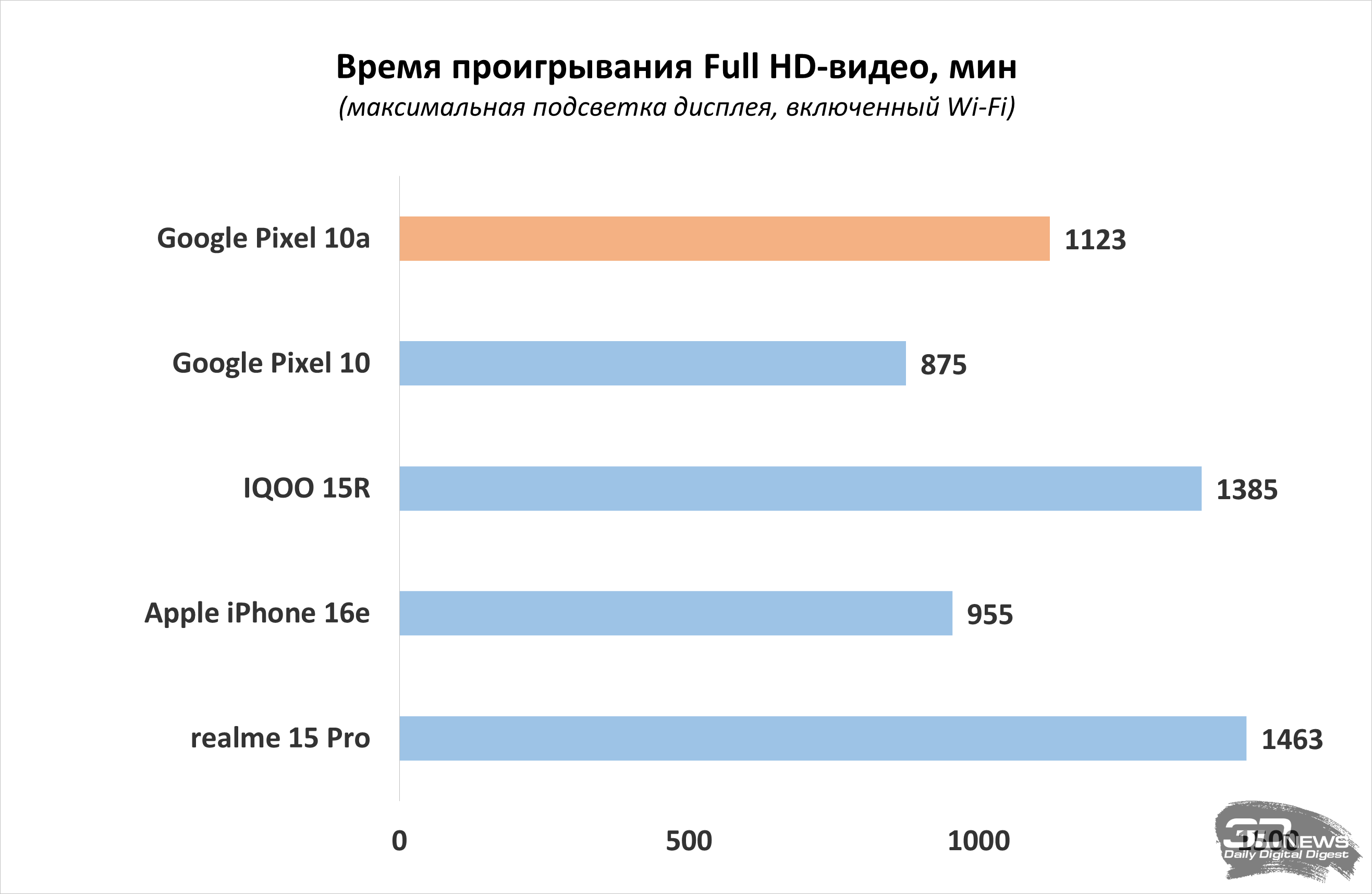В нашем традиционном тесте с воспроизведением Full HD-видео на максимальной яркости при включённом Wi-Fi, Google Pixel 10a продержался вполне достойные 18 часов 43 минуты. Нельзя назвать это выдающимся результатом — в среднем сегменте есть немало и куда более долгоживущих моделей, но и удручающим его точно не назовёшь.
