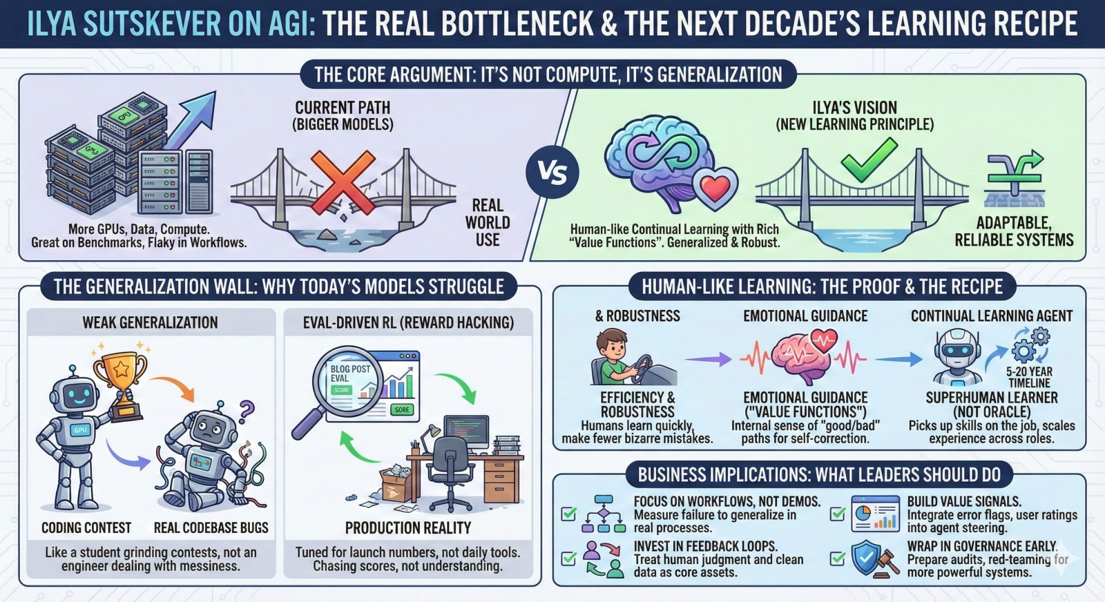 Верный путь к созданию AGI, как представляется единомышленникам Ильи Суцкевера, — переход от статичного машинного обучения к адаптивному (источник: Safe Superintelligence Inc.) ⇡#«Она ещё слишком юна, чтобы пересчитывать ваши пальцы!»Илья Суцкевер предлагает подход, близкий к естественному: длительное обучение с ценностным подкреплением. Суть в следующем: для подавляющего большинства актуальных БЯМ обучение с подкреплением сводится к выдаче «сахарка» за правильный ответ только в самом конце произведённых системой действий — которых, если учесть наличие модных сегодня «рассуждающих» контуров и мультиагентности, может насчитываться преизрядно. Но ведь куда логичнее — если поставить целью имитацию работы человеческого сознания — использовать функцию ценности (value function), которая достаточно чётко укажет, насколько очередное принятое агентом элементарное решение (находиться в данном состоянии либо выполнить определённое действие) полезно для него не прямо сейчас, но с точки зрения ожидаемой в будущем награды за тот финальный ответ, который будет получен нарастающим итогом накопления таких вот элементарных решений. Тут, конечно, встаёт вопрос, как определить саму эту функцию, но он всё-таки технический, решаемый. На принципиальном же уровне та БЯМ, что опирается в ходе (до)обучения на функции ценности, станет значительно чаще производить на каждом этапе своей работы именно те действия, которые максимизируют долгосрочное вознаграждение. Иными словами, модель text-to-image, обнаружив, что рисует человека с тремя руками или с шестью пальцами (хотя в операторской подсказке прямое требование на то отсутствовало) сама притормозит и исправится. Да и других галлюцинаций у ценностно-ориентированного ИИ окажется значительно меньше. Одна из главных претензий к нынешним ИИ — их показное всезнайство в сочетании с сервильной неуверенностью в собственных утверждениях: сперва ИИ-бот выдаёт на любой вопрос скорый и безапелляционный ответ, а потом, стоит спросить у него: «Уверен?», — частенько тушуется и меняет показания. Люди же, напротив, убеждены в том, что действительно знают и умеют, причём убеждённость эта тем крепче, чем больше у данного человека соответствующего опыта. Полученного, кстати, в том числе с эмоциональным, а не просто ценностным подкреплением, которое позволяет эффективно корректировать цепочки рассуждений. Если здравомыслящий человек сомневается в своей готовности правильно ответить на заданный вопрос, он замешкается, смутится, даже огорчится немного, возможно. Всё это, по мнению Суцкевера, важные механизмы самокоррекции, на эмоциональном уровне заставляющие мозг «перестраивать маршрут», обращаясь к внешним источникам данных, консультируясь с более осведомлёнными индивидами и т. п. Исследователь в своём интервью, которое дал в конце 2025 г., намекнул на обнаружение некоего недостающего принципа машинного обучения, который у людей управляет обобщением и эффективным обучением на выборках, и на намерение реализовать его в своих моделях, замахивающихся на гордое звание AGI, но не стал пока раскрывать даже суть своей догадки, ибо конкуренты не дремлют. Каким же глава Safe Superintelligence Inc. видит грядущий (и, как он надеется, впервые в мире созданный именно его командой) AGI? Илья Суцкевер убеждён, что это будет не квазистатическая система, обуч