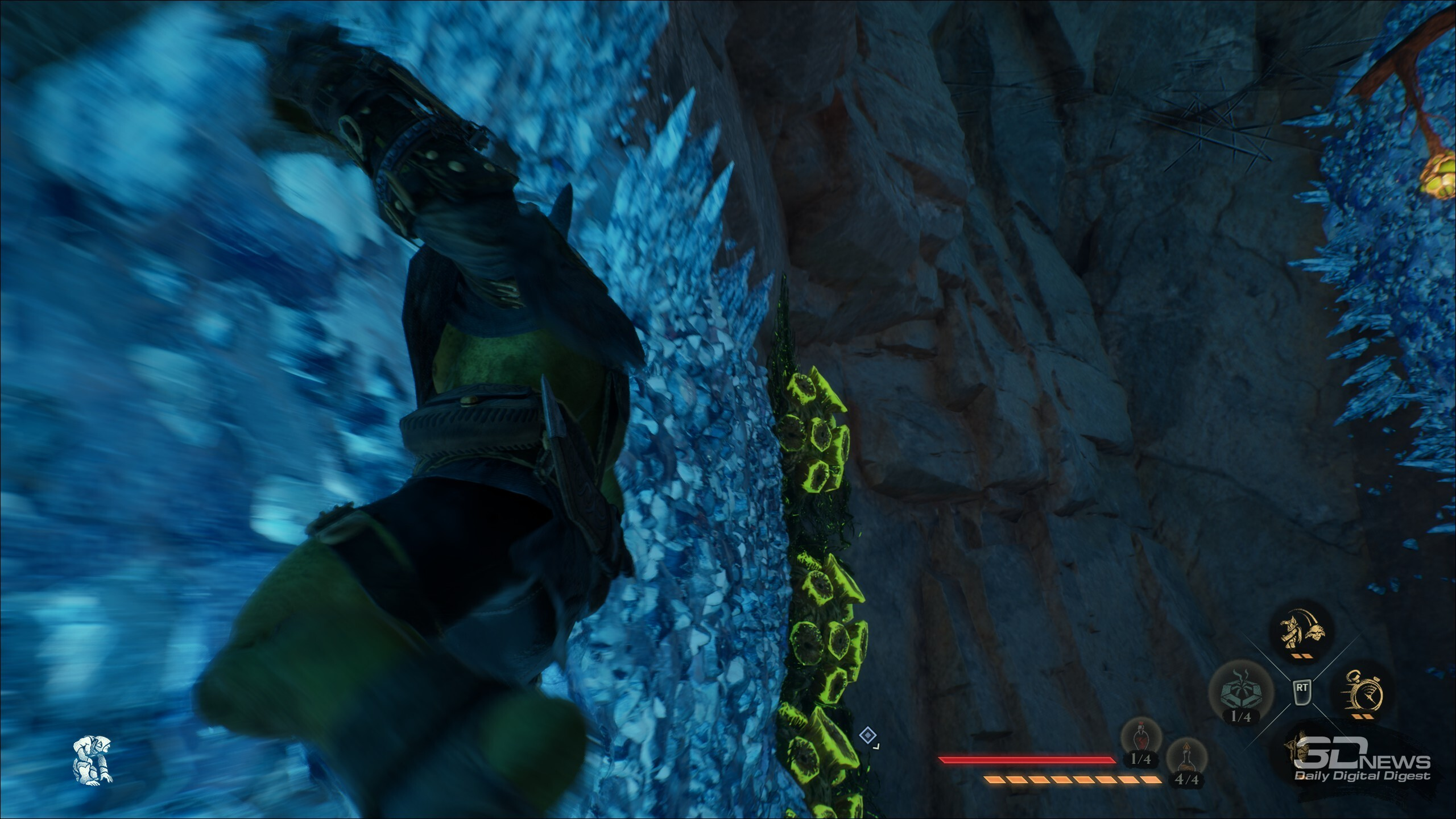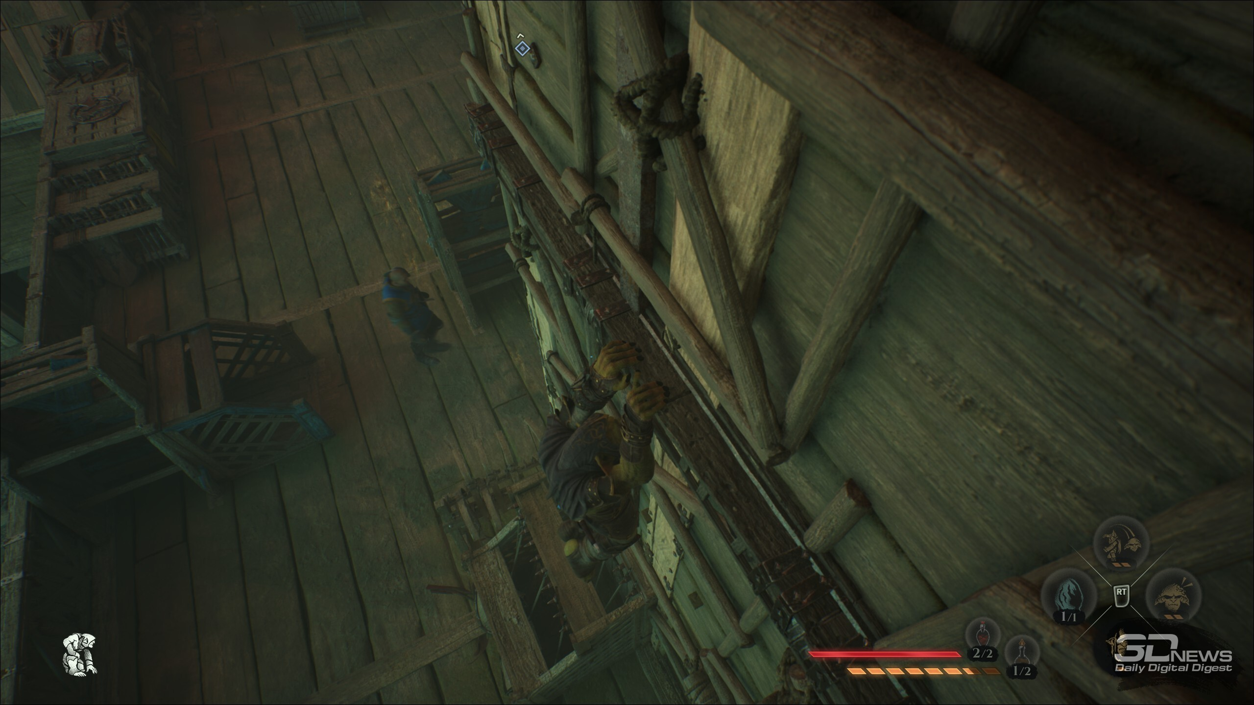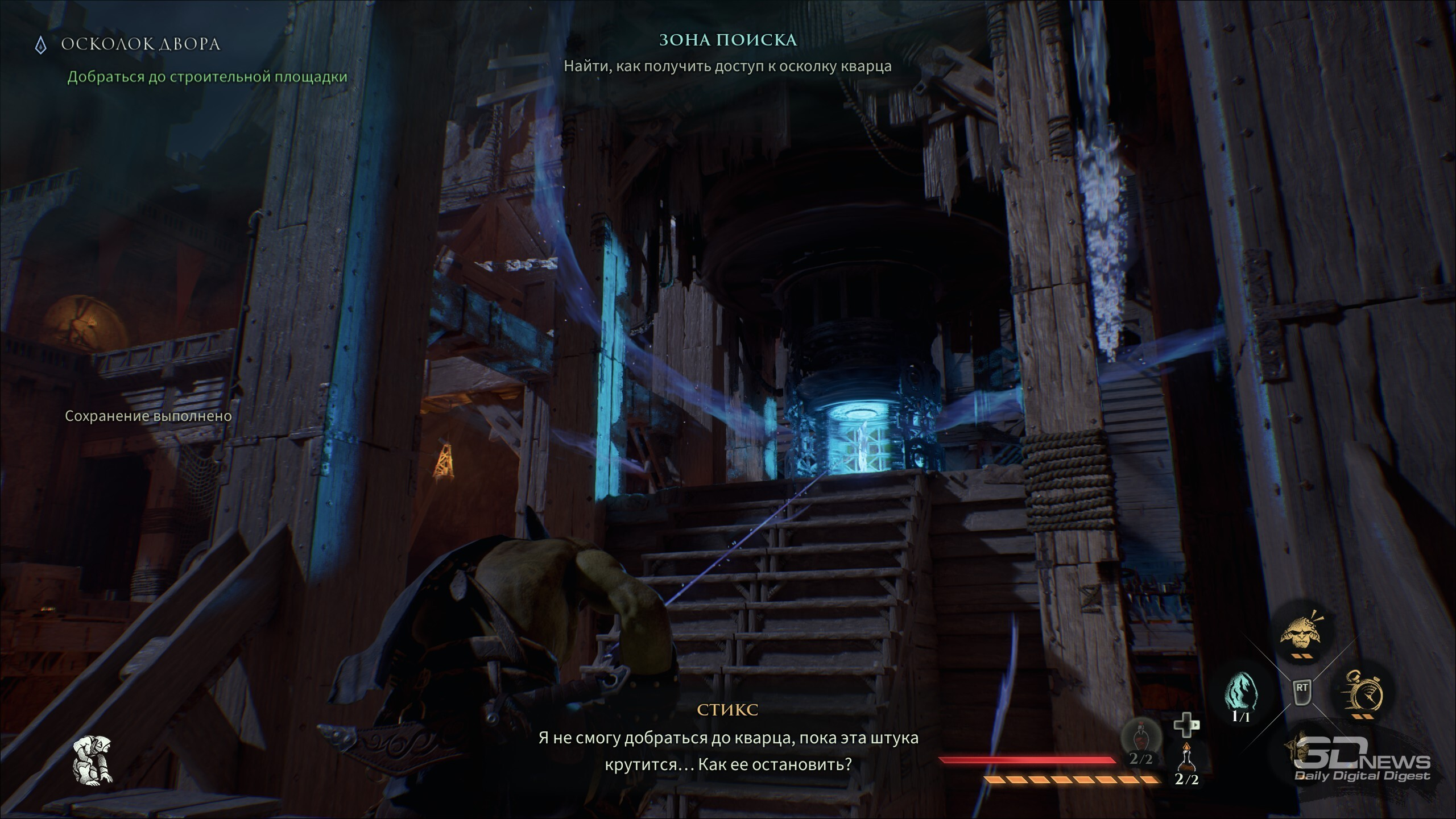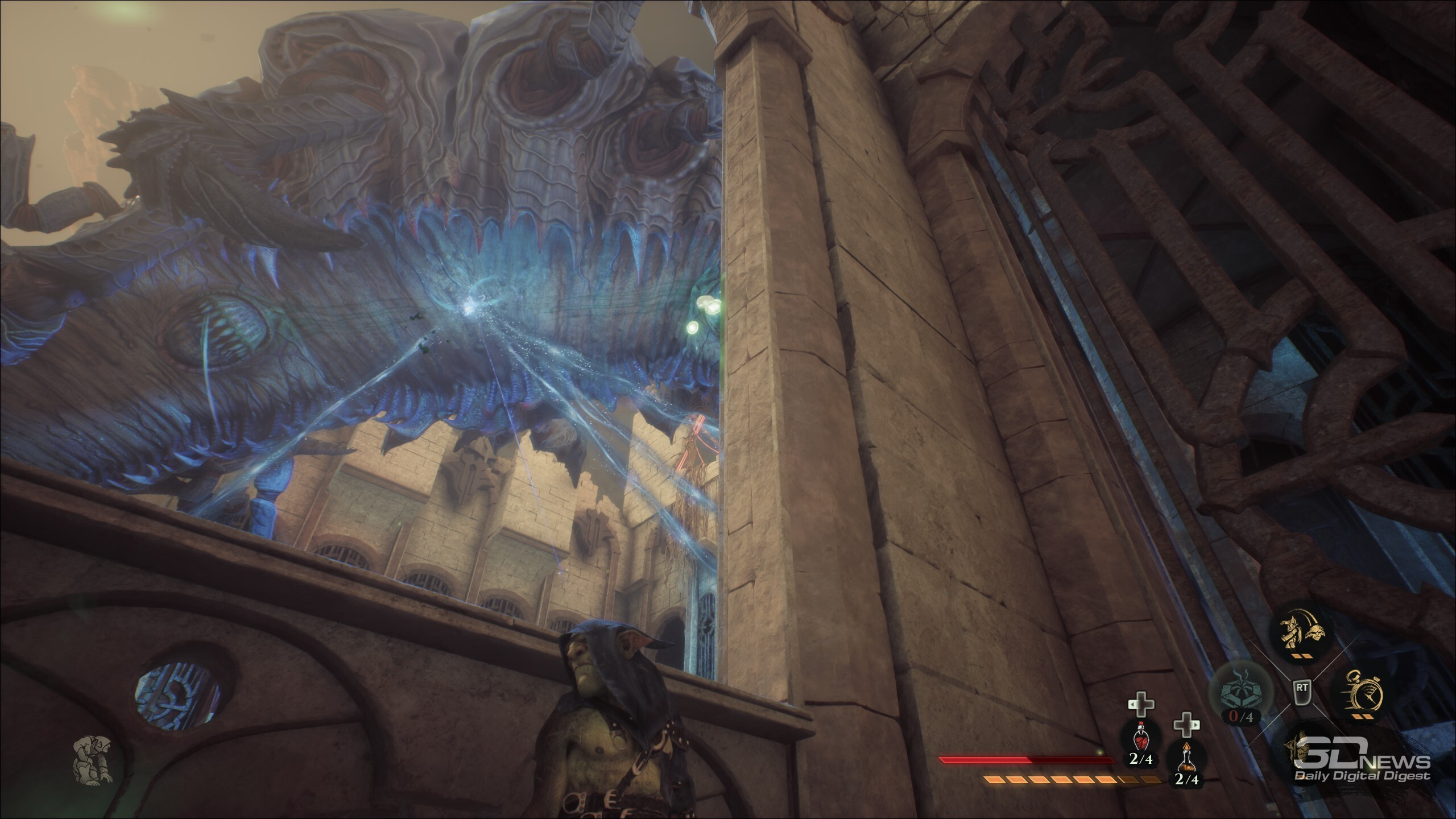 Девять лет назад я закончил рецензию на вторую часть Styx словами: «Shards of Darkness — шаг в правильном направлении как с точки зрения истории, так и в геймплее. Надеемся, авторы не остановятся на достигнутом». Но время шло, и за годы я уже смирился с тем, что история так и не получит продолжения. И вдруг Cyanide внезапно объявила, что триквелу быть! Само собой, я ждал Blades of Greed. Но когда игра была пройдена, а по экрану поползли титры, я испытал противоречивые чувства. Студия действительно попыталась толкнуть серию вперед. Кто же знал, что впереди окажется яма. ⇡#Не камни, а кварц!Blades of Greed начинается с той же сцены, которой заканчивается Shards of Darkness. Наш герой Стикс и темный эльф Джарек решили подраться после победы над каменным титаном. Но даже если вы знакомы с серией, сразу вспомнить, что к чему, будет очень сложно. Пришлось поставить игру на паузу и поискать ролик с пересказом прошлых событий. Вступление третьей части очень хочет казаться высокобюджетным. Выяснилось, что голем вовсе не повержен. Отложив личные разборки, Стикс забирается по колоссу, словно Кратос из God of War 3. Залезает внутрь и уничтожает сердце, а затем убегает, пока каменное чудище не стало его могилой. Звучит захватывающе, но на деле пробежка по серому коридору под аккомпанемент дешевых эффектов — не самая увлекательная сцена. К счастью, она не задает тон всей игре. Конфликт, заложенный в последней сцене сиквела, исчерпывает себя в первые полчаса. Но вместо того, чтобы рассказать новую историю, Blades of Greed почти весь свой хронометраж топчется на месте. Стикс, коснувшись драгоценного кварца, получает странную силу. Что неожиданно, ведь все прочие существа при контакте с магическим минералом погибают. Гоблин справедливо решает, что чем больше кварца собрать, тем круче он станет… поэтому мы всю игру и будем носиться за камушками. Да, формально по ходу дела мы встретимся с разными персонажами и столкнемся с некой сущностью, называющей себя Флакс (она возникает при контакте с каждым новым кусочком кварца). История добавляет несколько крох к мифологии Акенаша и даже касается тайны прошлого гоблина. Но глобально сюжет вопиюще пуст. И никакие подмигивания для фанатов, вроде убежища из первой части, ситуацию не исправят. Режиссура тоже сделала шаг назад. Ролики поставлены слабее, чем в сиквеле. Настолько, что даже скучаешь по комиксам из оригинальной Master of Shadows. Общая низкобюджетность чувствуется даже в озвучке. Диалоги краткие и скучные, а голоса буквально делятся на Стикса и всех остальных — здоровенные мускулистые орки говорят ровно теми же стерильными голосами, что и тщедушные стражники-люди. ⇡#Гоблинский патрульСложно не испытывать разочарования. Ведь Shards of Darkness вышла всего спустя три года после первой части, но сделала приличный шаг вперед по всем фронтам. А триквел, который появился спустя еще девять лет, не смог даже удержать ранее заданную планку. Но все же главным плюсом серии всегда был игровой процесс. После проходного вступления Стикс попадает в Город-на-Стене, и тут Blades of Greed начинает показывать свои сильные стороны. Прошлые выпуски славились продуманным дизайном уровней со множеством путей, как очевидных, так и неприметных. Триквел предлагает еще более замысловатую архитектуру. На смену череде отдельных миссий пришли просторные локации, на которых расставлены сюжетные и по