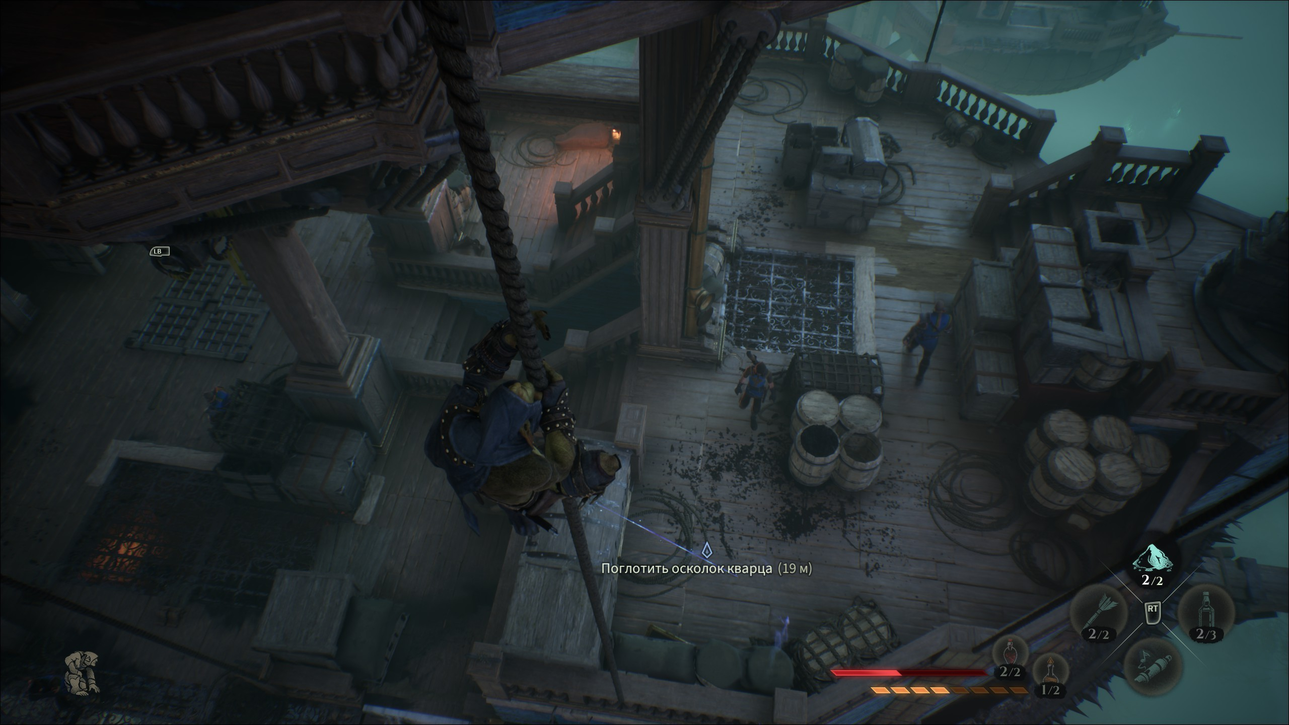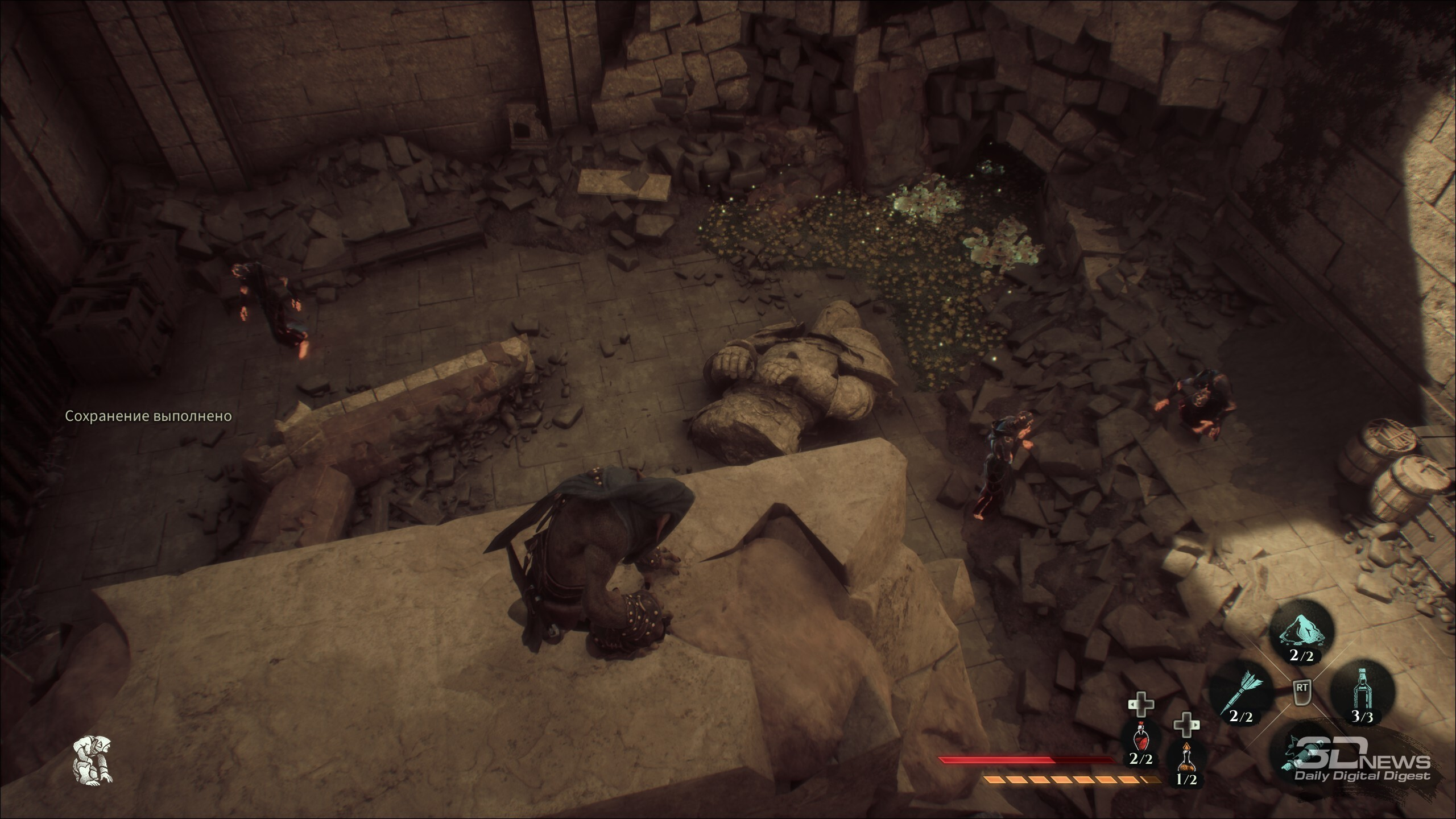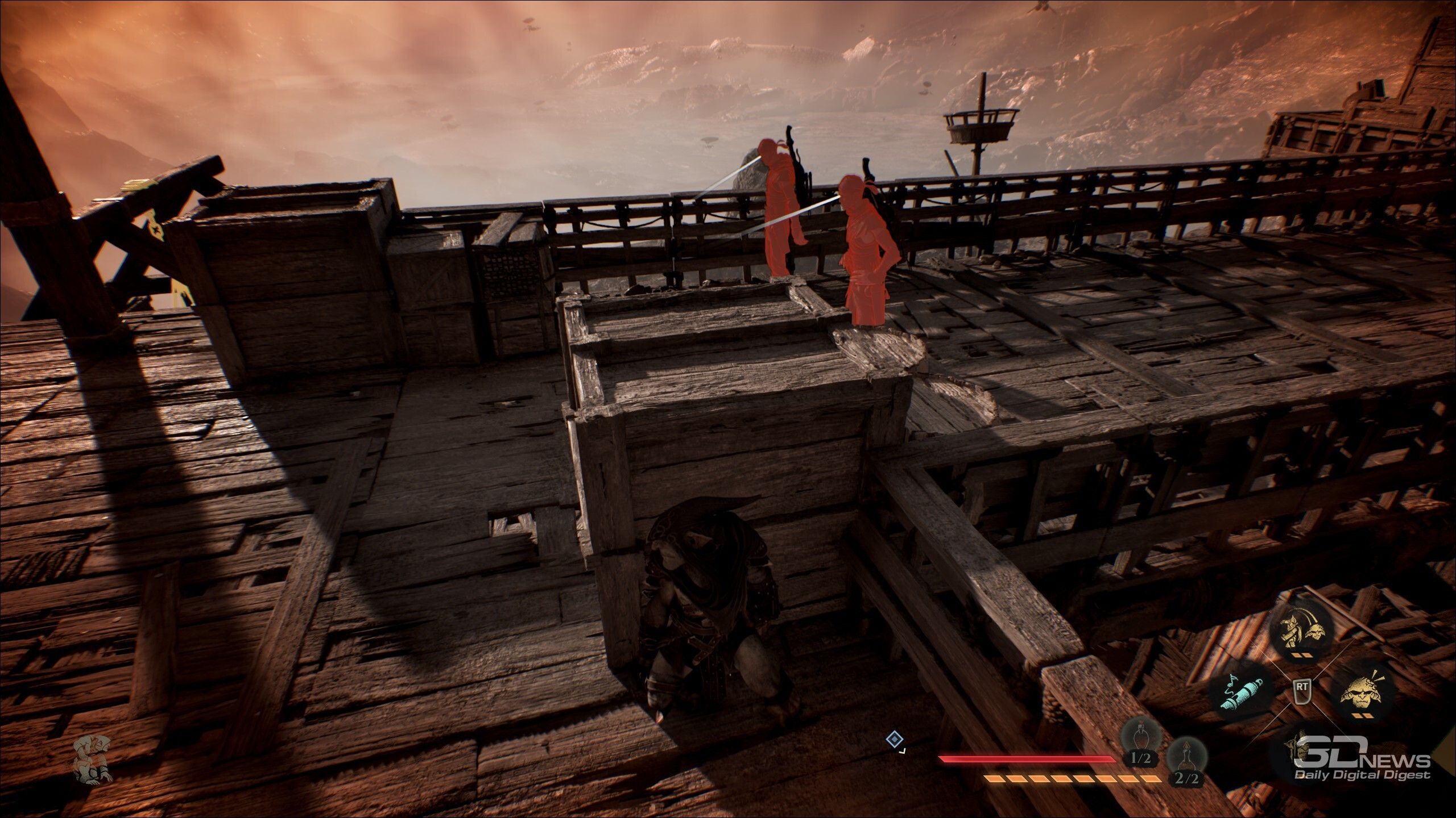 Девять лет назад я закончил рецензию на вторую часть Styx словами: «Shards of Darkness — шаг в правильном направлении как с точки зрения истории, так и в геймплее. Надеемся, авторы не остановятся на достигнутом». Но время шло, и за годы я уже смирился с тем, что история так и не получит продолжения. И вдруг Cyanide внезапно объявила, что триквелу быть! Само собой, я ждал Blades of Greed. Но когда игра была пройдена, а по экрану поползли титры, я испытал противоречивые чувства. Студия действительно попыталась толкнуть серию вперед. Кто же знал, что впереди окажется яма. ⇡#Не камни, а кварц!Blades of Greed начинается с той же сцены, которой заканчивается Shards of Darkness. Наш герой Стикс и темный эльф Джарек решили подраться после победы над каменным титаном. Но даже если вы знакомы с серией, сразу вспомнить, что к чему, будет очень сложно. Пришлось поставить игру на паузу и поискать ролик с пересказом прошлых событий. Вступление третьей части очень хочет казаться высокобюджетным. Выяснилось, что голем вовсе не повержен. Отложив личные разборки, Стикс забирается по колоссу, словно Кратос из God of War 3. Залезает внутрь и уничтожает сердце, а затем убегает, пока каменное чудище не стало его могилой. Звучит захватывающе, но на деле пробежка по серому коридору под аккомпанемент дешевых эффектов — не самая увлекательная сцена. К счастью, она не задает тон всей игре. Конфликт, заложенный в последней сцене сиквела, исчерпывает себя в первые полчаса. Но вместо того, чтобы рассказать новую историю, Blades of Greed почти весь свой хронометраж топчется на месте. Стикс, коснувшись драгоценного кварца, получает странную силу. Что неожиданно, ведь все прочие существа при контакте с магическим минералом погибают. Гоблин справедливо решает, что чем больше кварца собрать, тем круче он станет… поэтому мы всю игру и будем носиться за камушками. Да, формально по ходу дела мы встретимся с разными персонажами и столкнемся с некой сущностью, называющей себя Флакс (она возникает при контакте с каждым новым кусочком кварца). История добавляет несколько крох к мифологии Акенаша и даже касается тайны прошлого гоблина. Но глобально сюжет вопиюще пуст. И никакие подмигивания для фанатов, вроде убежища из первой части, ситуацию не исправят. Режиссура тоже сделала шаг назад. Ролики поставлены слабее, чем в сиквеле. Настолько, что даже скучаешь по комиксам из оригинальной Master of Shadows. Общая низкобюджетность чувствуется даже в озвучке. Диалоги краткие и скучные, а голоса буквально делятся на Стикса и всех остальных — здоровенные мускулистые орки говорят ровно теми же стерильными голосами, что и тщедушные стражники-люди. ⇡#Гоблинский патрульСложно не испытывать разочарования. Ведь Shards of Darkness вышла всего спустя три года после первой части, но сделала приличный шаг вперед по всем фронтам. А триквел, который появился спустя еще девять лет, не смог даже удержать ранее заданную планку. Но все же главным плюсом серии всегда был игровой процесс. После проходного вступления Стикс попадает в Город-на-Стене, и тут Blades of Greed начинает показывать свои сильные стороны. Прошлые выпуски славились продуманным дизайном уровней со множеством путей, как очевидных, так и неприметных. Триквел предлагает еще более замысловатую архитектуру. На смену череде отдельных миссий пришли просторные локации, на которых расставлены сюжетные и по