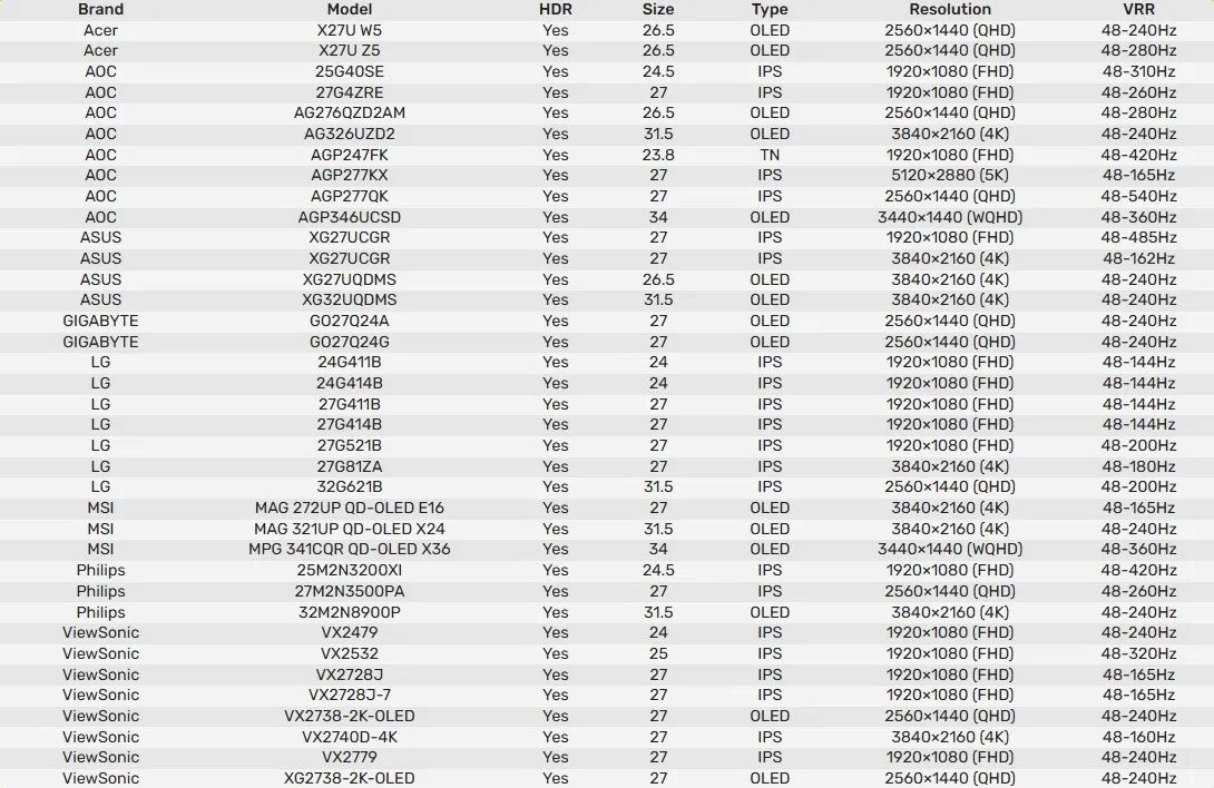 Nvidia также добавила поддержку 37 новых совместимых с G-Sync игровых мониторов. С их списком можно ознакомиться ниже.