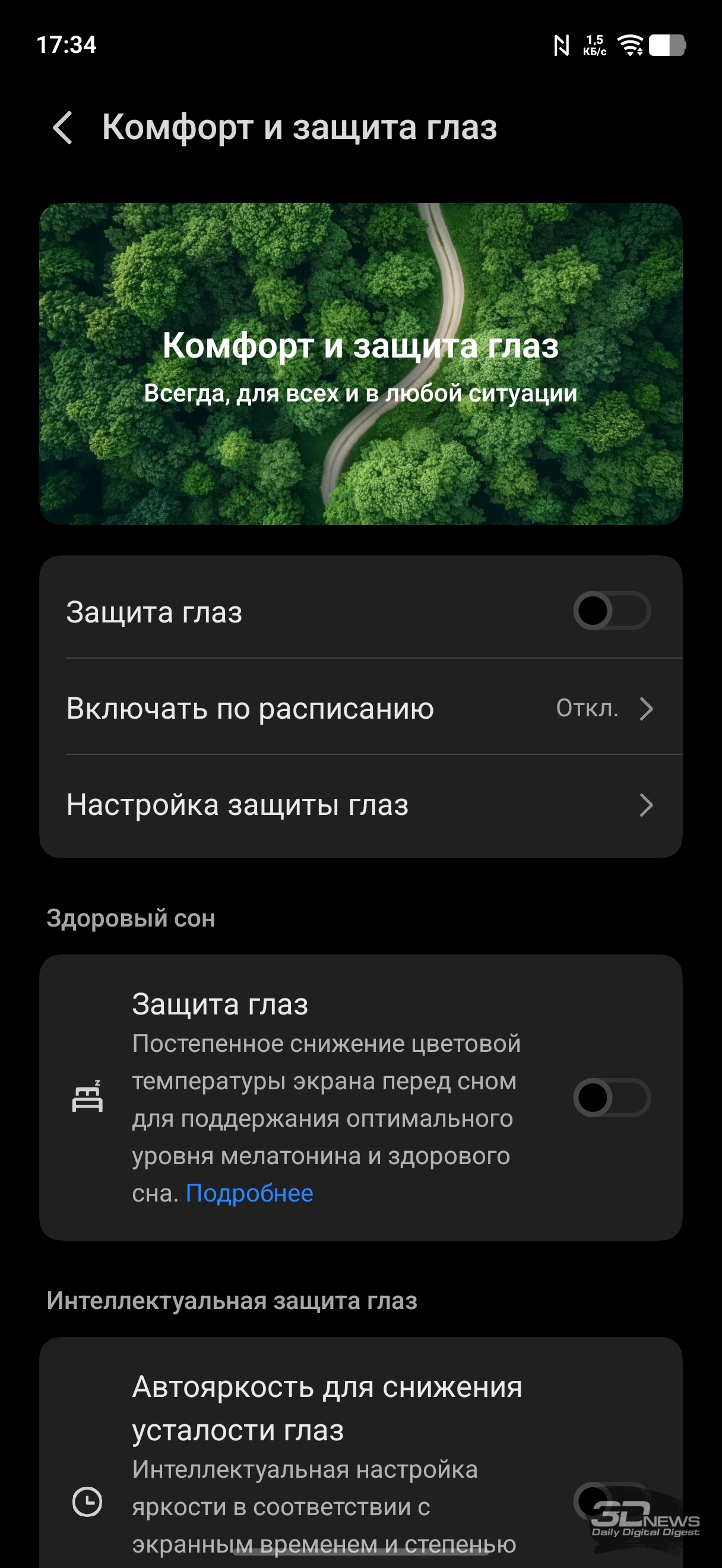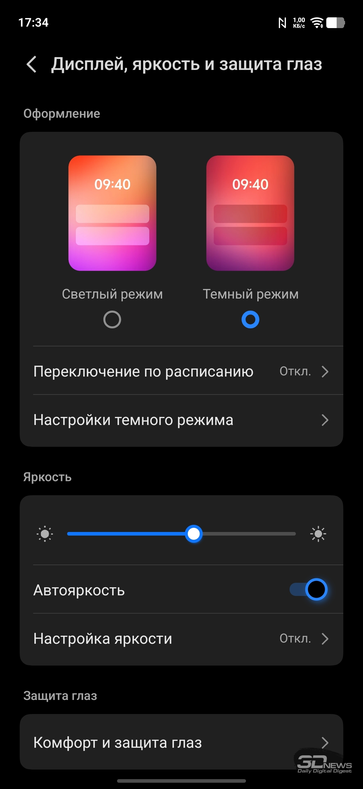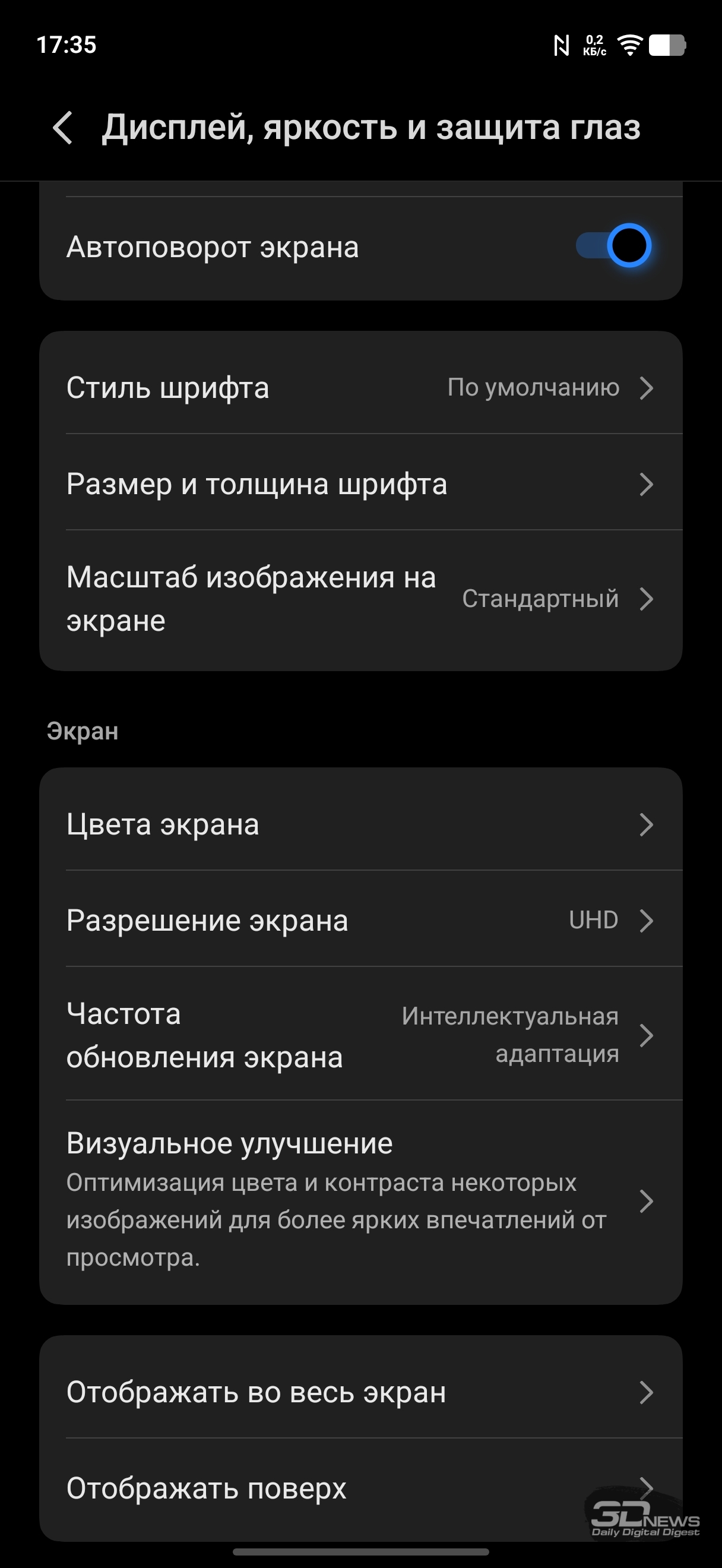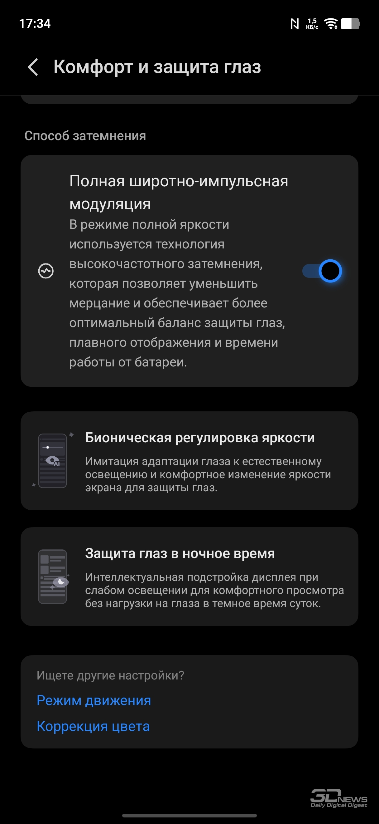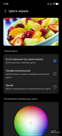 Настройки дисплея: темная тема (можно настроить расписание), масштаб и шрифты, регулировка частоты (вручную можно выставить 60 или 120 Гц или оставить настройку на усмотрение смартфона), есть программное «улучшение» цветовой насыщенности. Есть целый раздел, посвященный защите зрения: помимо возможности просто сделать цвета более теплыми (или настроить расписание активации теплого режима), можно активировать режим, при котором смартфон сам к вечеру постепенно снижает цветовую температуру; также можно активировать не просто автоматическую регулировку яркости, а настройку яркости с учетом экранного времени для снижения усталости глаз, ну и адаптировать цвета в зависимости от окружающего освещения. К слову, и обычную автояркость можно регулировать на основании контрастной чувствительности ваших глаз (необходимо провести тест). Это позволит смартфону не опускать яркость слишком низко.