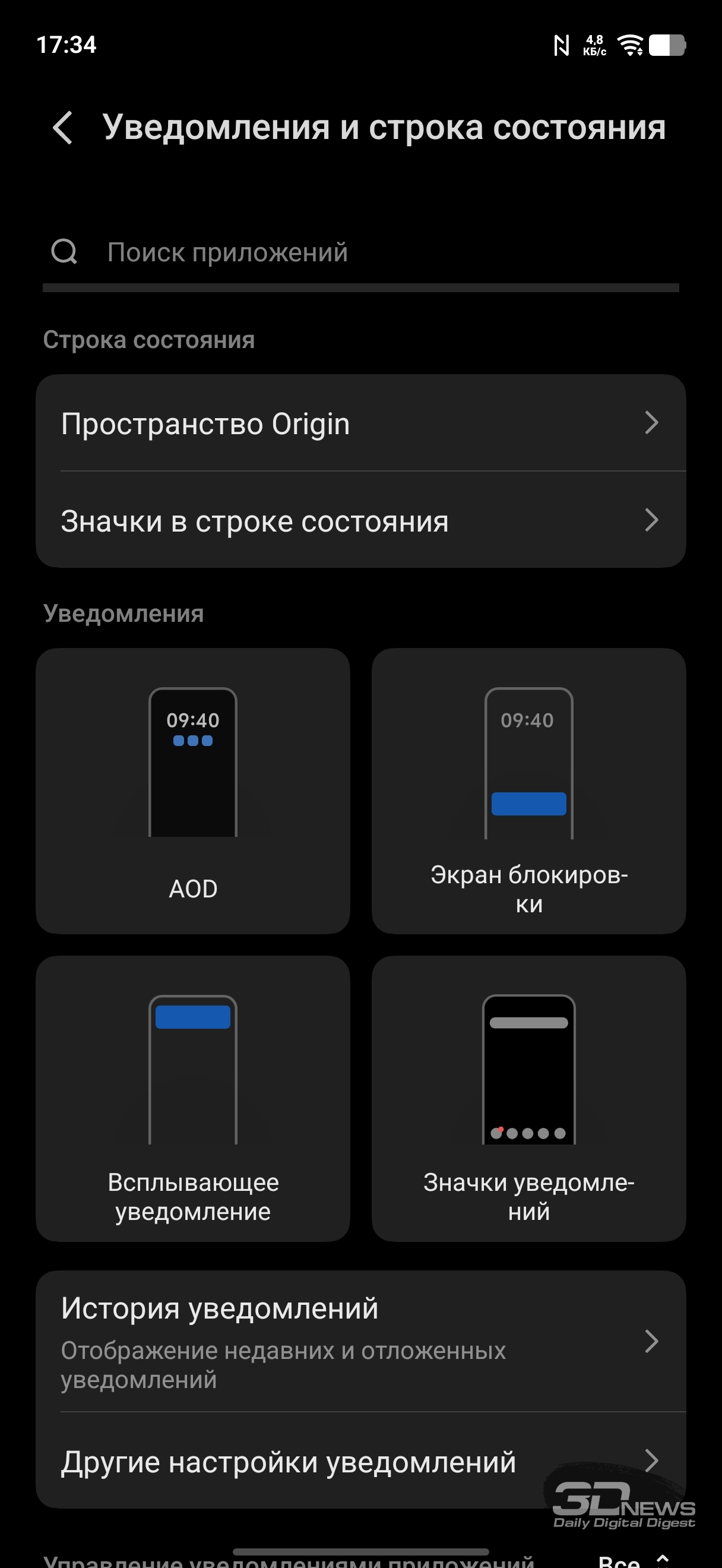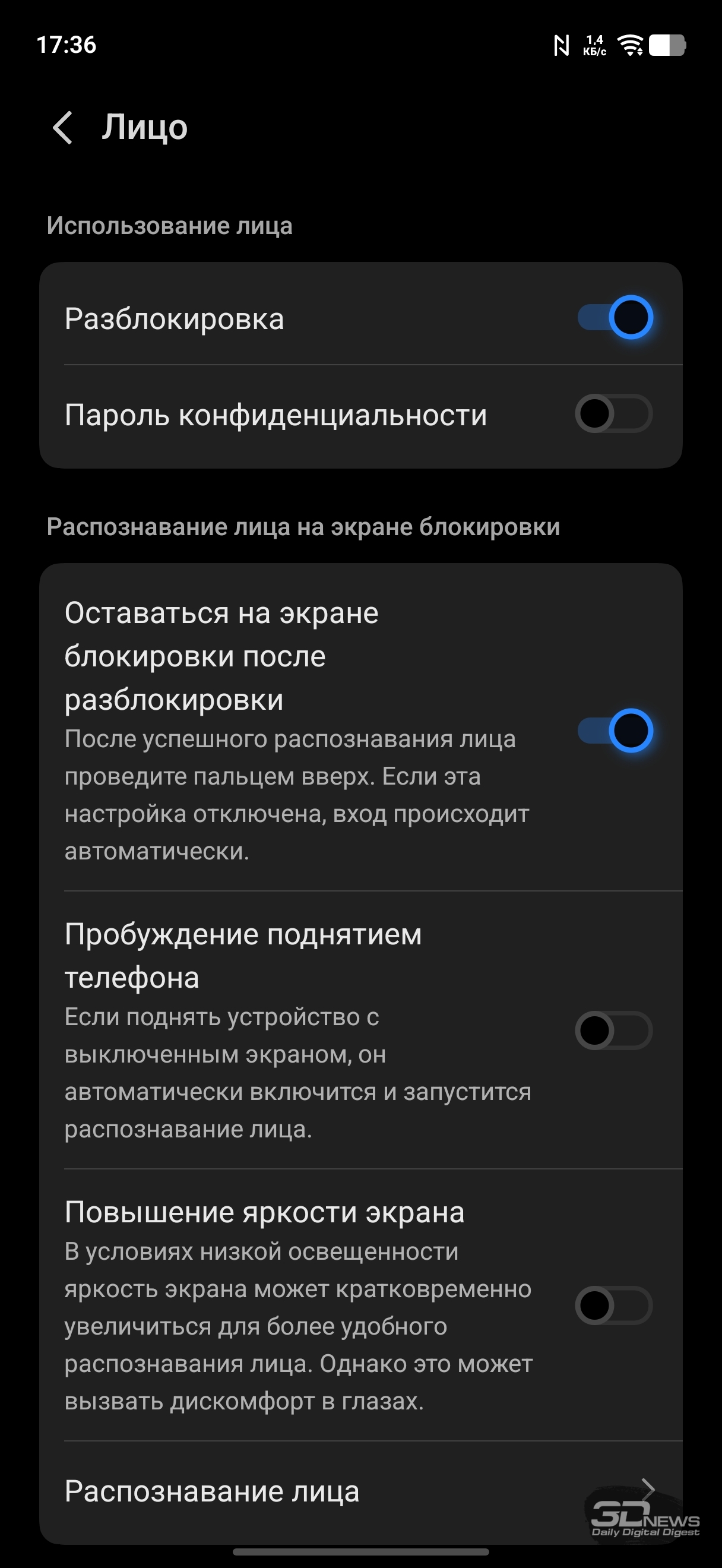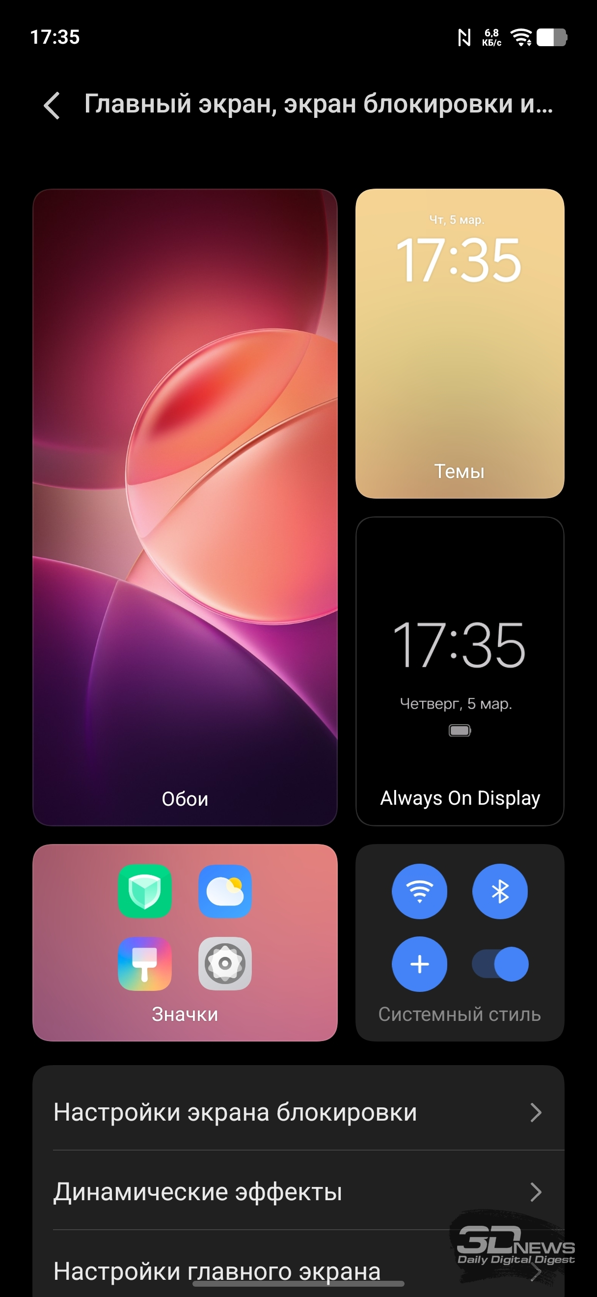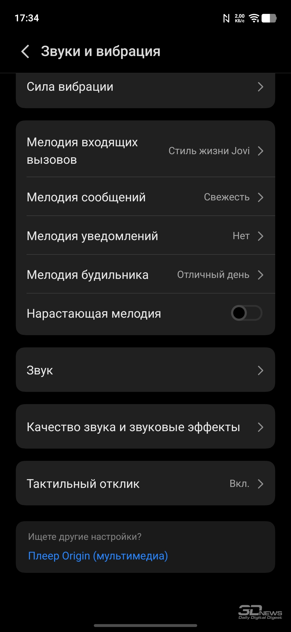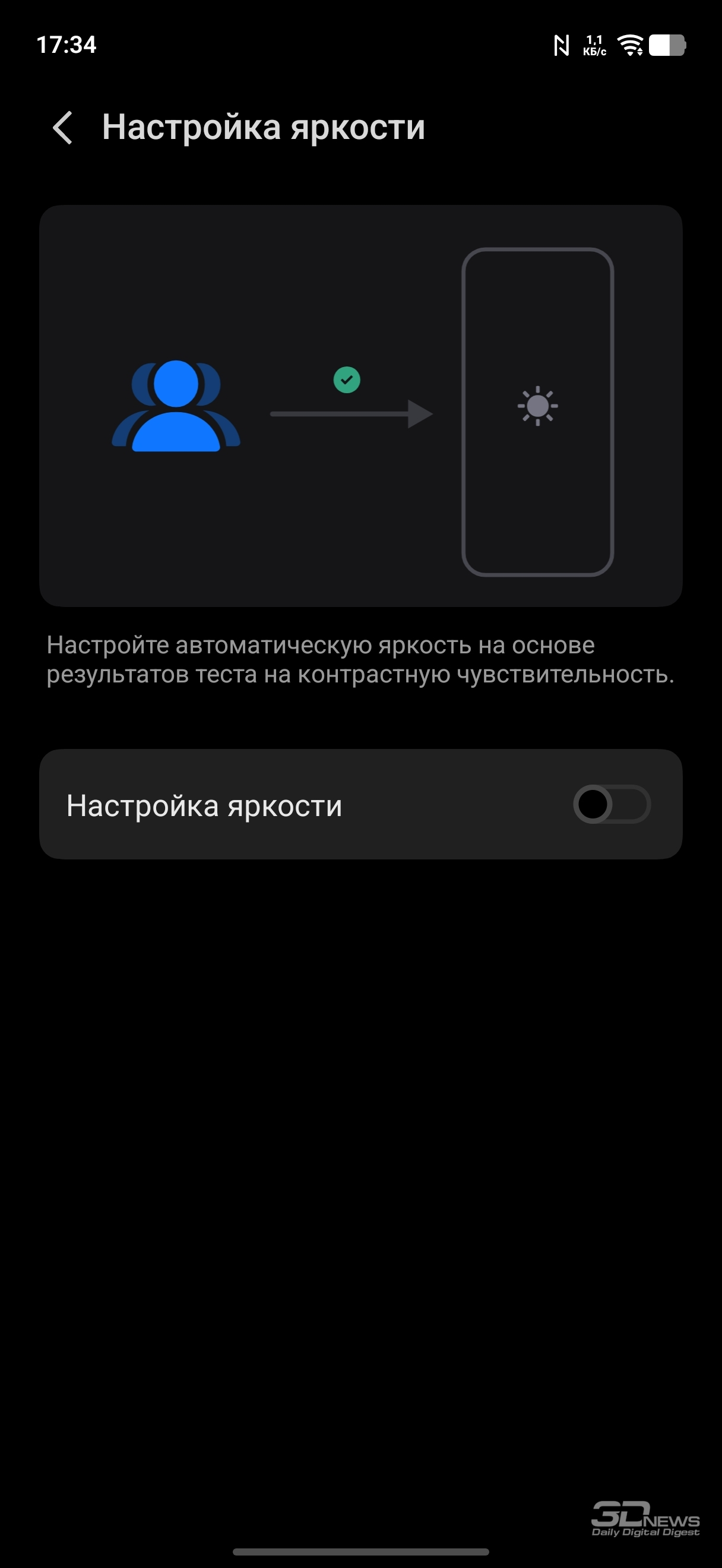 Настройки дисплея: темная тема (можно настроить расписание), масштаб и шрифты, регулировка частоты (вручную можно выставить 60 или 120 Гц или оставить настройку на усмотрение смартфона), есть программное «улучшение» цветовой насыщенности. Есть целый раздел, посвященный защите зрения: помимо возможности просто сделать цвета более теплыми (или настроить расписание активации теплого режима), можно активировать режим, при котором смартфон сам к вечеру постепенно снижает цветовую температуру; также можно активировать не просто автоматическую регулировку яркости, а настройку яркости с учетом экранного времени для снижения усталости глаз, ну и адаптировать цвета в зависимости от окружающего освещения. К слову, и обычную автояркость можно регулировать на основании контрастной чувствительности ваших глаз (необходимо провести тест). Это позволит смартфону не опускать яркость слишком низко.