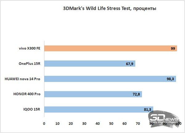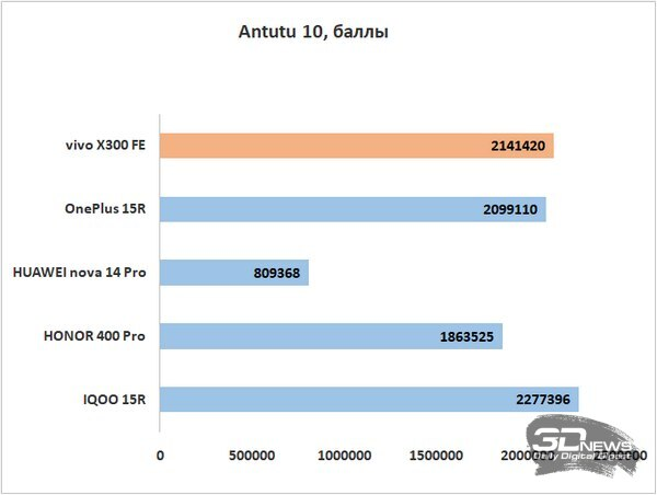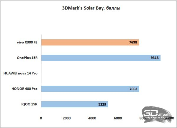 Мы совсем недавно тестировали упомянутые выше смартфоны, но проявили они себя в плане производительности по-разному из-за склонности OnePlus к перегреву. Очень любопытно было, за какую команду сыграет в итоге vivo X300 FE с той же аппаратной платформой. Делаем вывод, что скорее за команду собственного суббренда, – общие показатели в бенчмарках ближе к результатам игрового устройства IQOO. Местами даже есть небольшое превосходство, но оно здесь скорее условное — где-то мы дали гаджету чуть больше отдохнуть, где-то, возможно, воздух в комнате был более прохладным. Но сильно пиковые частоты vivo X300 FE точно не режет. В играх мы видим 90 или 120 кадров в секунду в зависимости от проекта. Уровень вполне неплохой для устройства, которое не позиционируется как игровое.