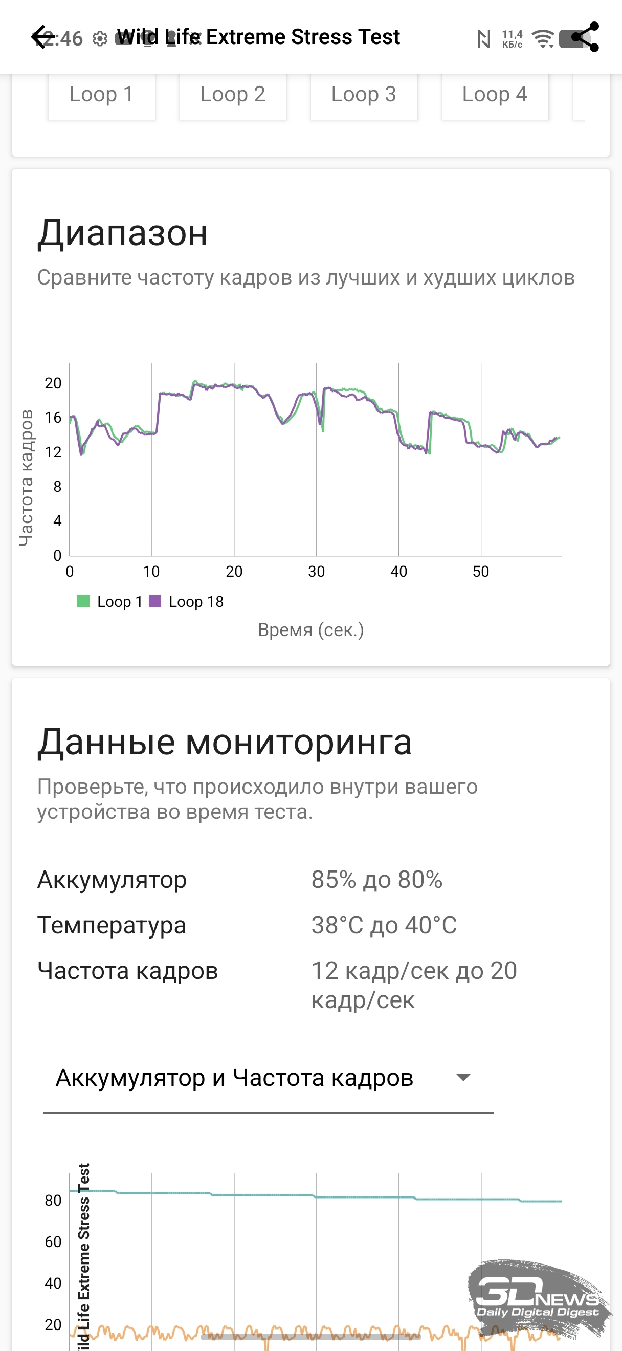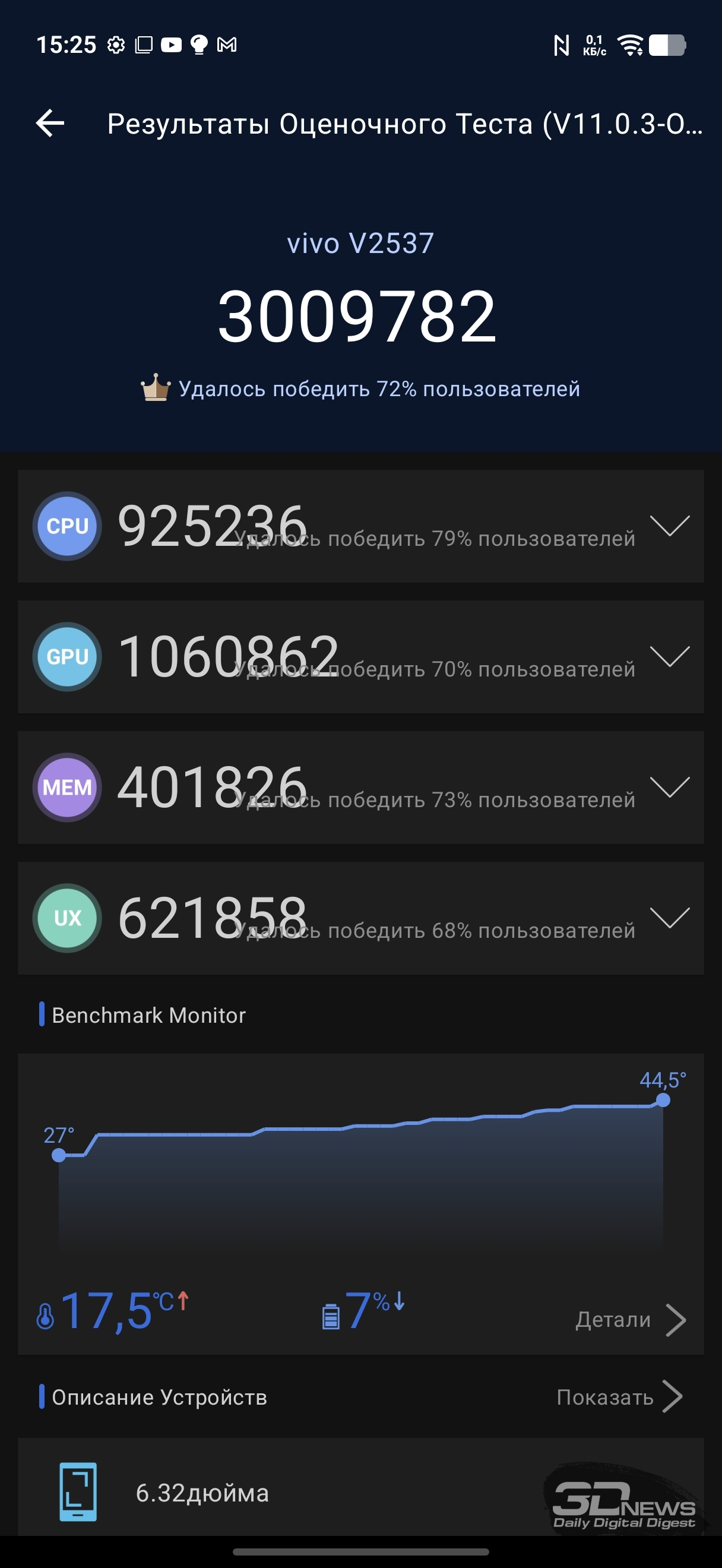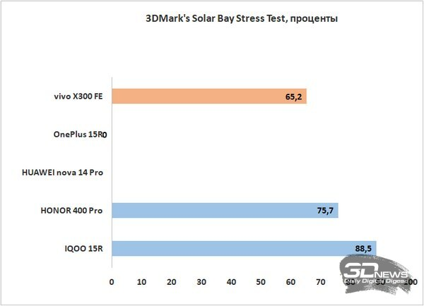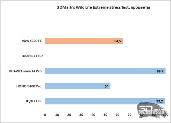Троттлинг у vivo X300 FE присутствует, причем довольно заметно — фиксируется до 40 % в ресурсных тестах. Работает система при этом надежно, температура устройства не превышает 40-42 °C даже при серьезной нагрузке.