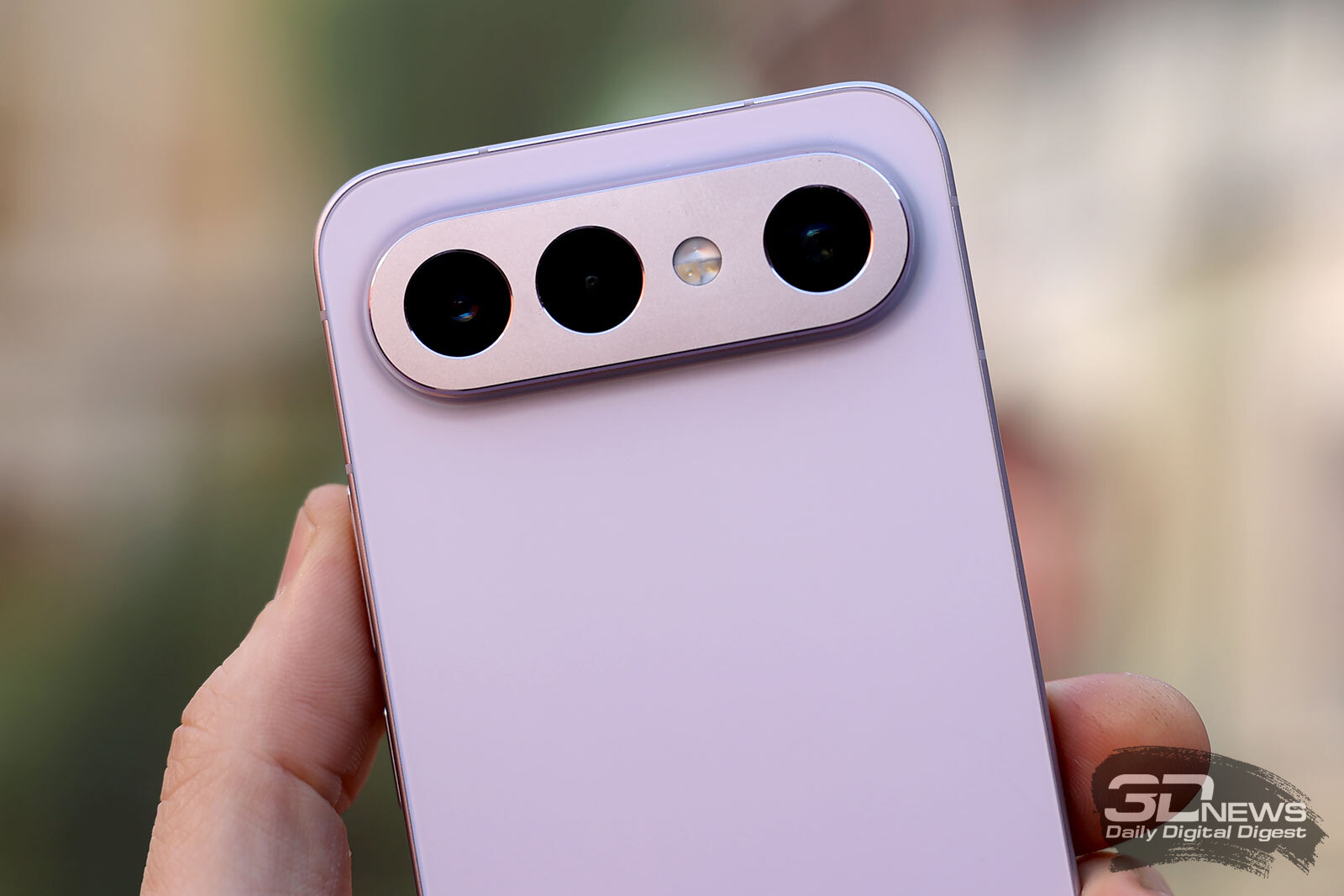 И здесь камеры оказались собраны на горизонтальной плашке в стиле Google Pixel или последнего поколения iPhone, а не в черном круге на манер vivo X300/X300 Pro (и еще уймы очень похожих смартфонов). Казалось бы, малозначимая деталь, но смотрится vivo X300 FE в итоге куда более свежо и интересно. Плашка эта окрашена в тон корпуса (а не в черный, в котором тонут объективы камер), при этом исполнена из алюминия, выделяясь на общем фоне задней панели смартфона.