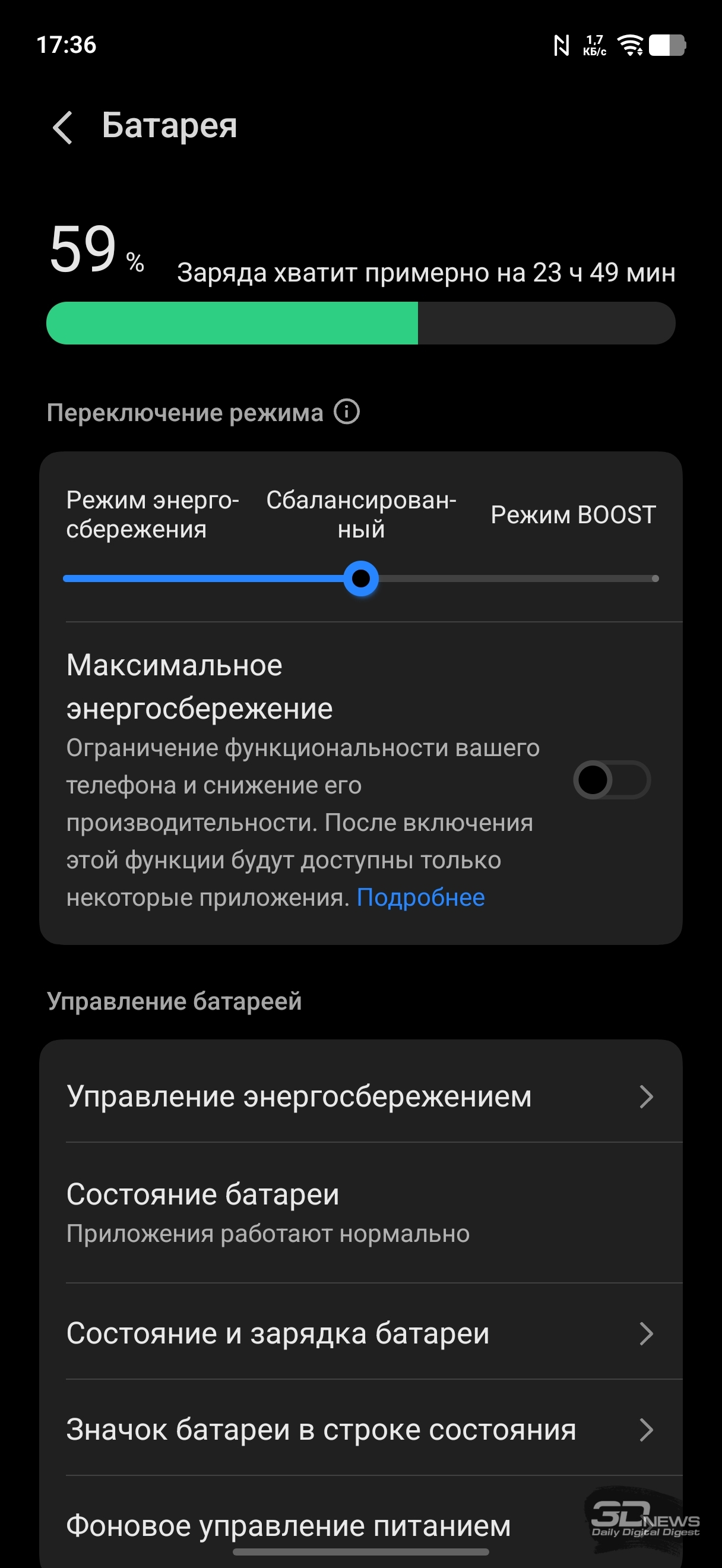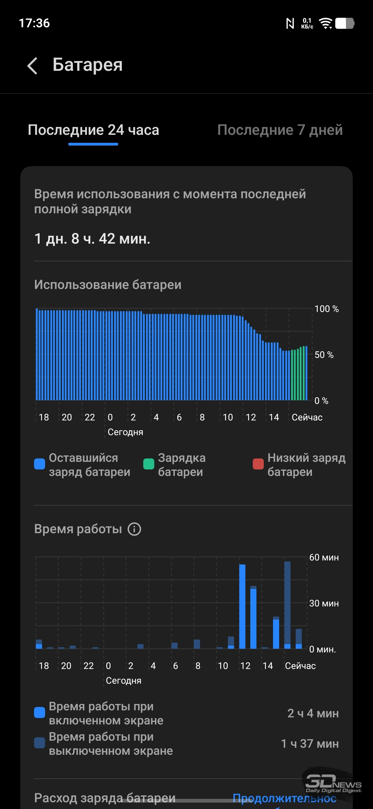 Несмотря на небольшие габариты, vivo X300 FE получил весьма емкую батарею — на 24,7 Вт·ч (6500 мА·ч, 3,8 В). Это, конечно же, кремний-углеродный аккумулятор. Благодаря сочетанию небольшого экрана и мощной, но все же не флагманской платформы (с более умеренным энергопотреблением) мы имеем дело со смартфоном, который пусть и не бьет рекордов автономности, но как минимум не вызывает в этом отношении никаких вопросов. Заряжать смартфон чаще раза в день точно не придется почти ни при каких условиях эксплуатации — разве только вы будете на нем играть непрерывно 9-10 часов кряду.