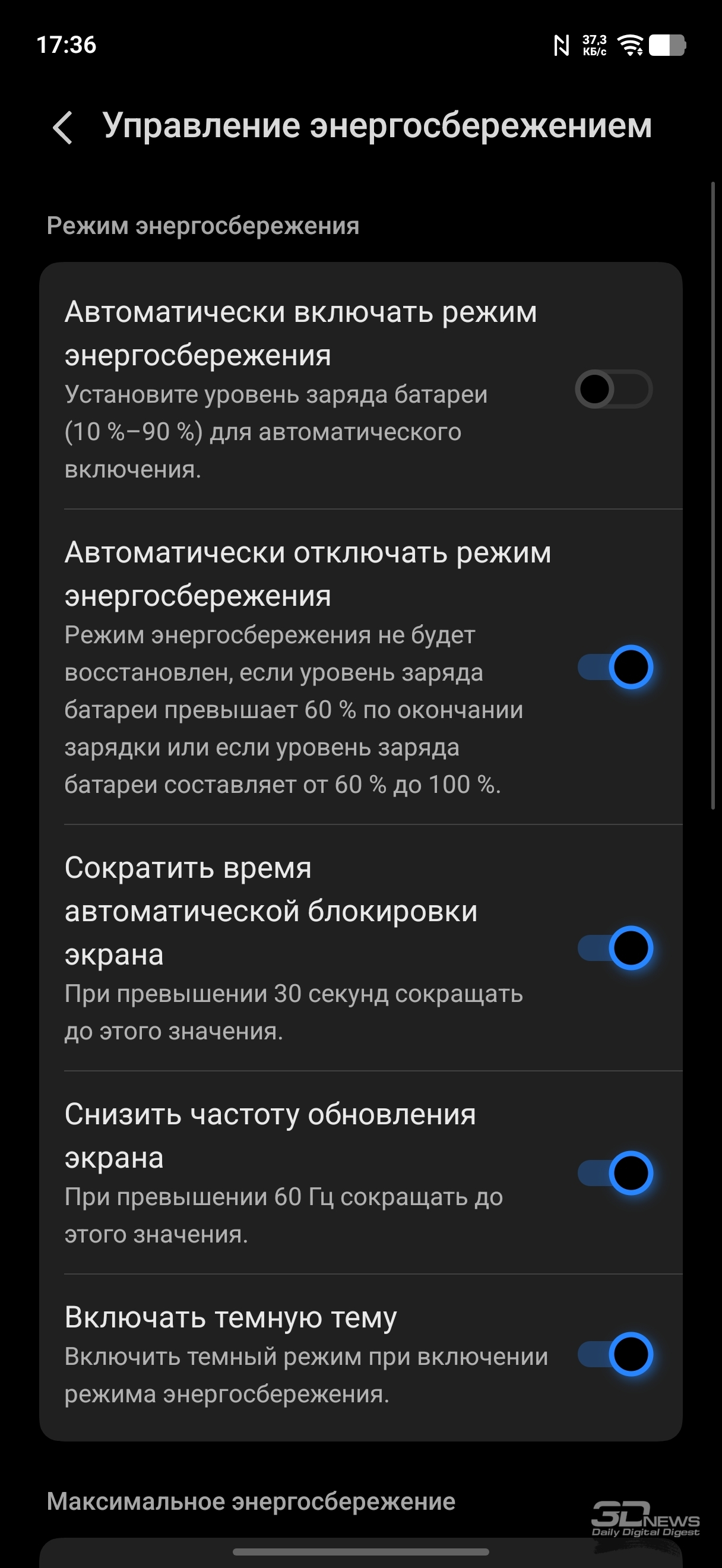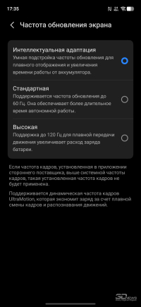 Экран может работать с повышенной частотой обновления вплоть до 120 Гц, при этом регулируемой гибко в диапазоне от 1 до 120 Гц — тут установлена LTPO-матрица, что встречается на субфлагманах не всегда. Частота регулируется корректно, каких-то странных и неуместных проседаний в отдельных приложениях не замечено. В играх повышенная частота поддерживается, в соревновательных проектах она достигает заявленных 120 Гц (в проектах, требовательных в плане графики, она держится на уровне стабильных 60 Гц). Частота ШИМ заявлена на уровне 2160 Гц — мерцание при низких значениях яркости незаметно.