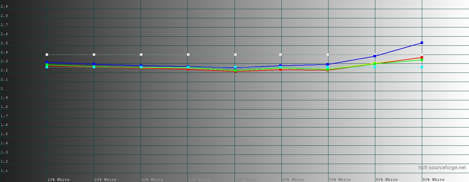 В режиме «Яркий» цветовой охват дополнительно расширяется, уже достигая уровня DCI-P3. Гамма поднимается — 2,26. Цветовая температура тоже чуть повышается, оказываясь на уровне 7 000-7 100 К. Среднее отклонение DeltaE по таблице Color Checker составляет 2,99 – фактически, на границе нормы. Крайне редкая ситуация, когда в ярком режиме с расширенной цветовой гаммой цветопередача оказывается даже точнее, чем в режиме с более узкой гаммой.
