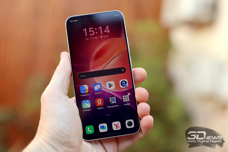 Визуально новый островок камер смотрится легче, но по факту тоже очень сильно выступает над корпусом, добавляя к восьми базовым миллиметрам еще пять-шесть. При этом в целом смартфон, конечно, выглядит не то что адекватным по габаритам, а откровенно маленьким. Тут заслуга, конечно, не уникальной работы с компоновкой элементов, загнутыми гранями или отсутствующими рамками вокруг экрана (хотя они и правда крохотные — экран занимает 90,2 % лицевой поверхности), а того, что установлен здесь экран необычной для современных смартфонов диагонали — 6,31 дюйма. Такое себе позволяют в последнее время разве что Samsung, Apple и Google. Ну и вот vivo. Корпус действительно удобный, смартфоном при определенной сноровке можно управлять одной рукой. А вот насколько вас устроит небольшой дисплей в эпоху «лопат» — тут уже вопрос индивидуальных предпочтений.