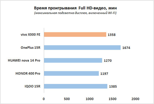 В нашем стандартном тесте с воспроизведением Full HD-видео с максимальной яркостью экрана и включенным Wi-Fi vivo X300 FE продержался немногим менее суток.