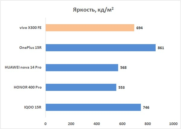 Согласно нашим измерениям (автояркость отключена, замеры проводятся при искусственном свете ламп накаливания) предельная статическая яркость составляет 694 кд/м2. Экран тут даже ярче, чем у vivo X300 Pro, причем формальный результат при измерении «статики» подтверждается и заявленным динамическим пиком — 5000 кд/м2 (у Pro-версии — 4500 кд/м2). Смартфоном комфортно пользоваться при любом освещении. Более того, автоматическая настройка яркости работает корректно, экран не становится слишком темным в соответствующих условиях.
