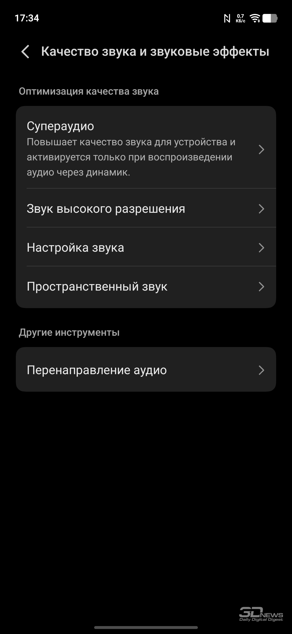Со звуком ситуация вполне ожидаемая с поправкой на аппаратную платформу Qualcomm. Стереодинамики не выделенные, а гибридные (работает пара «разговорный + отдельный»), но по громкости и в целом качеству звучания вопросов нет. Мини-джека нет, без проводов звук передается по Bluetooth последнего стандарта (6.0), есть поддержка профилей LDAC, LHDC и aptX. Сертификация Dolby Atmos отсутствует.