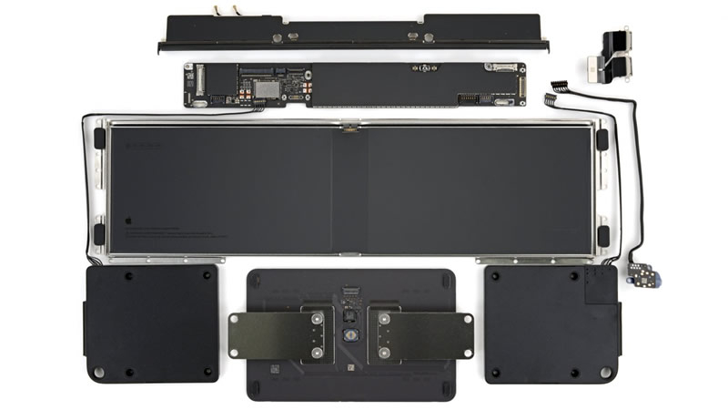 Несмотря на использование фирменных винтов Pentalobe, процесс вскрытия устройства оказался простым, а внутри была обнаружена довольно рациональная компоновка деталей. Но главным достижением инженеры назвали способ крепления аккумулятора, который не приклеен к корпусу, как в большинстве современных моделей, а удерживается 18 винтами, обеспечивая лёгкий доступ к нему в случае необходимости замены.
