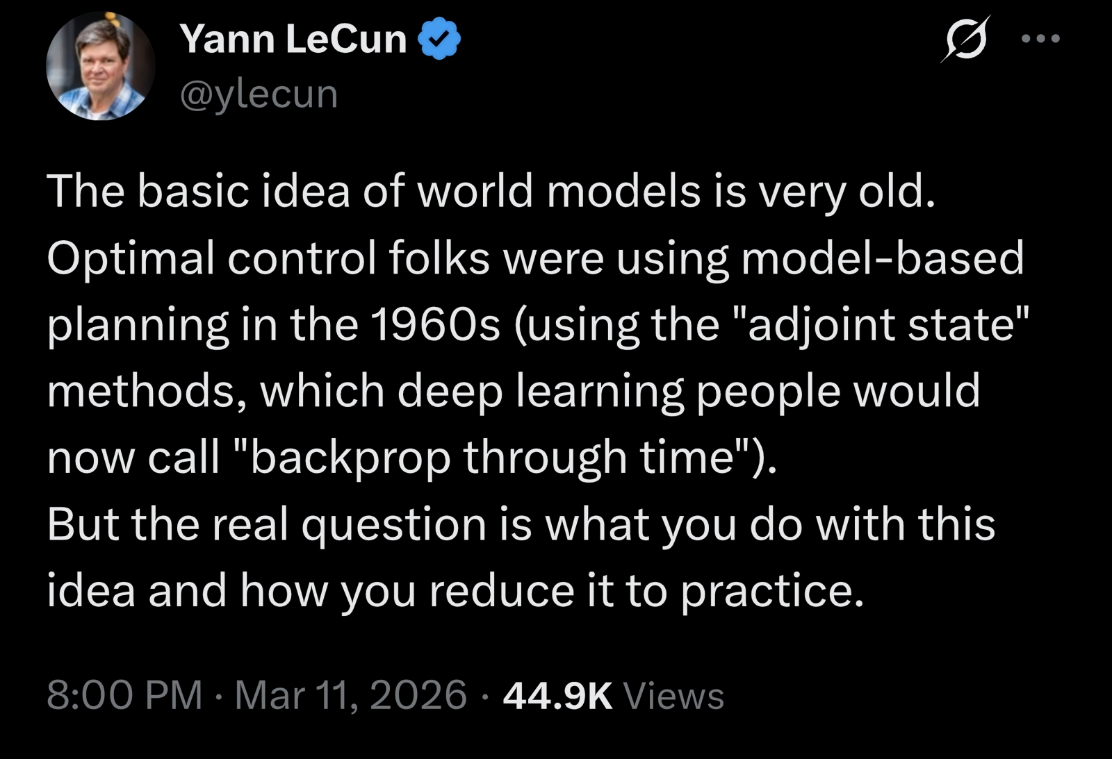 Метод сопряжённых состояний (adjoint state method) в машинном обучении, о котором упоминает Лекун в этом твите, действительно восходит к теории оптимального управления, развивавшейся в середине прошлого века Львом Понтрягиным и его учениками. См. «принцип максимума Понтрягина»: отыскание наилучшего возможного управления для перевода динамической системы из одного состояния в другое, особенно при наличии ограничений на состояние или входные элементы управления (источник: X) ⇡#Молви «ДРУГ», и войдёшь в модель мираВ конце 2025 г. Ян Лекун (Yann LeCun), известный пионер в области искусственного интеллекта, лауреат премии Тьюринга, гражданин США и Франции, благоразумно оставил экстремистскую Meta✴* — в очередной раз высказав свою убеждённость в том, что БЯМ, при всей своей привлекательности для решения множества прикладных задач с точки зрения разработки AGI, путь откровенно тупиковый. И уже в середине марта 2026-го его стартап Advanced Machine Intelligence Labs, или попросту AMI (созвучно французскому слову «друг»), занятый как раз изысканиями в области сильного ИИ, объявил о привлечении внушительной суммы в 1,03 млрд долл. США начального финансирования. Инвесторы при этом оценили стоимость основанной не далее как в январе компании со штаб-квартирой в Париже и офисами в Нью-Йорке, Монреале и Сингапуре в 3,5 млрд долл. Заниматься же AMI намерена разработкой «моделей мира» (world models) для обучения ИИ прогнозным представлениям о среде, в которой ему придётся оперировать, на основе наблюдений за реальным миром. О нешуточном интересе к такому неординарному пути развития — и заодно о нарастании скепсиса инвесторов по части классического, экстенсивного накачивания БЯМ всё новыми триллионами параметров без кардинального пересмотра самой парадигмы их тренировки — говорит список участников первого раунда финансирования AMI. В него вошли не только крупные фонды — Cathay Innovation, Greycroft, Hiro Capital, HV Capital, Bezos Expeditions (через последний выделяет фактически персональные средства на приглянувшиеся проекты основатель Amazon Джефф Безос, Jeff Bezos), — но и большие компании вроде Nvidia, Toyota и Samsung; заодно проголосовали личными деньгами за новый путь к AGI «отец Всемирной паутины» Тим Бернерс-Ли (Tim Berners-Lee) и бывший топ-менеджер Google Эрик Шмидт (Eric Schmidt). Степень растущего беспокойства в отношении верности экстенсивного курса на развитие ИИ (продвигаемого настойчивее прочих, пожалуй, OpenAI и лично Сэмом Альтманом, Sam Altman) подчёркивает величина разрыва между той суммой инвестиций, которую изначально планировал привлечь Лекун в первом туре финансирования, — 500 млн евро или около того, — и финальным результатом: 890 млн евро; те самые 1,03 млрд долл. В результате AMI оказалась в настолько выгодном положении, что самостоятельно может выбирать, от кого именно привлекать средства (и, соответственно, какими обязательствами перед инвесторами себя связывать), — роскошь, которую обычно ИИ-стартапы не могут себе позволить. Теперь, надо полагать, ничто не помешает Лекуну продолжить моделировать миры — чем он, собственно, занимался ранее годами, — и рано или поздно на деле подтвердить справедливость своего подхода к созданию AGI. Подход же этот заключается в следующем: вместо пошагового авторегрессионного (с добавлением определённой доли стохастики) предсказания того, каким должен быть следующий токен в генерируемой моделью цепоч