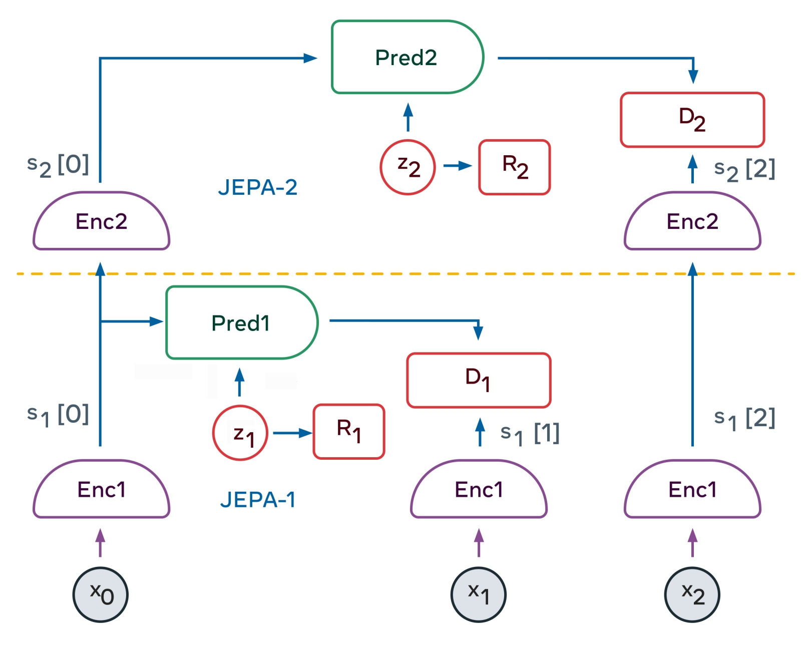В результате JEPA получает возможность прогнозирования в абстрактном — латентном — пространстве, а не на уровне токенов, что делает формируемые модели мира более устойчивыми, менее подверженными галлюцинациям. Выявление внутренних абстракций и способность к структурированному многошаговому рассуждению выводит такие модели мира на уровень «системы 2» по Канеману, а интеграция скрытых переменных упрощает обработку неопределённых входных данных, создавая сразу веер прогнозов, учитывающих различные возможности, — то есть множество правдоподобных, каждый в своей степени, вариантов будущего.