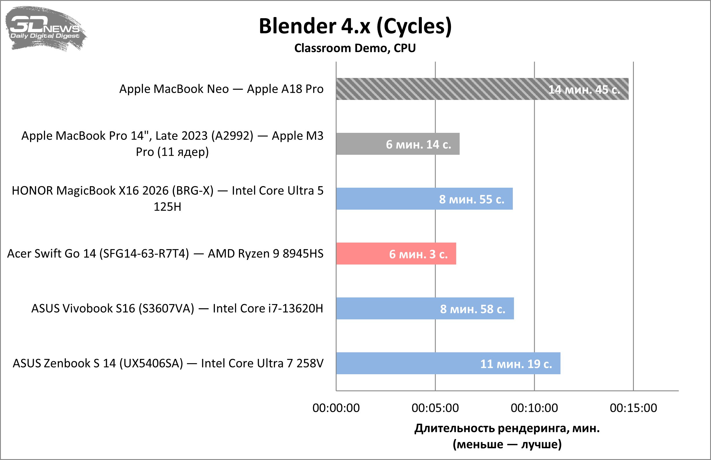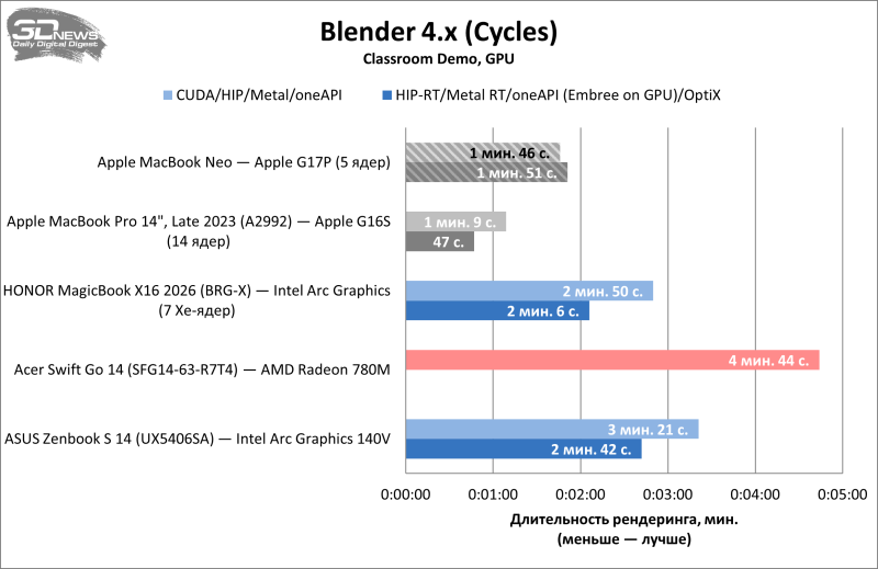 В Cinebench R23 свежий MacBook Neo оказался быстрее старого MacBook Pro на процессоре Apple M1, причём по части однопоточной производительности преимущество оказалось почти двукратным. Да и в целом по этому показателю Apple A18 Pro способен потягаться с любым современным ноутбучным процессором. Многопоточная же производительность ожидаемо оставляет желать лучшего — новинка Apple примерно вдвое медленнее конкурентов.