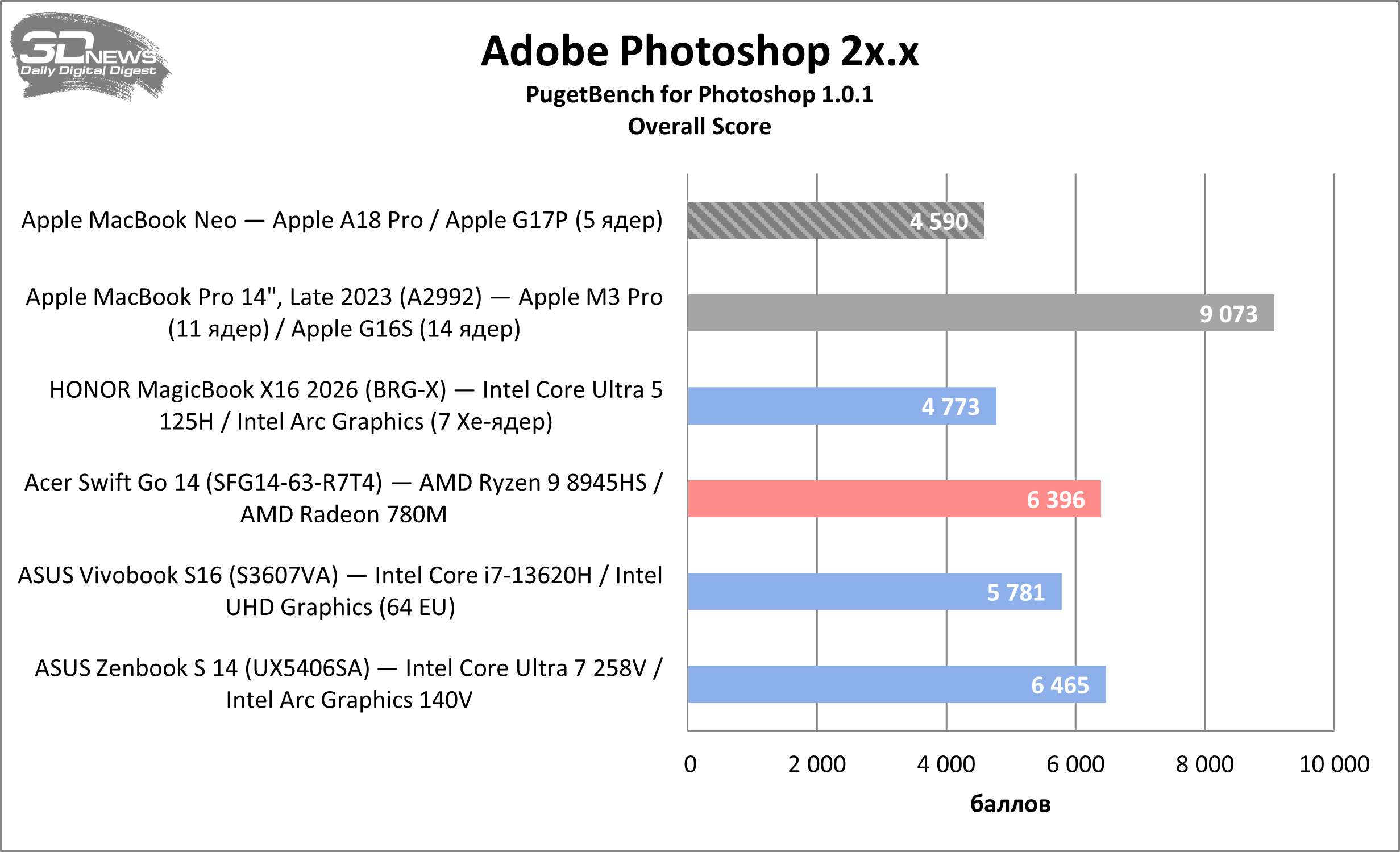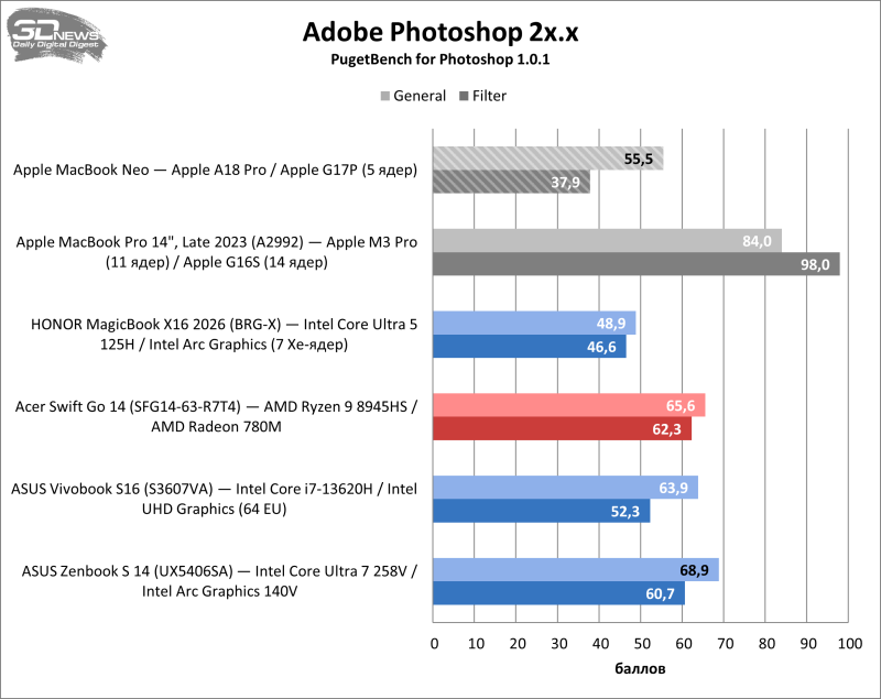 Из пакета бенчмарков PugetBench, которые оценивают производительность системы в реальных сценариях использования популярных приложений для творческой работы, новый MacBook осилил лишь один — Adobe Photoshop. При этом результат оказался вполне приемлемым — чуть слабее показателей современных ноутбуков на Windows.