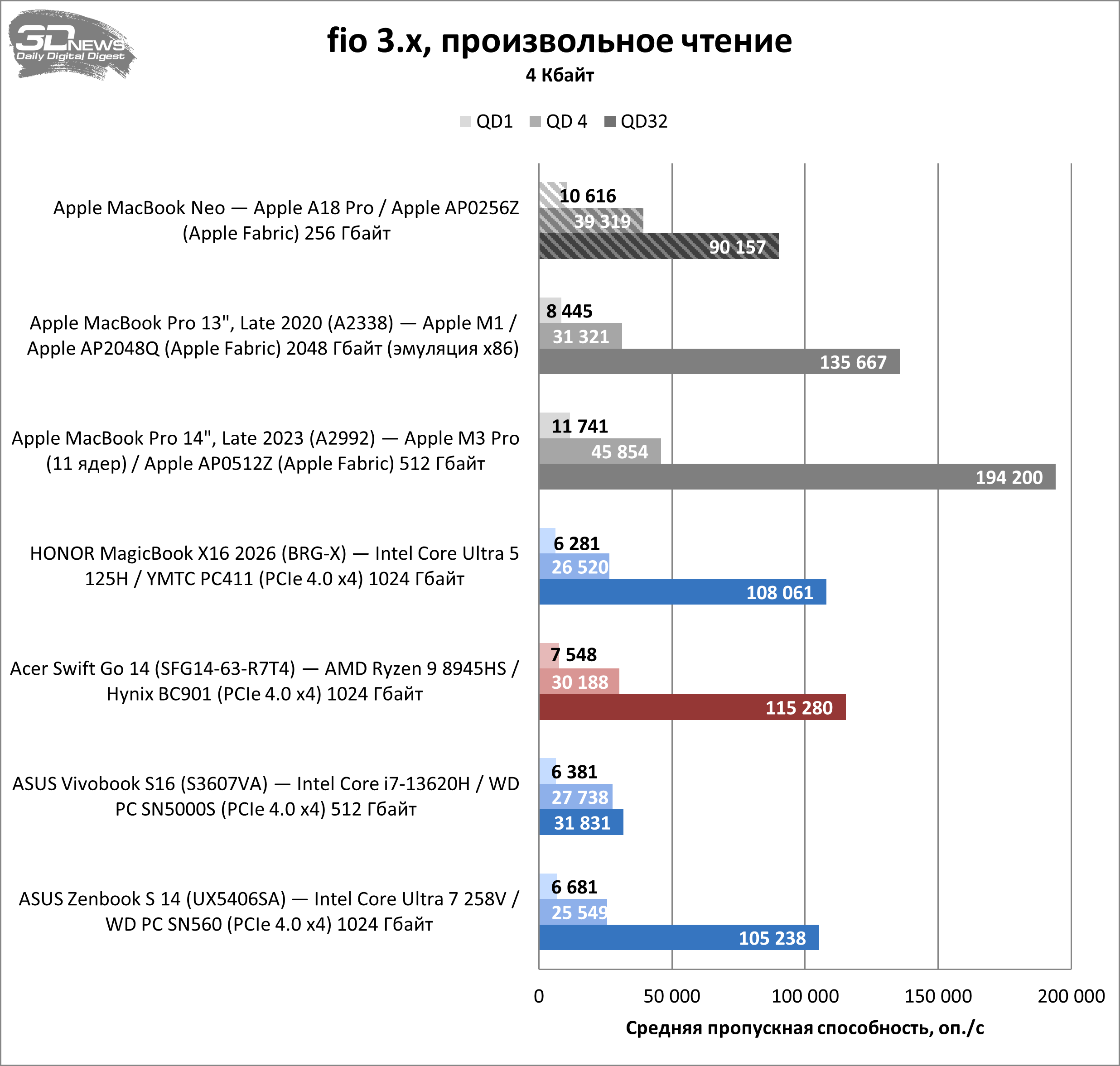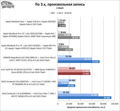 Попавший ко мне на тест MacBook Neo оснащён твердотельным накопителем ёмкостью 256 Гбайт, который построен на флеш-памяти 3D TLC NAND со скоростью 1200 МТ/с производства компании Kioxia. Столь скромный объём сам по себе существенно ограничивает производительность твердотельного накопителя, что в сочетании с не самой скоростной памятью даёт закономерный результат.