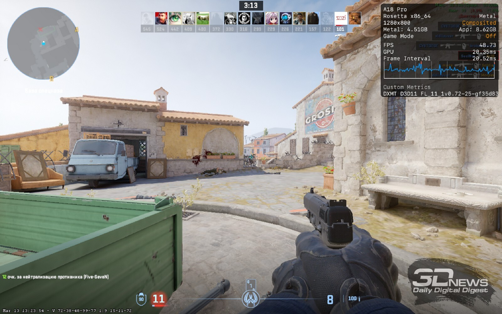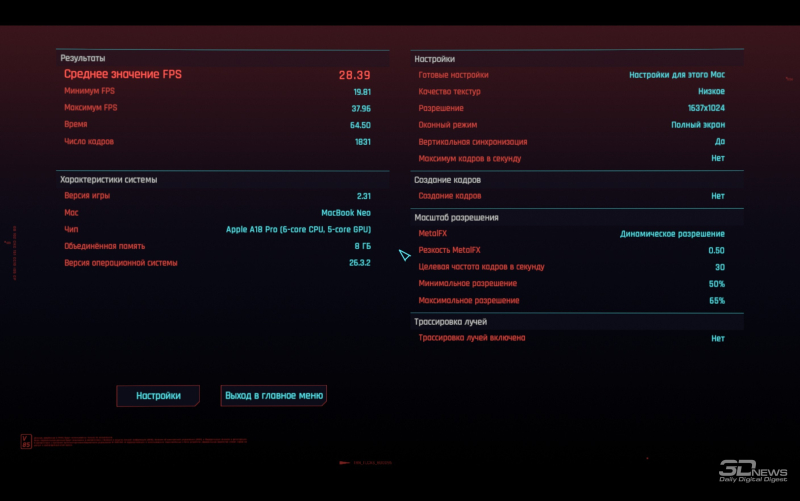 В моей библиотеке игр нашлось не так много тайтлов с версиями для macOS. Пожалуй, самым современным и передовым с точки зрения графики среди них является Cyberpunk 2077, и MacBook Neo на удивление неплохо справился с этой игрой. С рекомендованными настройками качества графики — то есть когда всё выкручено на минимум, а разрешение рендеринга меняется динамически — удалось получить среднюю частоту в 28 кадров/с. При этом в основном показатель держался около 30 кадров/с, с не слишком частыми просадками и фризами. А вот с профилем настроек «Низкие» средняя частота опустилась чуть ниже 26 кадров/с.