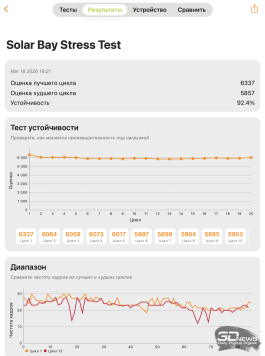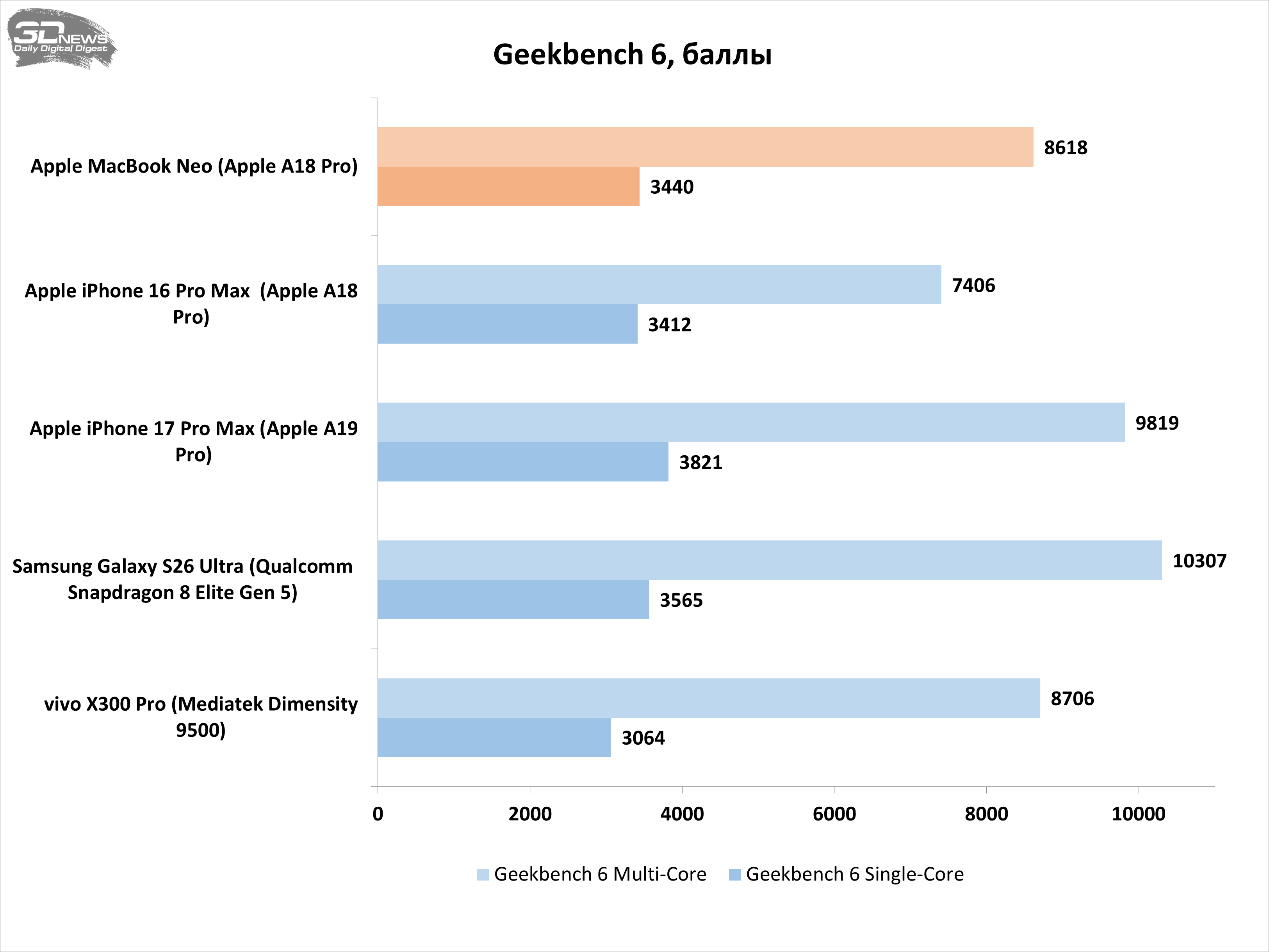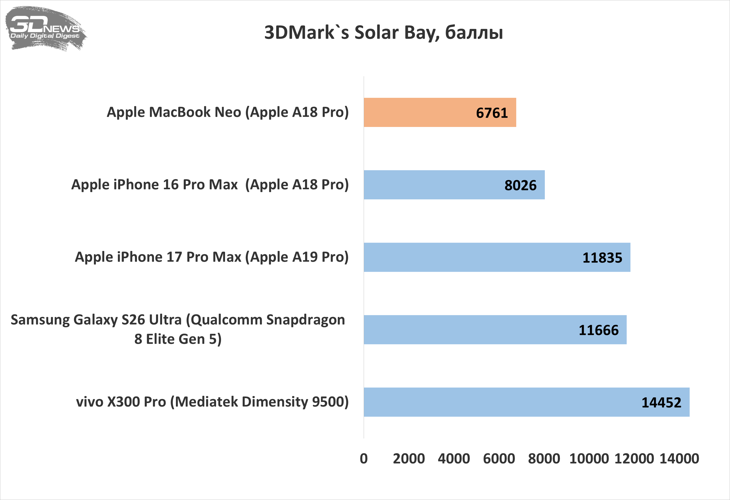 Поскольку Apple A18 Pro — изначально платформа для смартфонов, мне показалось интересным сравнить MacBook Neo с современными флагманскими смартфонами в парочке синтетических бенчмарков. В целом результаты ожидаемые: в многопоточном тесте Geekbench чип A18 Pro в ноутбуке оказался быстрее такого же чипа в iPhone 16 Pro Max благодаря лучшему охлаждению, но ожидаемо отстал от A19 Pro и Snapdragon 8 Elite Gen 5. В графическом тесте 3DMark Solar Bay ноутбучный вариант A18 Pro оказался медленнее смартфонного, что логично, ведь у него пять ядер GPU, тогда как у чипа iPhone 16 Pro Max — шесть.