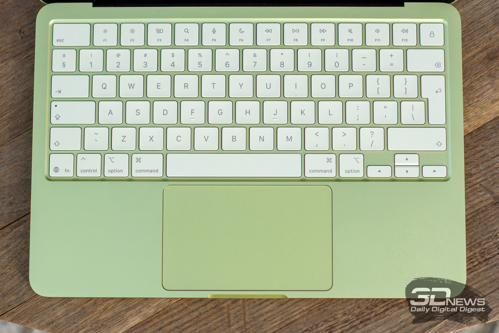 В отличие от старших MacBook с их чёрными клавиатурами, клавиши здесь выполнены в более светлом оттенке цвета самого ноутбука. И тут хочу отметить небольшую странность: вживую клавиши на моём жёлто-зелёном MacBook Neo оказались скорее белыми с лёгкой желтизной, но никак не жёлтыми, какими изображает их Apple на своих рекламных материалах.