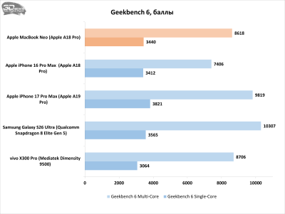 Поскольку Apple A18 Pro изначально является смартфонным чипом, было бы странно ожидать от него выдающихся результатов в бенчмарках, предназначенных для тестирования компьютерных процессоров. Тем не менее определённые сюрпризы MacBook Neo преподнёс.