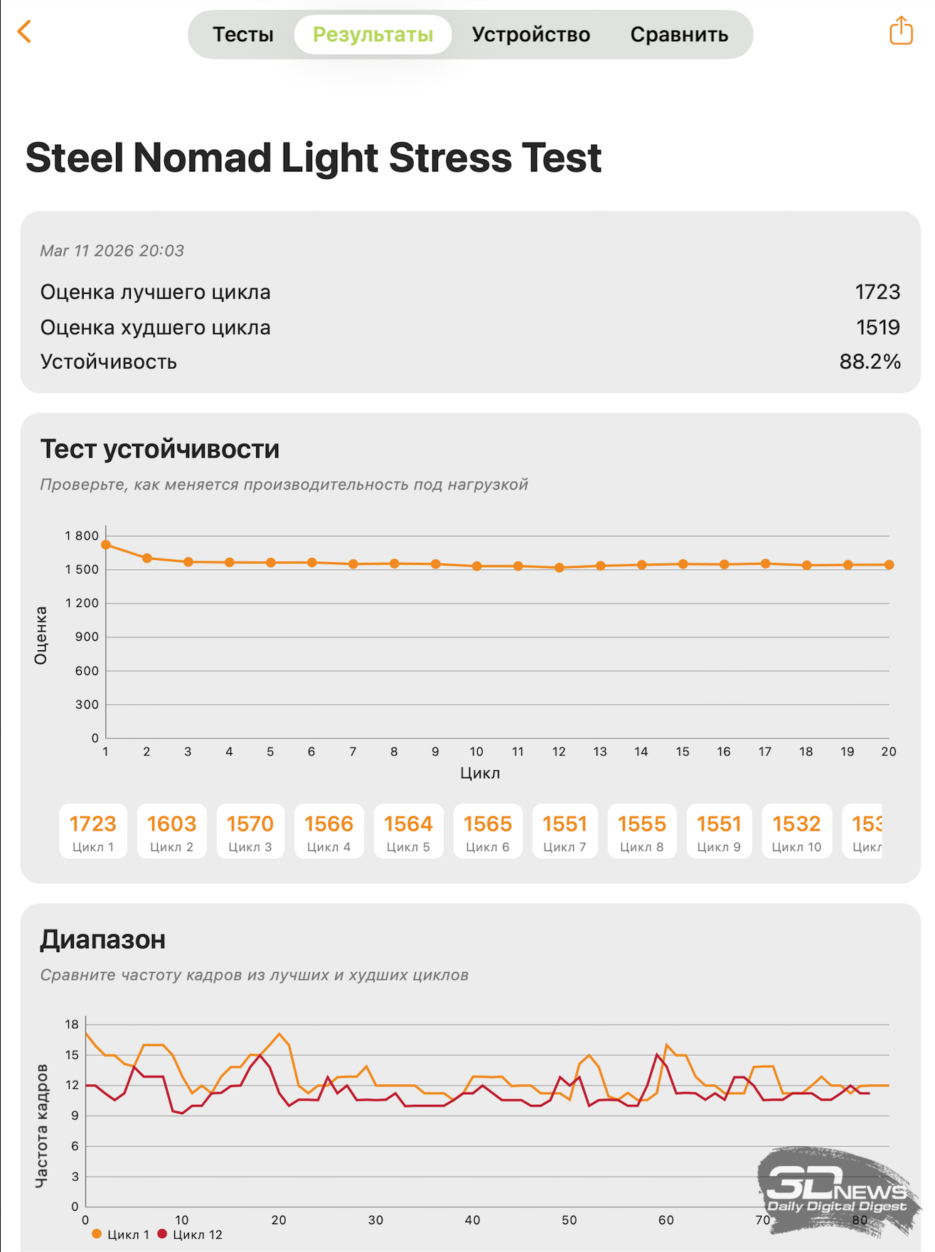 Тем не менее при серьёзной продолжительной нагрузке процессор начинает сбрасывать частоты, чтобы избежать перегрева. Ресурсные тесты пакета 3DMark показали снижение производительности на 10–12 %, причём просадка наблюдается уже после первого прогона, но далее производительность остается стабильной.