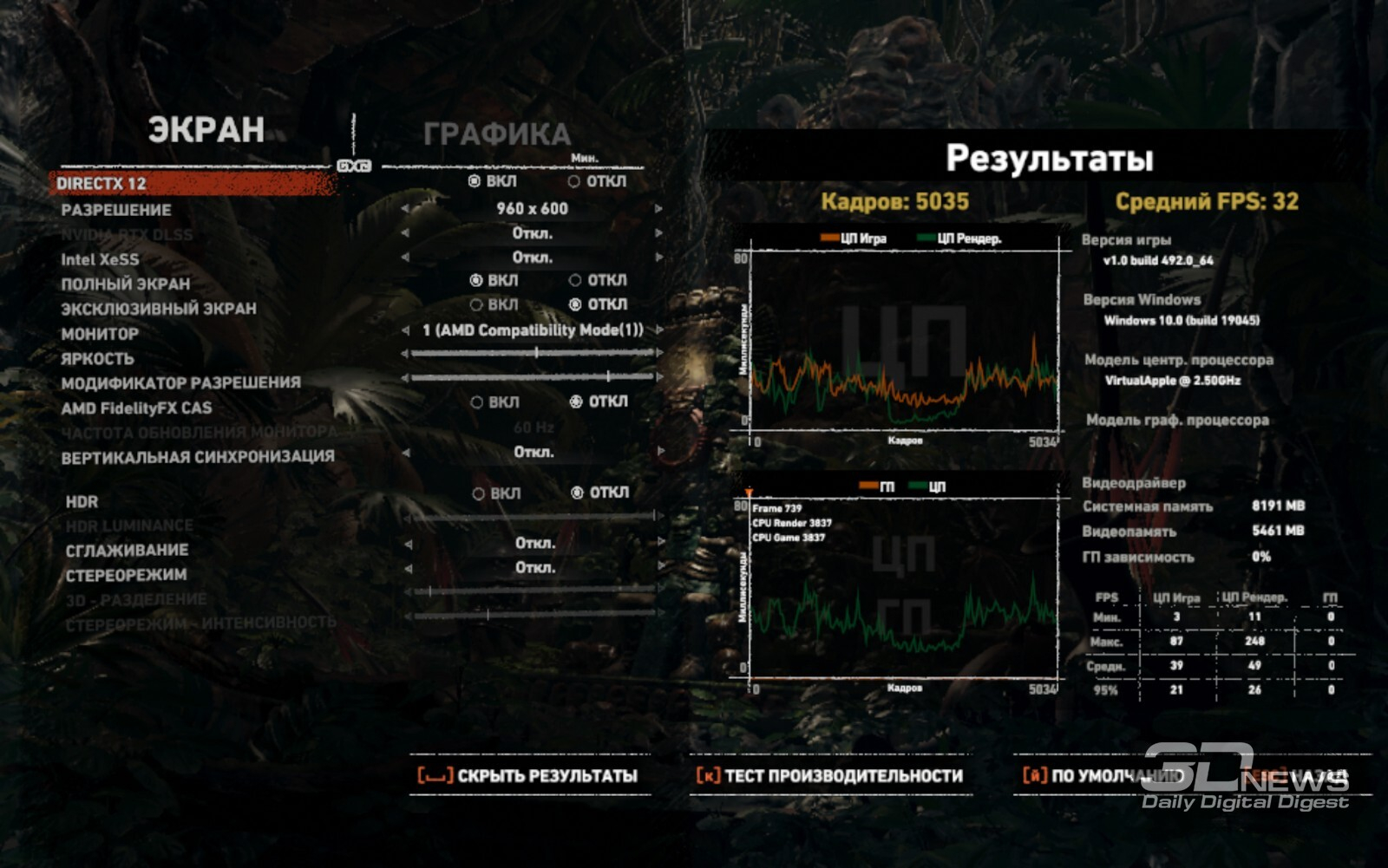 Например, в Sifu компьютер продемонстрировал в среднем около 55 кадров/с при высоких настройках качества и разрешении 1408 × 881 пиксель. А в Shadow of the Tomb Raider, чтобы получить в среднем 32 кадра/с, пришлось снизить разрешение до мизерных 960 × 600 пикселей — и всё равно сохранялись фризы. Вполне неплохо система справилась с GTA V — в разрешении 1406 × 1126 пикселей с минимальными настройками графики частота кадров в городе составила около 45 кадров/с, а за городом временами подскакивала выше 90 кадров/с. Наконец, Counter-Strike 2 оказалась практически неиграбельной из-за фризов и постоянных просадок частоты кадров, хотя в среднем держалась у отметки около 50 кадров/с.