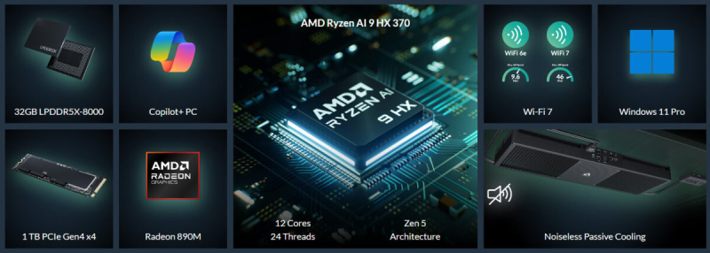 Senza AI 370 поставляется с 12-ядерным 24-поточным процессором Ryzen AI 9 HX 370, интегрированной графикой Radeon 890M, 32 Гбайт оперативной памяти LPDDR5X-8000 и твердотельным накопителем PCIe Gen4 объёмом 1 Тбайт. Сетевые возможности представлены беспроводным интерфейсом Wi-Fi 7 и адаптером Ethernet 2,5 Гбит/с.