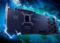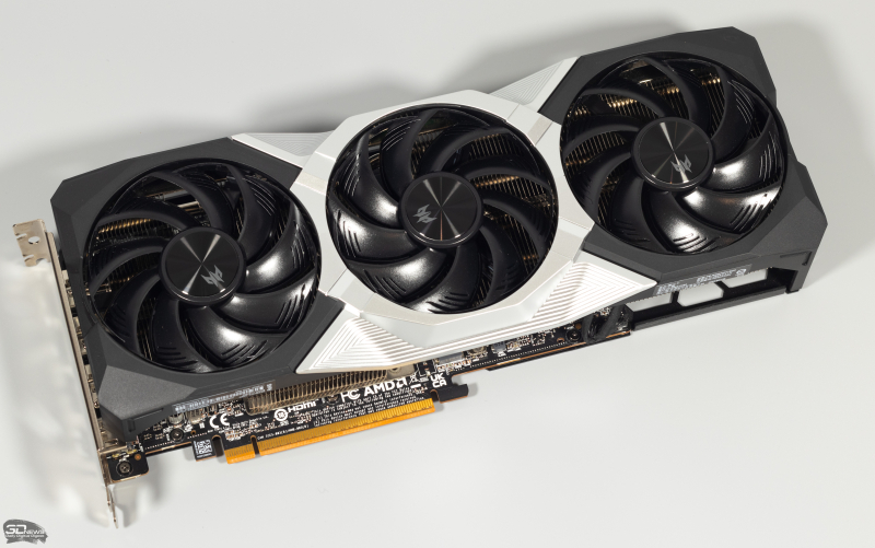 Перед нами крупная видеокарта, которая насчитывает 308 мм в длину (с учетом монтажной планки) и занимает больше двух слотов расширения в корпусе ПК. В отличие от Acer Nitro, эта разновидность Radeon RX 9070 XT имеет светодиодную подсветку, но неброскую: светится только логотип Predator на кожухе системы охлаждения.