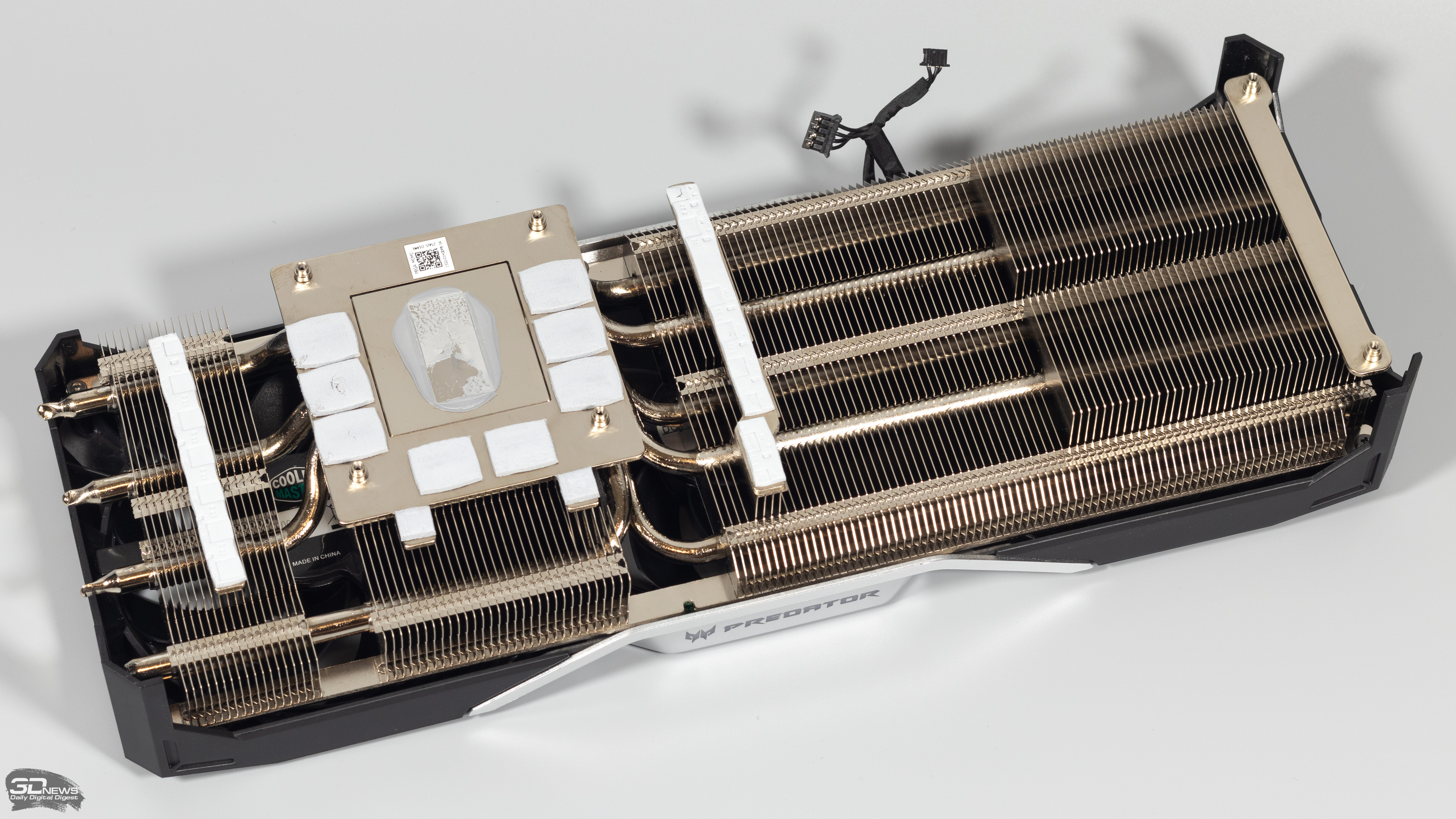 Систему охлаждения обслуживают три вентилятора с диаметром крыльчатки 88 мм. Радиатор состоит из трех блоков ламелей, нанизанных на шесть теплотрубок. Последние сходятся в пучок под теплосъемником GPU, а чипы видеопамяти и компоненты VRM накрыты собственными пластинами, напрямую припаянными к оребрению.
