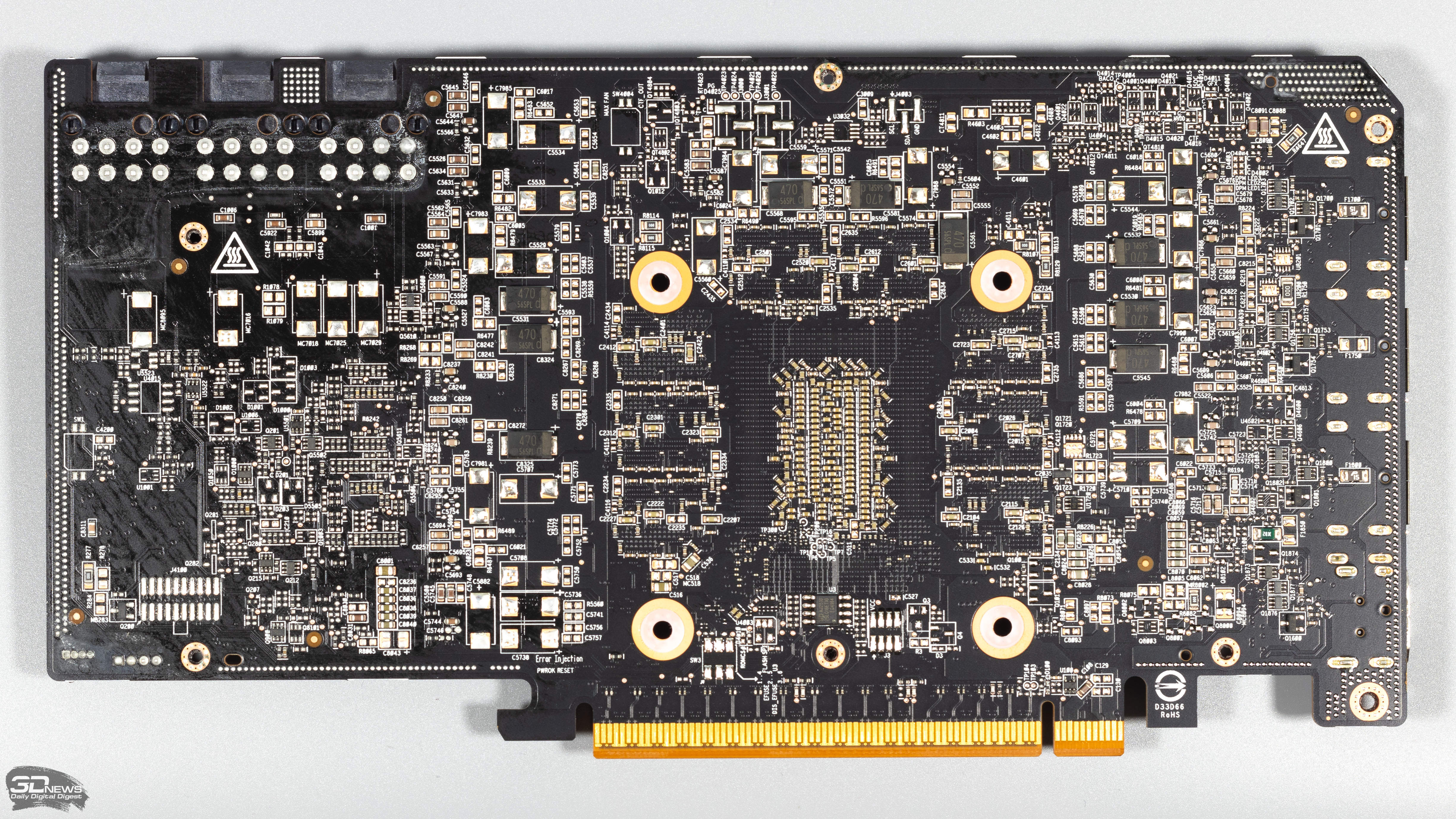 Алюминиевый бэкплейт выполняет только защитную функцию и не способствует охлаждению печатной платы, т. к. под ним нет никаких термопрокладок.
