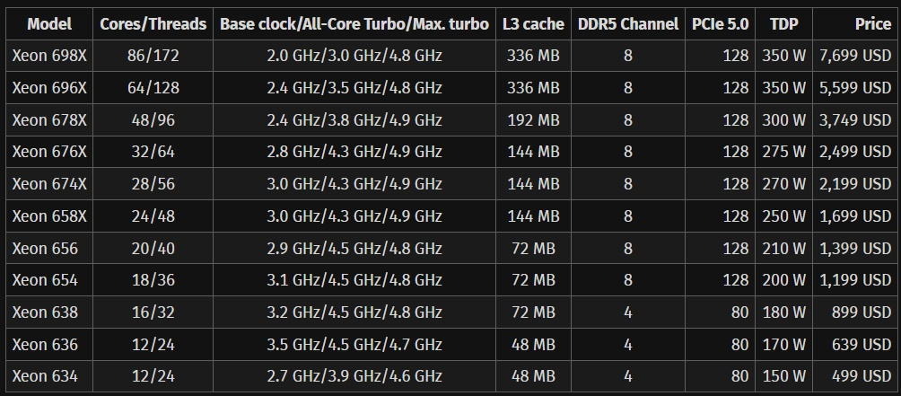 Процессоры Xeon 600 будут работать с новым чипсетом W890, и обеспечат поддержку до 4 Тбайт памяти ECC в восьми каналах со скоростью до 8000 МТ/с. Платформа также поддерживает до 128 линий PCIe 5. Сами процессоры легко масштабируются, используя микроархитектуру Redwood Cove. В процессорах Xeon 600 используются исключительно производительные P-ядра с поддержкой Hyper-Threading. Каждое ядро поддерживает технологию Intel AMX, инструкции FP16 и AVX-512.