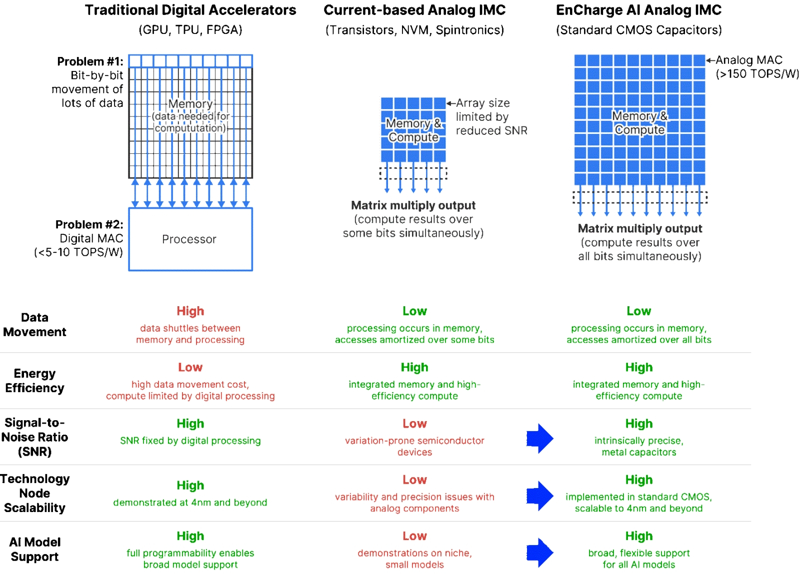 Заявленные преимущества аналоговых ёмкостных вычислений в памяти в сравнении с классическими цифровыми и с теми аналоговыми, что опираются на резистивные (сводящиеся к манипулированию токами — current-base, — а не зарядами) технологии (источник: EnCharge) ⇡#Цифра, аналог… Главное — результат!Навин Верма пришёл к идее использовать конденсаторы для вычислений, производимых непосредственно в памяти (IMC), ещё в 2017 году, и в значительной мере посвятил её проработке — при поддержке DARPA и TSMC, кстати, — деятельность возглавлявшейся им лаборатории Принстонского университета. Само по себе применение зарядов вместо токов в вычислительных системах практикуется не так уж редко; взять хотя бы основанные на компараторах переключаемые конденсаторы (comparator-based switched-capacitor — CBSC), прекрасно заменяющие собой операционные усилители с высоким коэффициентом усиления для широкого класса высокоточных схем с дискретизацией данных — включая аналого-цифровые и цифроаналоговые преобразователи, схемы выборки и хранения, интеграторы и фильтры. Нововведение Верма и его группы заключалось в том, чтобы разобраться, как именно применить столь многообещающие компоненты для реализации вычислений непосредственно в памяти. Подчеркнём снова, что ёмкость конденсатора со строго заданными параметрами жёстко фиксирована, так что для изготовленных на одной и той же подложке конденсаторов с идентичной в пределах погрешности геометрией ёмкости будут с огромной точностью совпадать. Тем самым в уравнении с двумя сомножителями — «заряд = ёмкость × напряжение» — первый можно считать константой для всех элементов физической нейросети в пределах даже не одного чипа, а всей их крупной партии или сразу целого поколения. В то время как полагающиеся на закон Ома — «сила тока = проводимость × напряжение» — резистивные ИИ-вычислители вынуждены иметь дело с куда более подверженной случайным колебаниям (от ячейки к ячейке) величиной, а именно с той самой проводимостью (обратным сопротивлением) отдельных элементов электрической схемы. Правда, в отличие от мемристорных и им подобных систем с опорой на переменные сопротивления, реализованную EnCharge схему трудно назвать полностью аналоговой: это обратная сторона того бесспорного их достоинства, что ёмкости раз и навсегда литографированных на кремниевой подложке наноконденсаторов фиксированы. Чтобы корректировать значения синаптических весов в реализуемой такой системой нейросети, приходится хранить данные о них в массиве ячеек памяти SRAM, каждая из которых подключена к соответствующему конденсатору. Необходимы также контуры (впрочем, конструктивно довольно простые) для преобразования поступающего на данный синапс тока — с учётом приписанного именно этой ячейке веса — в заряд определённой величины, который и будет сохраняться в наноконденсаторе. Однако сложение зарядов из ячеек, что соответствуют предыдущему слою глубокой нейросети, происходит уже естественным образом и фактически без потери качества (без накопления дополнительных паразитных шумов), что делает ёмкостный аналоговый (точнее, конечно, аналого-цифровой) ИИ-вычислитель привлекательнее множества предложенных к настоящему времени резистивных.