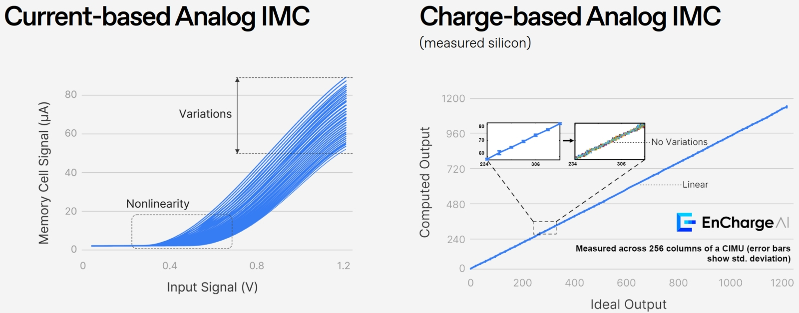 Серийный чип с PCM-ячейками для аналоговых ИИ-вычислений смотрится красиво, но на практике находит довольно ограниченный круг приложений (источник: IBM) Правда, пока что нет новостей о массовой замене в гиперскейлерских ЦОДах сверхэнергоёмких серверных стоек, забитых новейшими ускорителями Nvidia, экономичными аналоговыми вычислителями на основе PCM. Причин тому немало: это и несовершенство нынешних технологий изготовления крохотных ячеек из вещества, способного менять фазовое состояние под воздействием электрического тока (здесь опять же проявляет себя неизбежная микроскопическая неодинаковость даже двух соседних таких ячеек на одной и той же подложке), и присущий такому веществу естественный, пусть и крайне неторопливый, структурный дрейф (drift) от текущего его состояния — кристаллического или аморфного — к некоторому промежуточному (грубо говоря, по логарифмическому закону: сопротивление PCM-ячейки меняется со временем как log (t) с коэффициентом от 0,10 до 0,15), и ограниченная по спектру решаемых задач производительность. Последнее особенно важно с практической точки зрения: если в случае распознавания статичных образов энергоэффективность (производительность в пересчёте на затраченный ватт мощности) PCM-вычислителей действительно на полтора-два десятичных порядка превосходит таковую для классических ГП, то, например, при ведении живой беседы с оператором на естественном языке по этому показателю, напротив, изделия IBM привычным сегодня чат-ботам проигрывают — причём примерно с тем же счётом. В целом же для высокопроизводительных ИИ-приложений, где скорость обработки входных данных моделью имеет решающее значение, классическое «железо» продолжает оставаться вне конкуренции — по крайней мере, если сравнивать его с резистивными аналоговыми вычислителями. Оно хоть и прожорливо, зато априори универсально: в памяти машины, организованной по принципам фон Неймана, можно сэмулировать (был бы под рукой соответствующий алгоритм!) хоть чёрта лысого, — которого в аналоговом виде даже и не факт, что в принципе удастся когда-либо заполучить. Разработчики из упомянутого нами в самом начале стартапа EnCharge, видимо, искренне уверившись в бесперспективности резистивных аналоговых ИИ-вычислений, двинулись другим путём: вместо сопротивлений они сделали ставку на ёмкости. Сохраняемый плоским конденсатором заряд, как известно, равен произведению ёмкости этого электротехнического компонента на напряжение на его обкладках. При этом важно, что ёмкость данного конкретного конденсатора определяется только его физическими характеристиками: формой, размером и расстоянием между обкладками, а также свойствами размещённого между последними диэлектрика. Изготовление конденсатора на кремниевой подложке методами фотолитографии — задача, можно сказать, тривиальная: нужны всего лишь два плоских проводника и участок диэлектрика между ними. Чем больше площади проводников-обкладок и чем меньше расстояние между ними, тем выше ёмкость. Современные же методы производства полупроводников как раз и славятся высочайшей точностью, с которой могут выдерживаться геометрические параметры создаваемых на кремниевой подложке микро- и даже наноформаций. Собственно, ёмкостные чипы EnCharge на деле представляют собой гибридные, цифроаналоговые структуры: в н