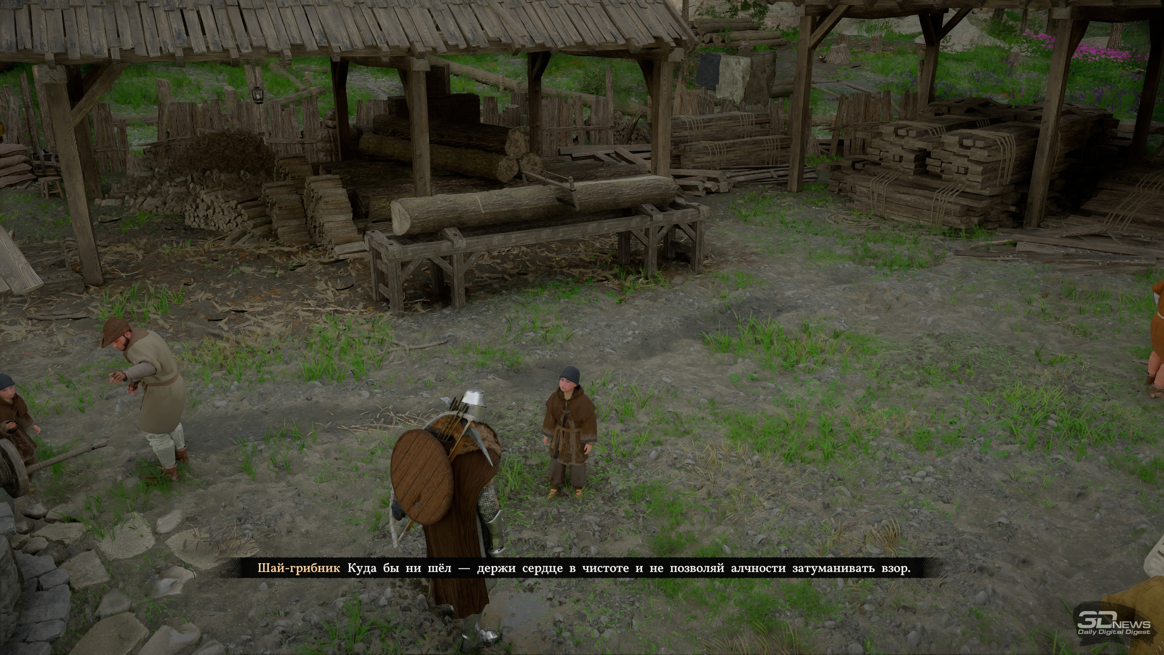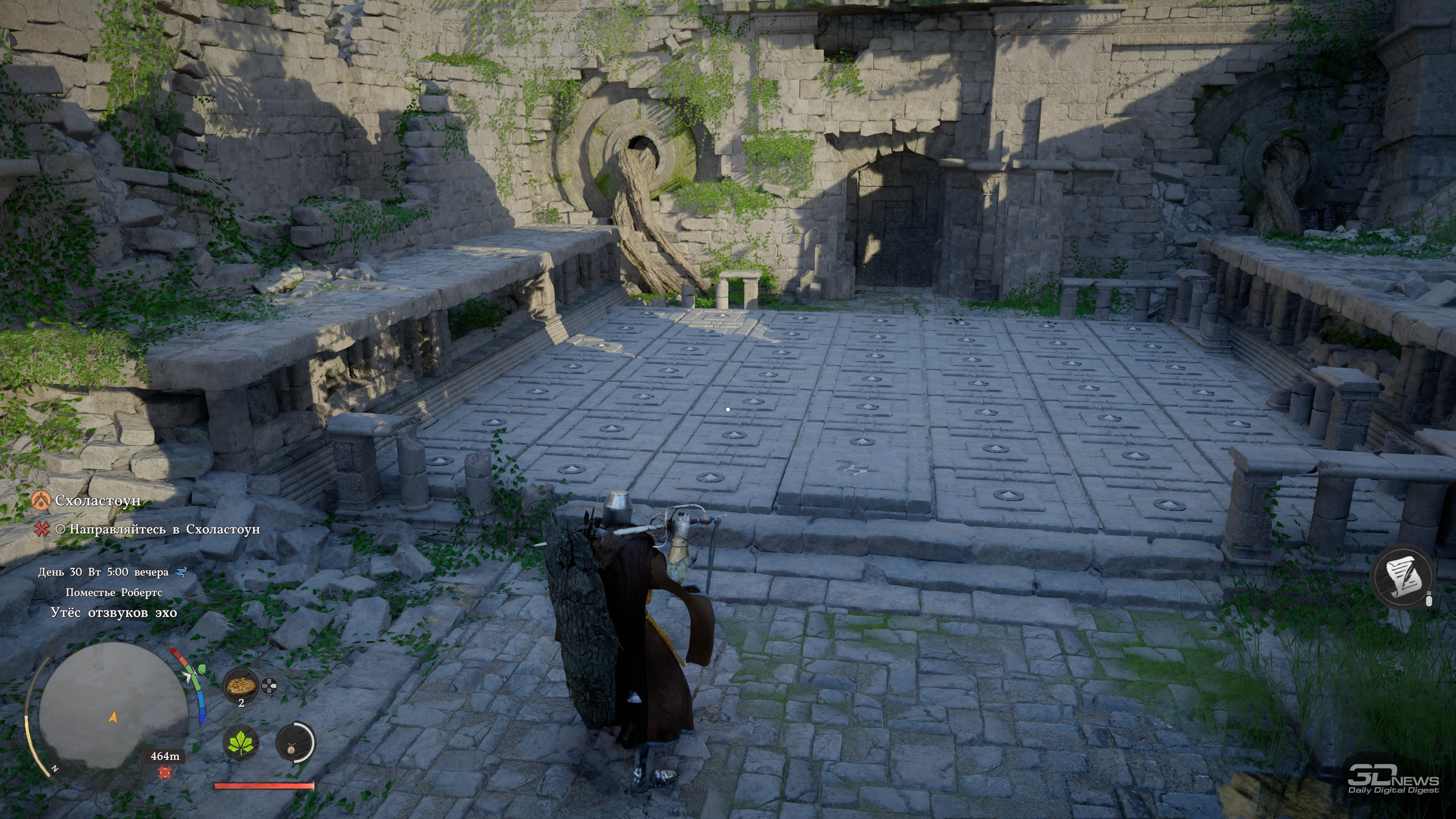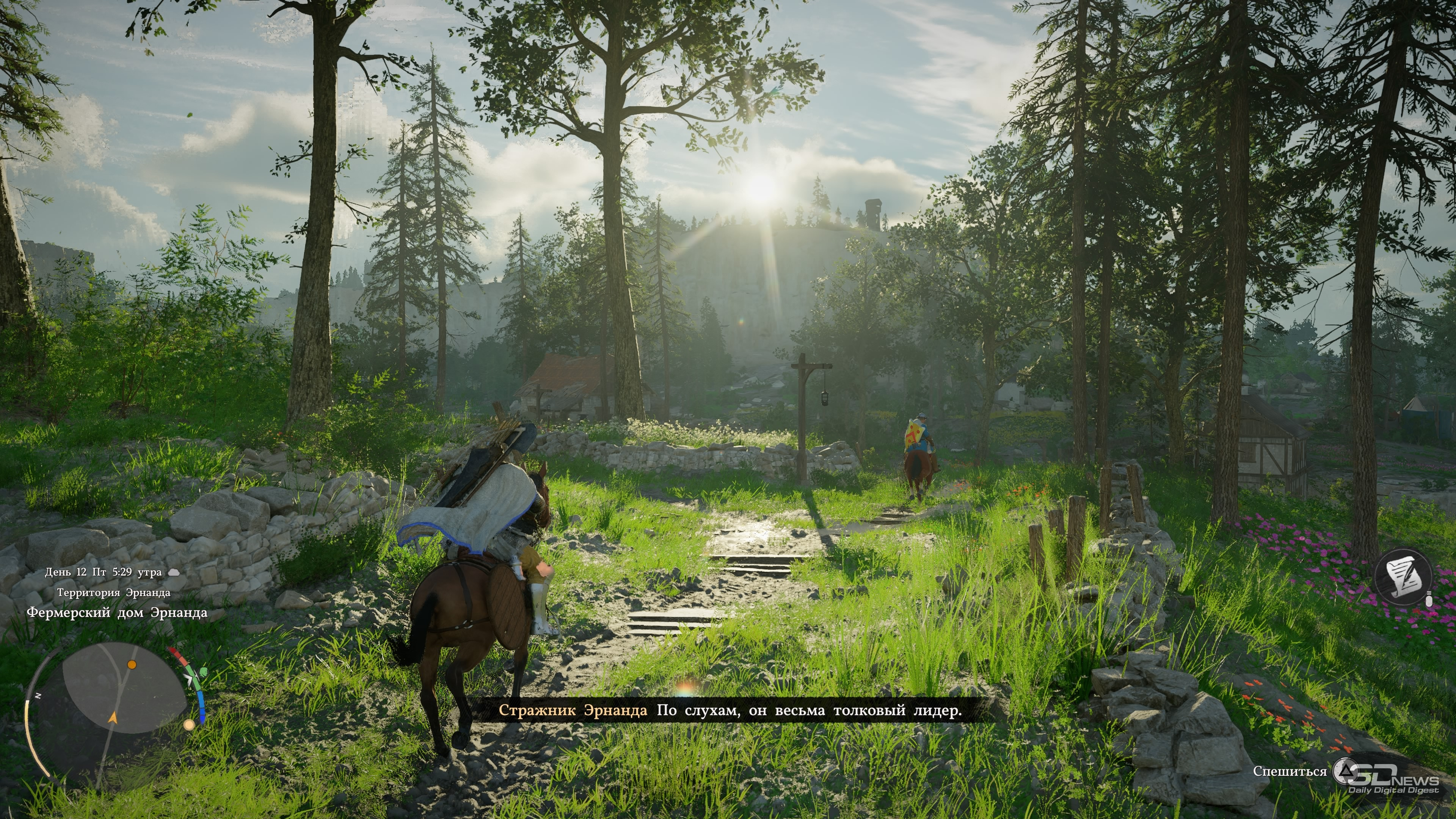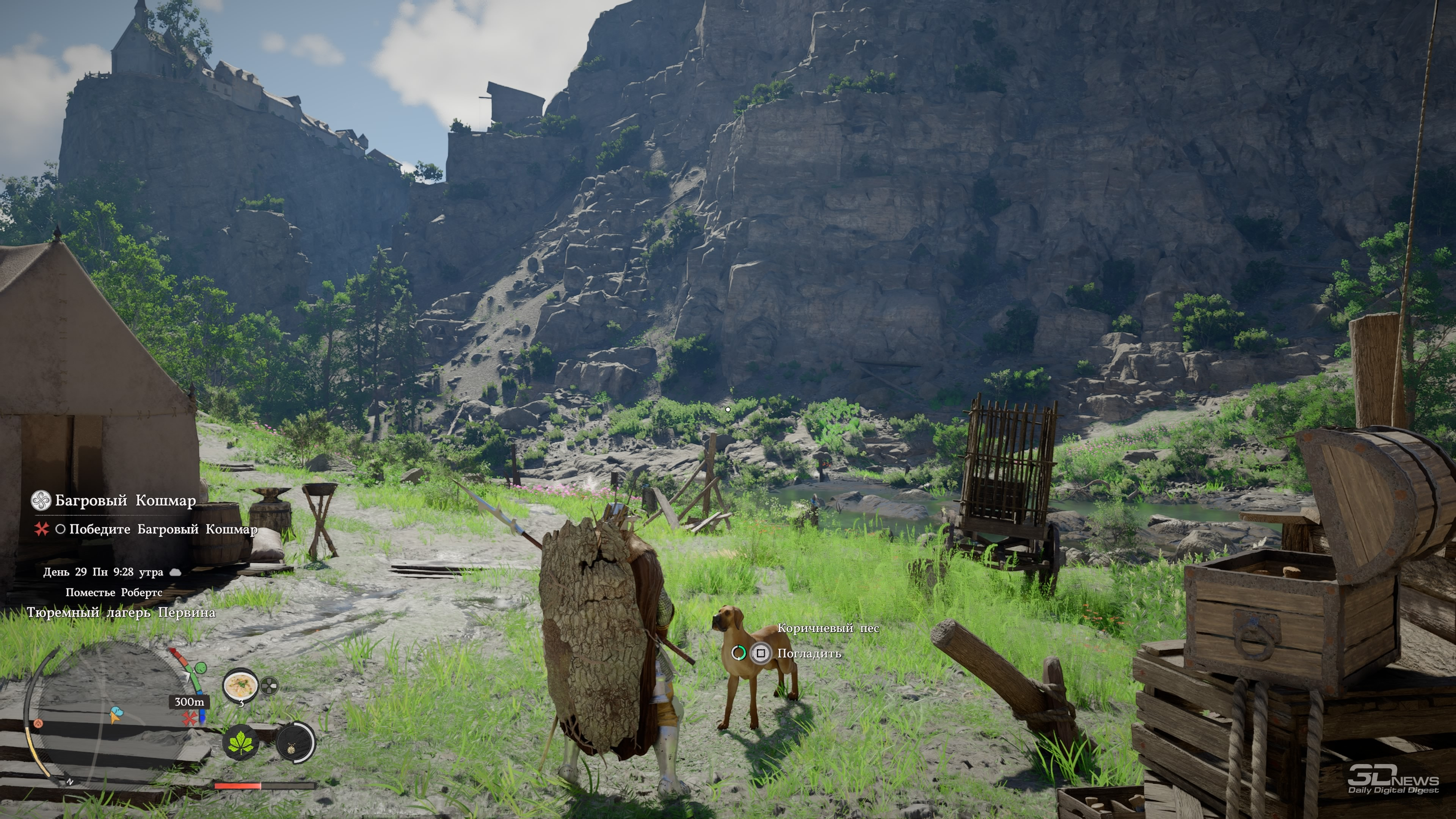 Играли на PlayStation 5 За первый час главный герой Crimson Desert успевает умереть, воскреснуть, попрыгать по летающим платформам, принять участие в армрестлинге, спасти забравшуюся на крышу кошку, буквально упасть с небес на землю и даже прочистить печную трубу хлипкого домика. До релиза игра казалась винегретом из всего, что придумала игровая индустрия за последние десятилетия — вступление лишь подтверждает эти догадки, помещая протагониста в не связанные друг с другом ситуации и обучая порой странным механикам. Но довольно быстро темп начинает снижаться, голова перестаёт болеть от обилия всплывающих подсказок и в Crimson Desert влюбляешься. Да так, что от неё не оторваться, а в раздражающих поначалу элементах со временем даже появляется смысл. ⇡#А я маленький такойМасштабы игры ощущаешь уже в первом городе Эрнанде: мини-карта усыпана «вопросиками», на улочках стоят торговцы с совершенно разными товарами, а на доске объявлений висят листочки с заданиями. Бегая между домами, кидаешь мелочь попрошайкам и видишь в углу экрана шкалу репутации — интересно, на что она влияет? Подходя к запертым дверям, читаешь всплывающую строку, сообщающую об отсутствии ключа. Получается, можно заходить в каждое здание? Возможно, за запертыми дверями лежит что-то ценное. Спустившись в канализацию, собираешь канделябры и вазы, надеясь их потом продать. А когда пытаешься взять что-то со стола у торговцев, появляется слово «Украсть», только кнопка неактивна. А как красть-то? И нужно ли это вообще делать? И это лишь первый город, маленький пиксель на карте мира, настолько огромной, что до недавнего патча Crimson Desert иногда «вылетала» на PS5 при попытке её открыть. Однако и в этом пикселе можно надолго застрять, участвуя в мини-играх, знакомясь со всеми торговцами и наполняя карманы всем, что плохо лежит. А когда покажется, что всё исследовано и можно двигаться дальше, это действительно может быть так — но впоследствии в этот город будешь регулярно возвращаться. И опять оставаться там на какой-то срок, потому что каждый раз будешь находить что-то новое. Про игры Ubisoft часто говорят, что в них трудно добираться до следующей сюжетной миссии, потому что по пути постоянно на что-то отвлекаешься. Если там это просто трудно, то в Crimson Desert это невероятно трудно. Причём дело не в размерах карты и необходимости преодолевать большие расстояния. Да, такое бывает, что следующий этап миссии расположен в двух километрах от вас, но даже если нужно пробежать всего 300 метров, всё равно туда доберёшься лишь через полчаса, а то и вообще решишь оставить этот квест на потом. Всё потому, что просто гулять по миру и исследовать его увлекательно само по себе — в нём пропадаешь и растворяешься, занимаясь всякой мелочью и получая от этого массу удовольствия. Один раз я пошёл выполнять сюжетный квест и всё-таки смог добраться до персонажа, с которым нужно было поговорить. Вдруг ко мне подбежал мальчик, оказавшийся юным монахом, и начал что-то рассказывать про загадочный лес и мистический гриб, который там растёт. В дневнике появилось побочное задание — я пошёл его выполнять. Там ожидал сюрприз, который привёл ещё к одному квесту, и он вообще не имел отношение к первым двум. Собирая в том же лесу всякие растения на продажу, я наткнулся на залежи руды, достал кирку и добыл ресурсы, вспомнив после этого, что как р