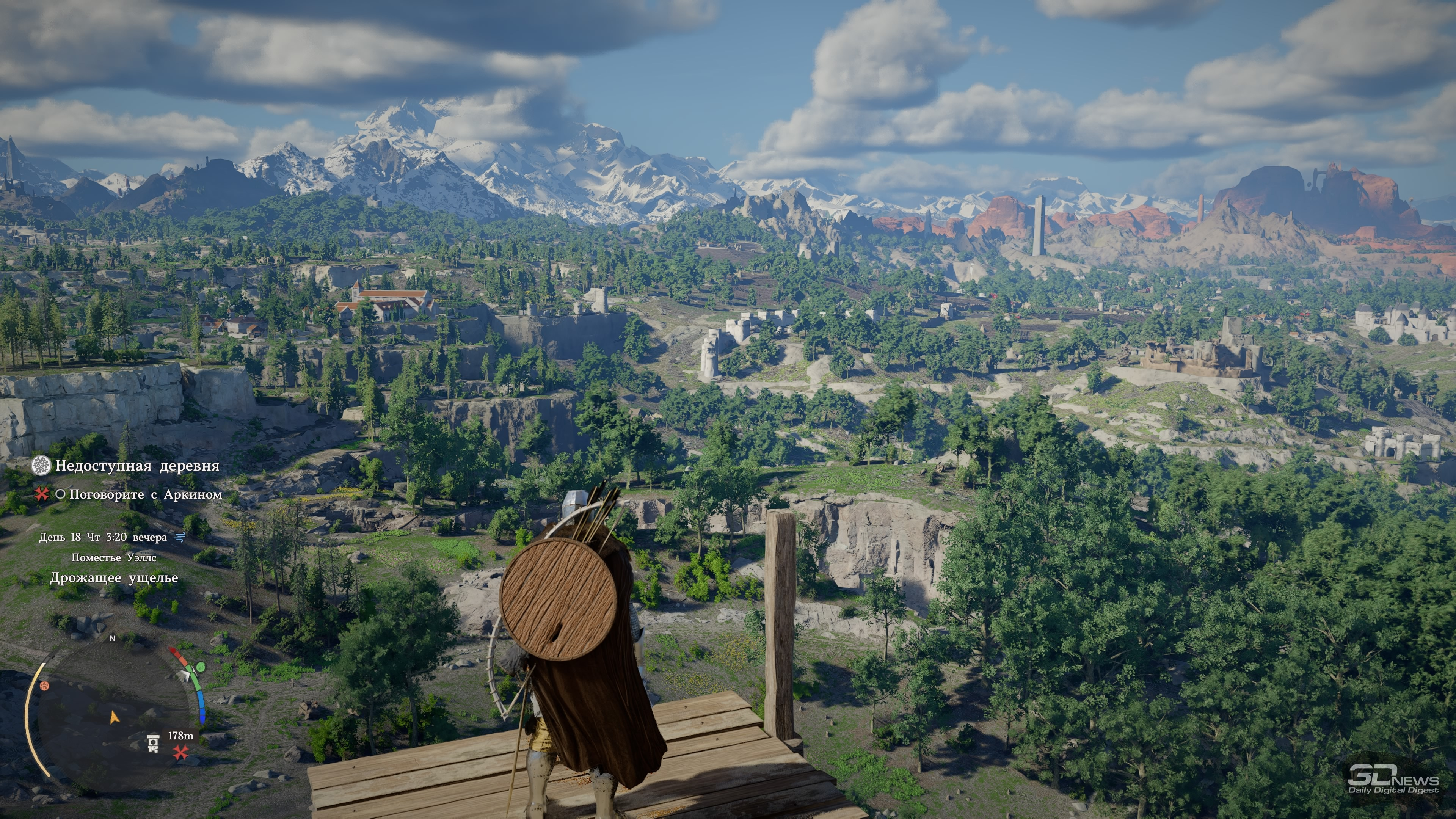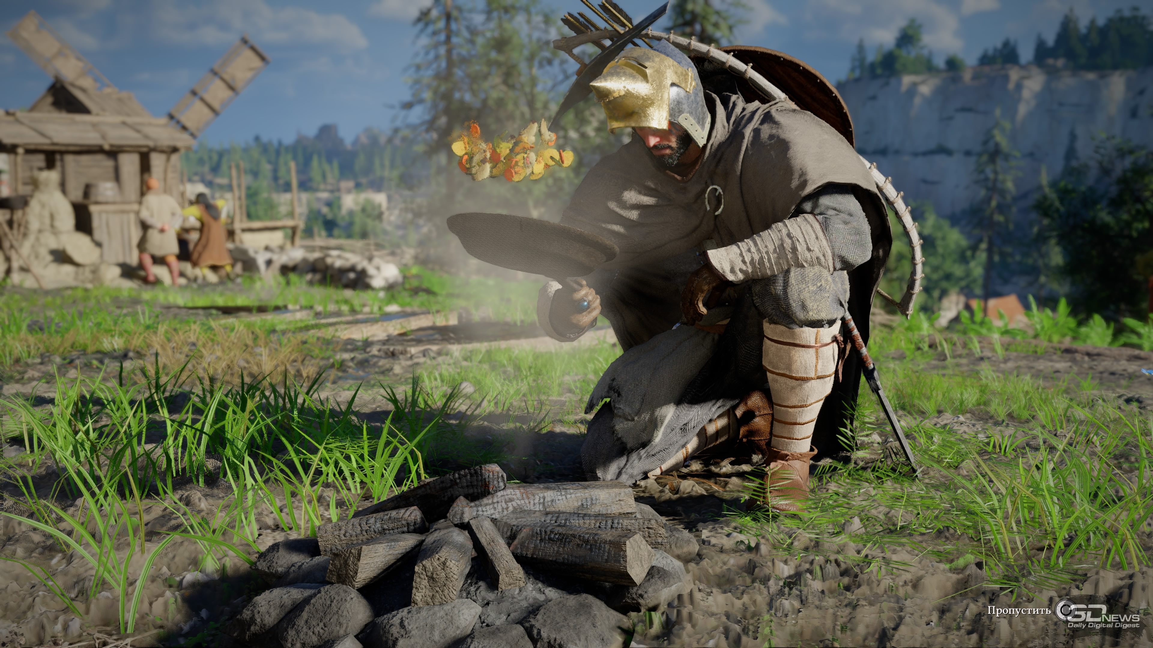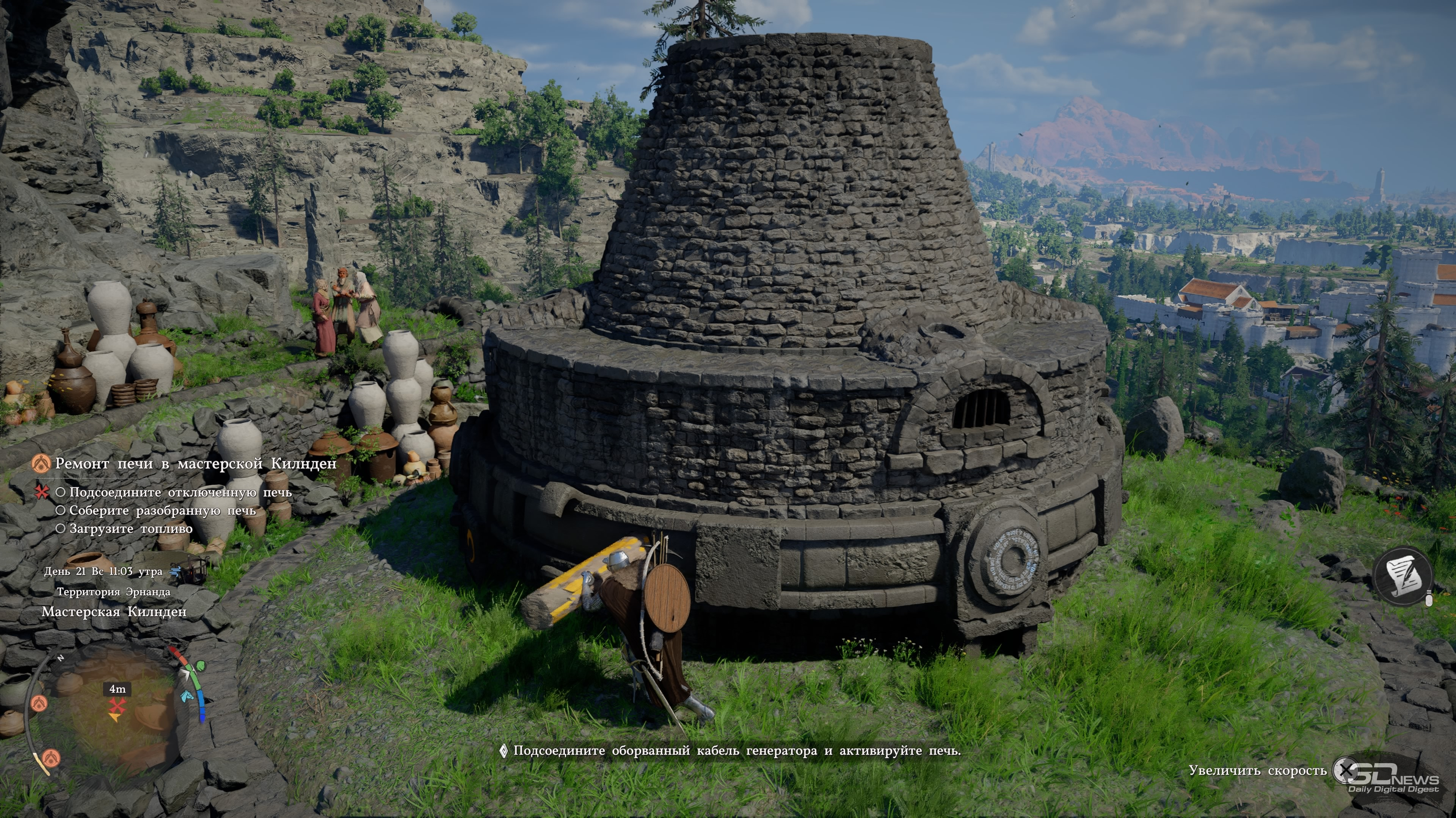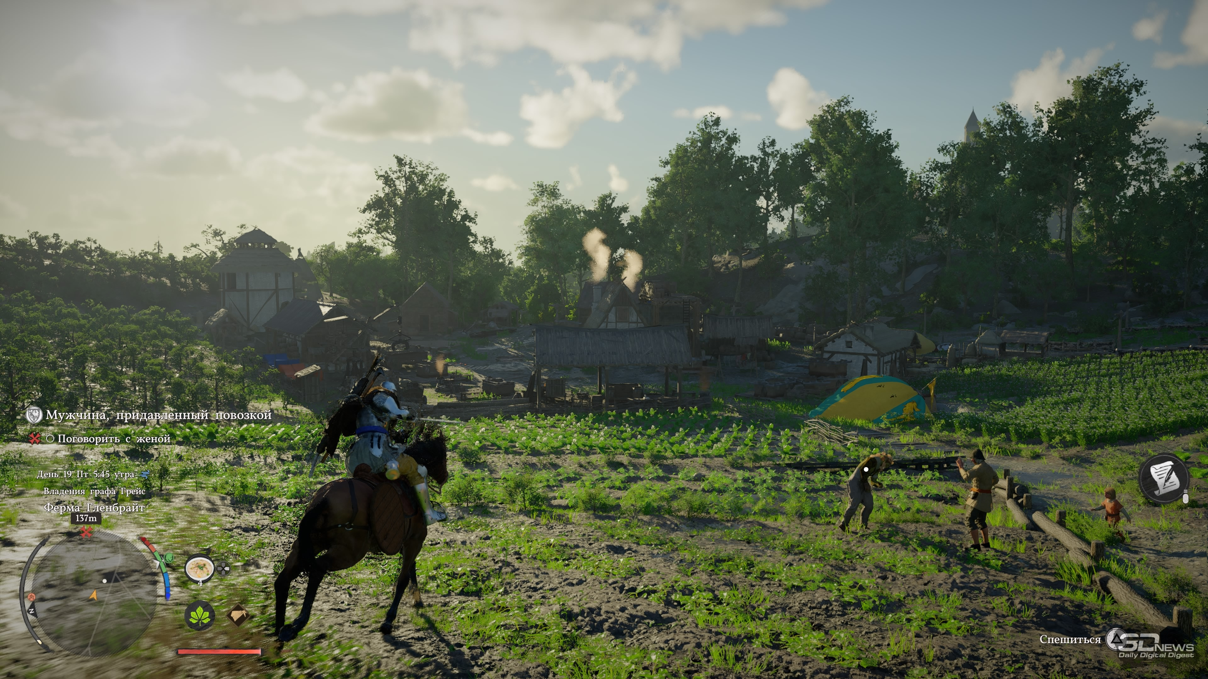 Играли на PlayStation 5 За первый час главный герой Crimson Desert успевает умереть, воскреснуть, попрыгать по летающим платформам, принять участие в армрестлинге, спасти забравшуюся на крышу кошку, буквально упасть с небес на землю и даже прочистить печную трубу хлипкого домика. До релиза игра казалась винегретом из всего, что придумала игровая индустрия за последние десятилетия — вступление лишь подтверждает эти догадки, помещая протагониста в не связанные друг с другом ситуации и обучая порой странным механикам. Но довольно быстро темп начинает снижаться, голова перестаёт болеть от обилия всплывающих подсказок и в Crimson Desert влюбляешься. Да так, что от неё не оторваться, а в раздражающих поначалу элементах со временем даже появляется смысл. ⇡#А я маленький такойМасштабы игры ощущаешь уже в первом городе Эрнанде: мини-карта усыпана «вопросиками», на улочках стоят торговцы с совершенно разными товарами, а на доске объявлений висят листочки с заданиями. Бегая между домами, кидаешь мелочь попрошайкам и видишь в углу экрана шкалу репутации — интересно, на что она влияет? Подходя к запертым дверям, читаешь всплывающую строку, сообщающую об отсутствии ключа. Получается, можно заходить в каждое здание? Возможно, за запертыми дверями лежит что-то ценное. Спустившись в канализацию, собираешь канделябры и вазы, надеясь их потом продать. А когда пытаешься взять что-то со стола у торговцев, появляется слово «Украсть», только кнопка неактивна. А как красть-то? И нужно ли это вообще делать? И это лишь первый город, маленький пиксель на карте мира, настолько огромной, что до недавнего патча Crimson Desert иногда «вылетала» на PS5 при попытке её открыть. Однако и в этом пикселе можно надолго застрять, участвуя в мини-играх, знакомясь со всеми торговцами и наполняя карманы всем, что плохо лежит. А когда покажется, что всё исследовано и можно двигаться дальше, это действительно может быть так — но впоследствии в этот город будешь регулярно возвращаться. И опять оставаться там на какой-то срок, потому что каждый раз будешь находить что-то новое. Про игры Ubisoft часто говорят, что в них трудно добираться до следующей сюжетной миссии, потому что по пути постоянно на что-то отвлекаешься. Если там это просто трудно, то в Crimson Desert это невероятно трудно. Причём дело не в размерах карты и необходимости преодолевать большие расстояния. Да, такое бывает, что следующий этап миссии расположен в двух километрах от вас, но даже если нужно пробежать всего 300 метров, всё равно туда доберёшься лишь через полчаса, а то и вообще решишь оставить этот квест на потом. Всё потому, что просто гулять по миру и исследовать его увлекательно само по себе — в нём пропадаешь и растворяешься, занимаясь всякой мелочью и получая от этого массу удовольствия. Один раз я пошёл выполнять сюжетный квест и всё-таки смог добраться до персонажа, с которым нужно было поговорить. Вдруг ко мне подбежал мальчик, оказавшийся юным монахом, и начал что-то рассказывать про загадочный лес и мистический гриб, который там растёт. В дневнике появилось побочное задание — я пошёл его выполнять. Там ожидал сюрприз, который привёл ещё к одному квесту, и он вообще не имел отношение к первым двум. Собирая в том же лесу всякие растения на продажу, я наткнулся на залежи руды, достал кирку и добыл ресурсы, вспомнив после этого, что как р