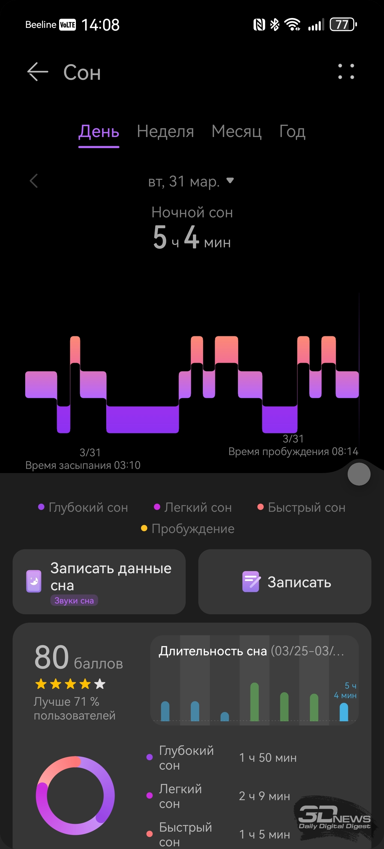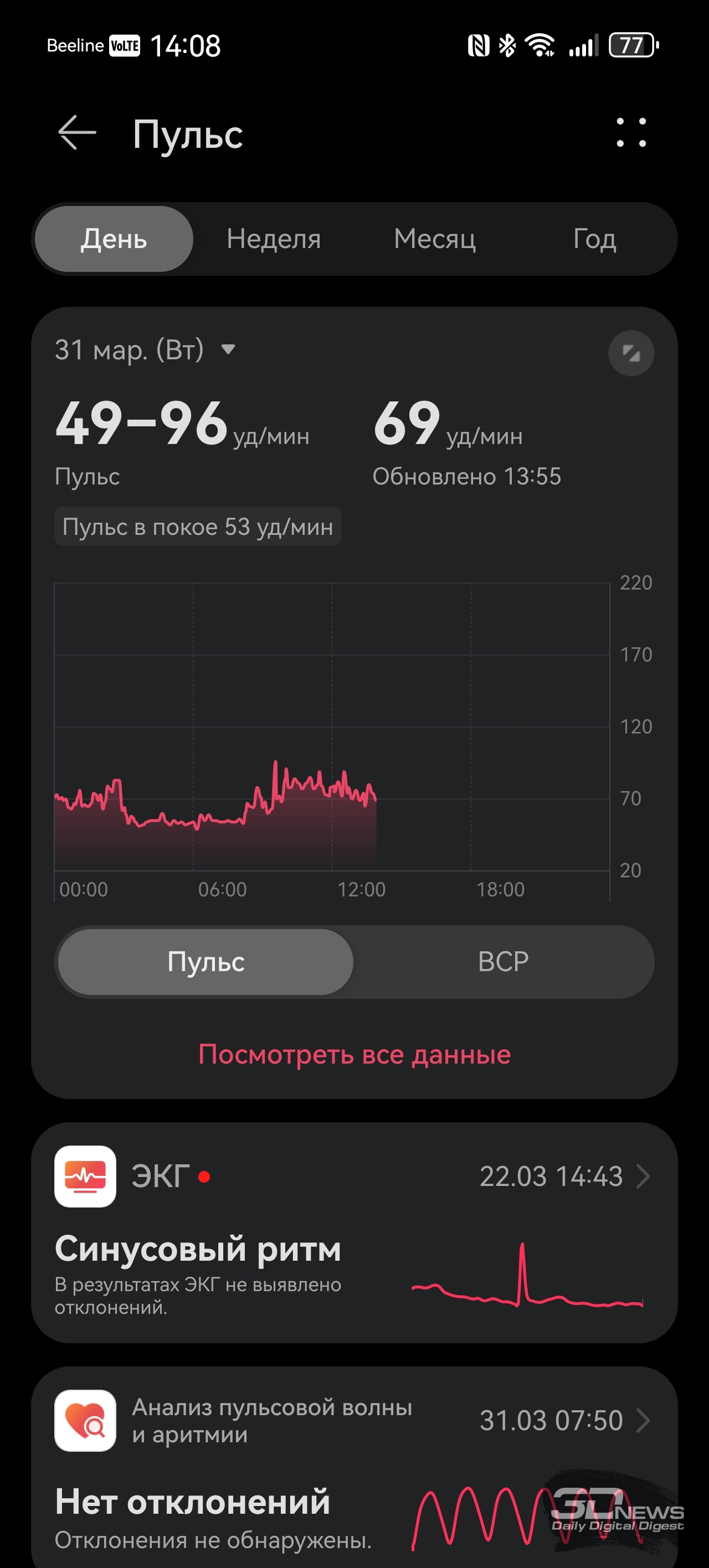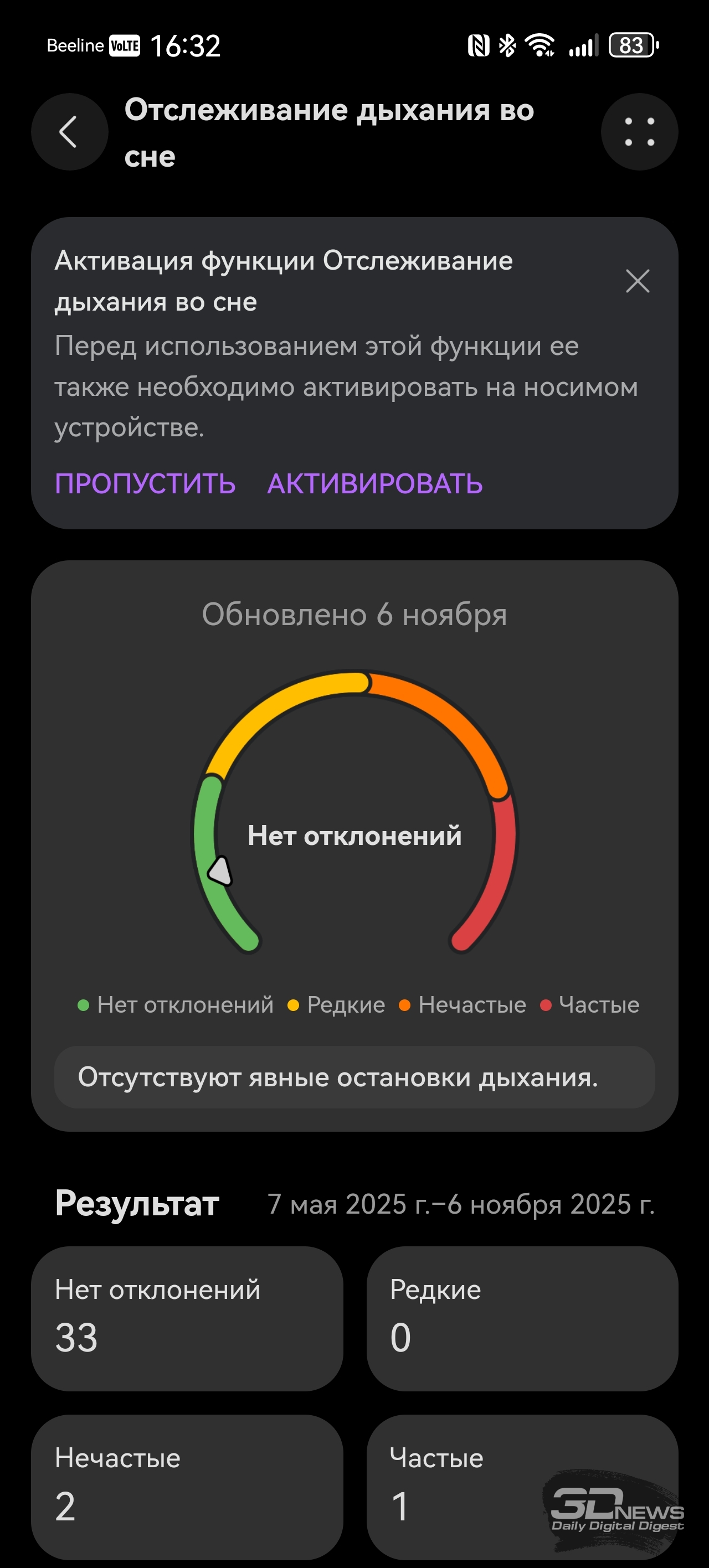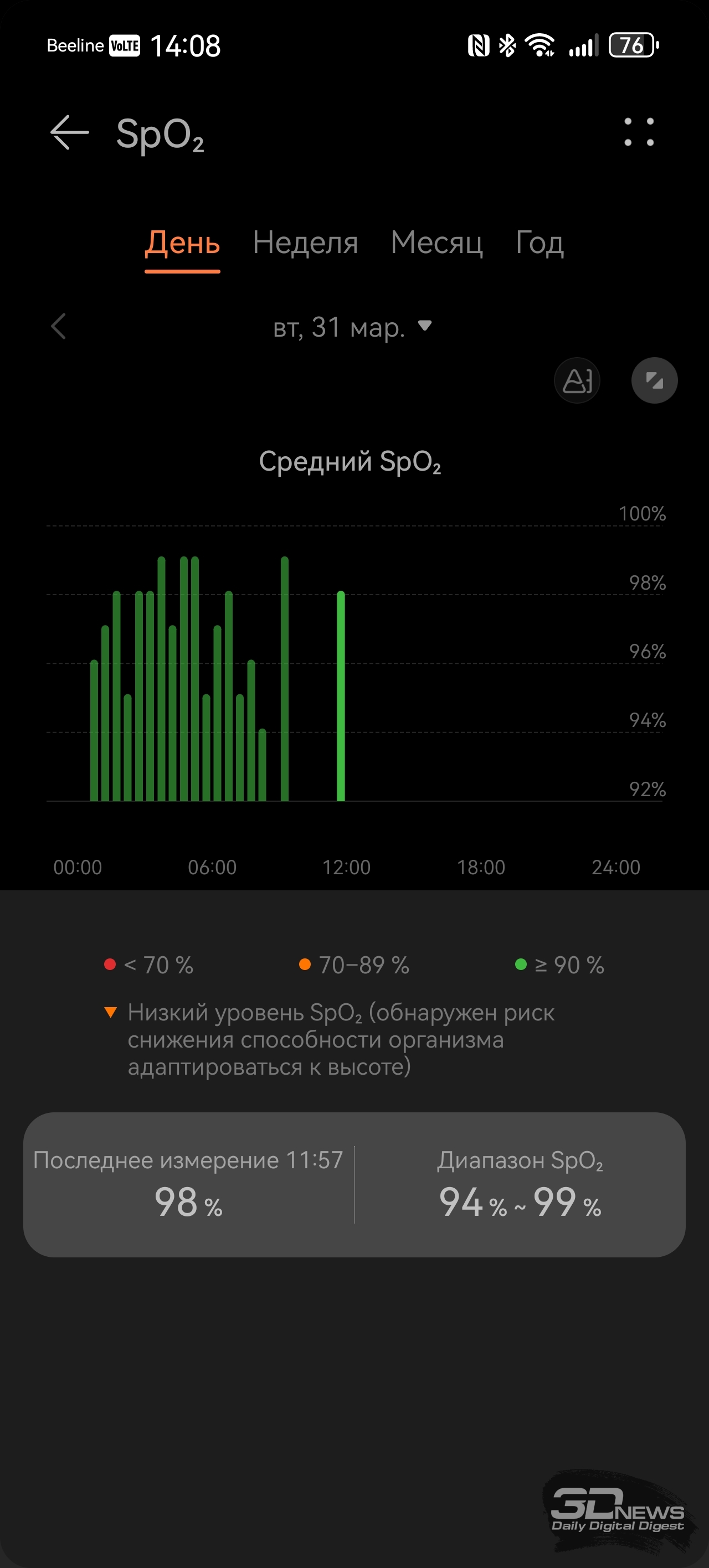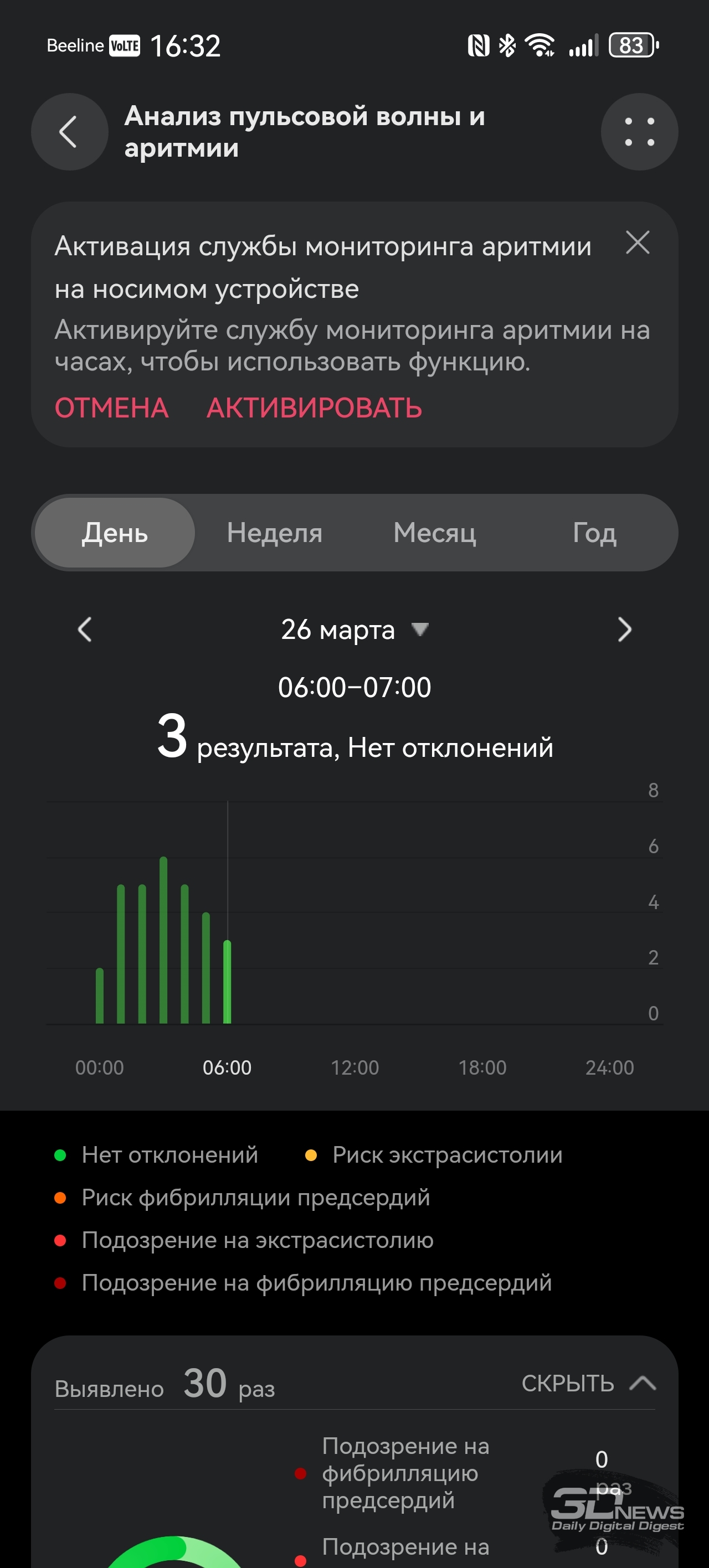 Со смартфоном браслет соединяется при помощи Bluetooth (теперь — версии 6.0), требуется приложение Huawei Health, предустановленное на гаджеты Huawei и доступное в AppStore для iOS. На Android-же устройства придется устанавливать это приложение при помощи apk-файла. Функциональное и простое в оформлении, оно применяется для работы со всеми носимыми устройствами бренда — с его помощью можно отслеживать поступающие данные о здоровье, менять циферблаты и так далее. Есть даже встроенный в приложение виртуальный инструктор по бегу, задействующий для тренировок нейросети, конечно же. Теперь же поговорим о функциональности HUAWEI Band 11 Pro – браслету есть чем удивить и по сравнению с конкурентами, и по сравнению с предшественниками. «База», скажем так, тут обыкновенная: как и любой современный фитнес-браслет, HUAWEI Band 11 Pro умеет считать пульс, шаги, сон, уровень кислорода в крови, записывать данные о тренировках; этот список дополняет возможность измерять уровень стресса и предлагать дыхательные упражнения, если у вас с этим перегрузка. Если вы засиделись, браслет вибрирует и предлагает подвигаться. HUAWEI Band 11 Pro Но в Band 11 Pro добавлено несколько возможностей, которые мы на подобных устройствах просто не ожидаем увидеть. Если анализ пульсовой волны на предмет возможной аритмии мы наблюдали еще на HUAWEI Band 9, а улучшенный мониторинг сна — исключительно программное улучшение (и отслеживать дыхание браслет не умеет — микрофон отсутствует), то встроенный GPS для браслета — редкость. Причем Huawei обещает высокую точность позиционирования благодаря использованию специального чипа. В теории на пробежку брать с собой смартфон не обязательно — как минимум для записи трека он здесь не нужен. С обязанностями устройства-компаньона HUAWEI Band 11 Pro также справляется вполне уверенно: уведомления и звонки браслет принимает быстро и корректно, но ответить на звонок при помощи браслета нельзя – повторюсь, тут нет микрофона, отсутствует и динамик. Заявлено, что HUAWEI Band 11 Pro может проработать до двух недель, но, как и в случае с любыми часами/браслетами, тут все индивидуально — зависит от того, постоянно ли вы измеряете свои данные (пульс, кислород и так далее), насколько часто тренируетесь. У меня Band 11 Pro успешно «жил» полторы недели. Заряжается браслет за 45 минут. Несмотря на свои весьма серьезные возможности, HUAWEI Band 11 Pro относится к бюджетному сегменту устройств — на старте браслет стоит 4 999 рублей (при цене на базовый HUAWEI Band 11 – 3 999 рублей).