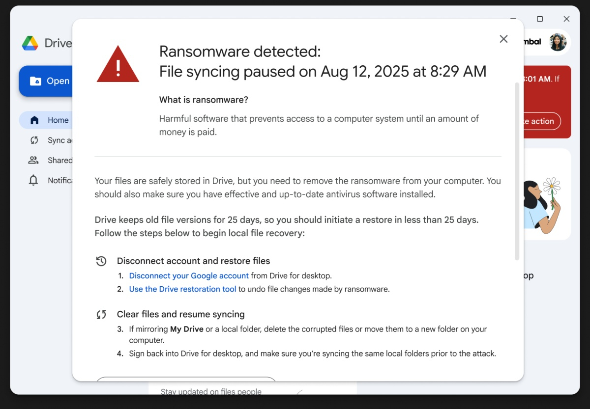 Если на ПК установлена ​​настольная версия «Google Диска», приложение автоматически приостановит синхронизацию файлов в облаке, как только обнаружит программу-вымогатель. Обычные пользователи увидят предупреждение о программе-вымогателе и инструкции с дальнейшими действиями, ИТ-администраторы также получат уведомление по электронной почте.