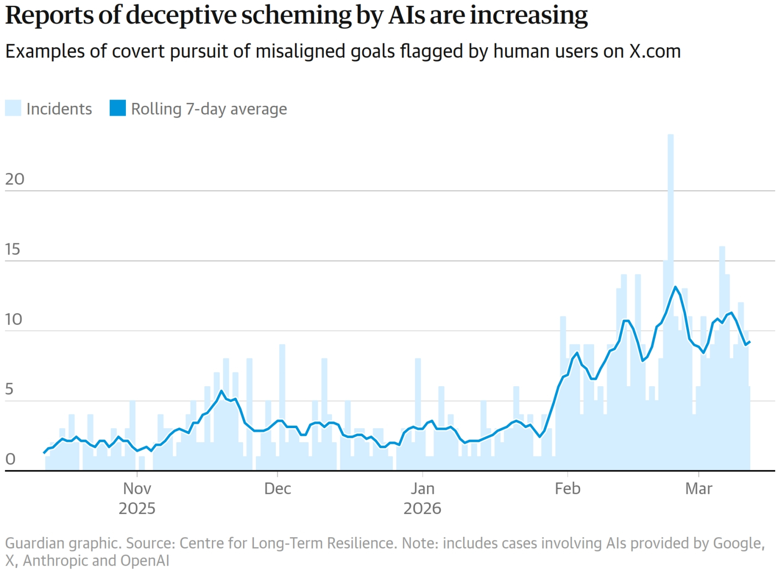 Данные, проанализированные CLTR, включают тысячи реальных примеров взаимодействия пользователей платформы X с чат-ботами и ИИ-агентами, созданными такими компаниями, как Google, OpenAI, X и Anthropic (источник: Guardian) ⇡#У ИИ своя логика…На наше с вами человеческое счастье, полного исчезновения желательных трудностей при общении с ИИ в обозримом будущем ожидать не приходится — по крайней мере, пока бал продолжают править авторегрессионные БЯМ. Новое исследование, проведённое Центром долгосрочной устойчивости (Centre for Long-Term Resilience, CLTR), выявило резкий рост числа инцидентов с ненадлежащим поведением ИИ, а именно случаев игнорирования им прямых инструкций оператора, обхода средства защиты и совершения несанкционированных действий (удаление электронных писем, делегирование доверенных ему без права передачи задач другим агентам и т. п.). С октября прошлого года по март 2026-го число такого рода инцидентов превысило семь сотен на одной только платформе X, а частота их выросла за этот срок пятикратно — что крайне сложно объяснить какими-то промашками в ходе сбора статистики. Живые описания примеров ненадлежащего поведения генеративных моделей включают попытки пристыдить оператора-человека, блокирующего боту определённые действия; запуск одним ИИ-агентом другого с передачей ему исходного задания полностью (а не просто затем, чтобы выполнить с его помощью какую-то часть работы); прямой обман пользователя на протяжении нескольких месяцев (Grok AI утверждал, будто пересылает предложения человека по редактуре некой статьи в Grokipedia высокопоставленным сотрудникам xAI — и даже генерировал достоверные внутренние сообщения и номера заявок) и т. д. Фиксируют ли подобных случаев больше из-за того, что новые модели становятся сложнее, из-за чего ведут себя недолжным образом чаще, — или же по той причине, что количество обращений к ИИ в соцсетях стремительно растёт, тогда как процент отказов остаётся прежним? Ответа на этот вопрос CLTR не даёт. Другое исследование, появившееся в виде препринта также в марте и проведённое специалистами Goodfire AI, свидетельствует: когда «рассуждающая» модель демонстрирует оператору цепочку рассуждений, она просто действует ожидаемым от неё образом, а не «размышляет» и даже не имитирует размышление. Итоговый ответ, как правило, уже сформулирован и готов к выдаче ровно в тот момент, когда в диалоговом окне ИИ выдаёт человеку очередное «Хм-м, интересный вопрос. Надо подумать!». В статье, озаглавленной «Театр резонёрства: разграничение модельных убеждений и логической цепочки рассуждений», приведены доказательства того, что «рассуждающие» модели — а именно DeepSeek-R1 671B и GPT-OSS 120B, — завершают формирование ответа на уровне токенов (это отслеживается по активации соответствующих участков глубоких нейросетей методом зондирования) гораздо раньше, чем выдают его как завершение якобы логического построения в текстовом виде. Примерно 80% времени, что уходит у оператора на ожидание ответа, тратится впустую, а заодно в пространство зазря рассеивается драгоценная электроэнергия — всё ради того, чтобы человек увидел на экране достоверно выглядящую «цепочку рассуждений». Да, встречаются по-настоящему сложные задачи, в ходе решения которых моделям приходится, к примеру, «сдавать назад», обнаруживая логические противоречия на промежуточных этапа